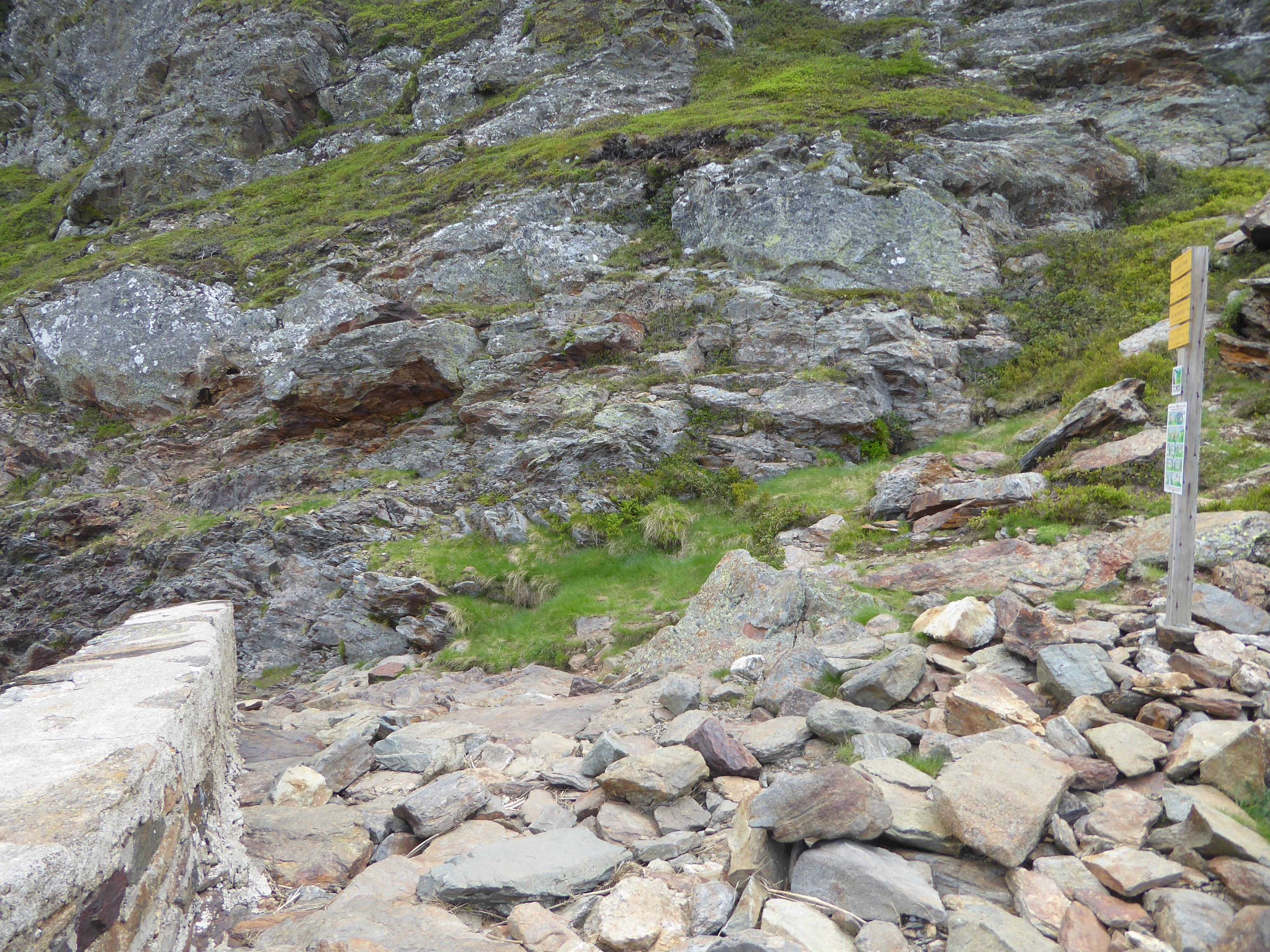 Lac Bleu (1968 m) : suivre le chemin partant sur la gauche et descendant le Vallon du Lhécou direction le Chiroulet, balisé en jaune