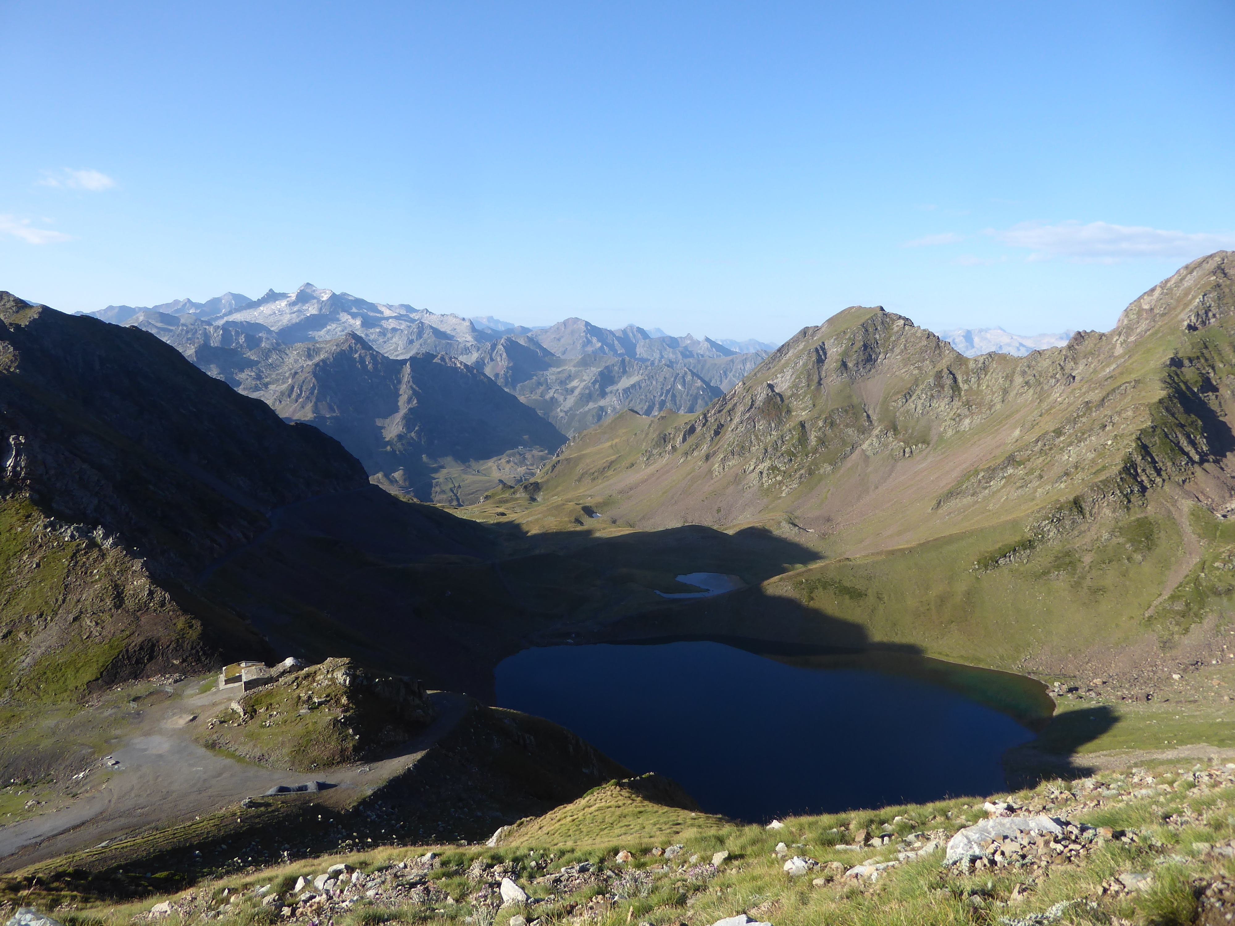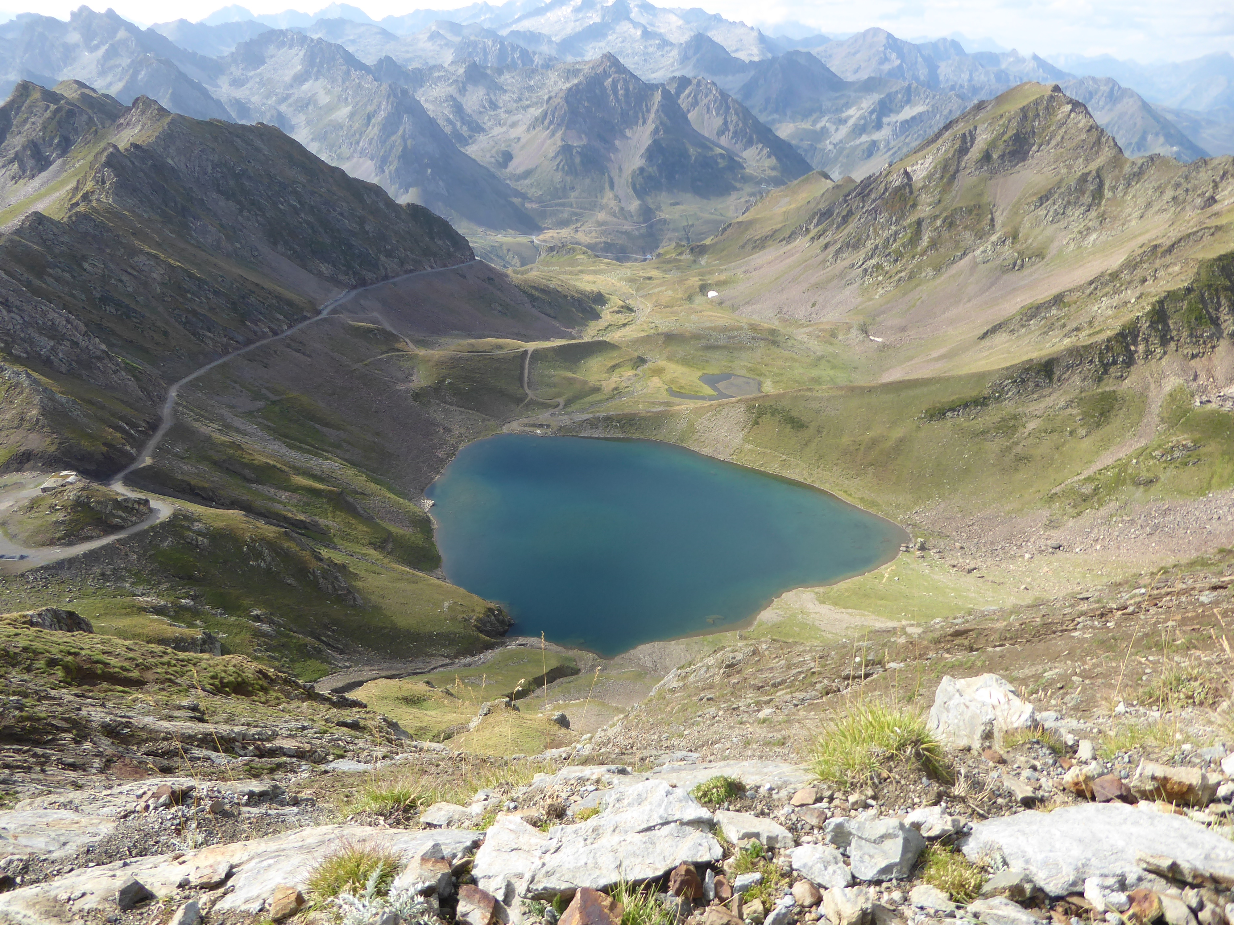 Belle vue plongeante sur le Lac d'Oncet et le chemin venant de la route du Tourmalet dont le départ se fait à proximité du Col du Tourmalet