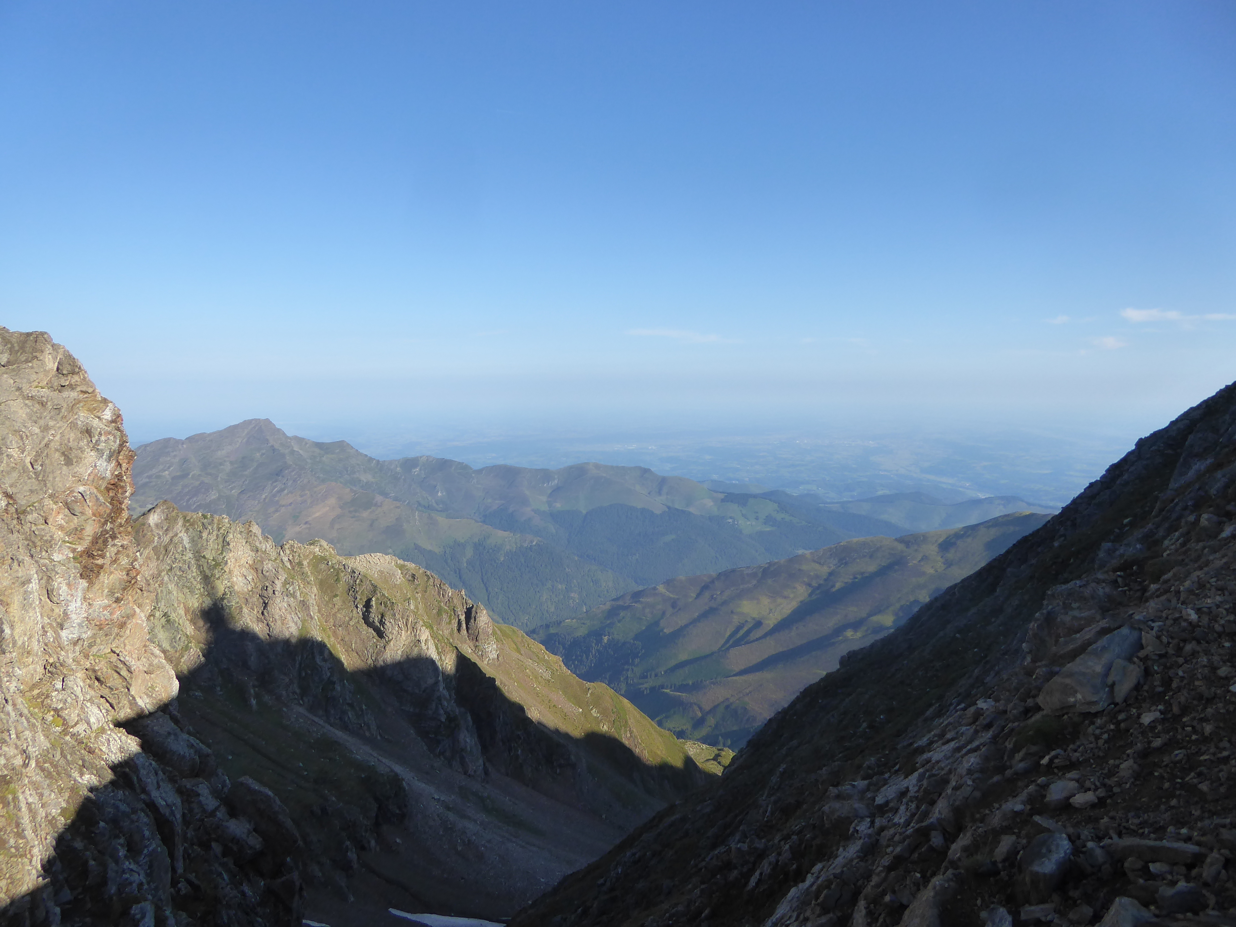 Belle vue sur la plaine depuis cette brèche ; on aperçoit la ville de Tarbes, l'aéroport de Tarbes-Lourdes-Pyrénées, une partie de la ville de Lourdes ainsi que la ville de Pau
