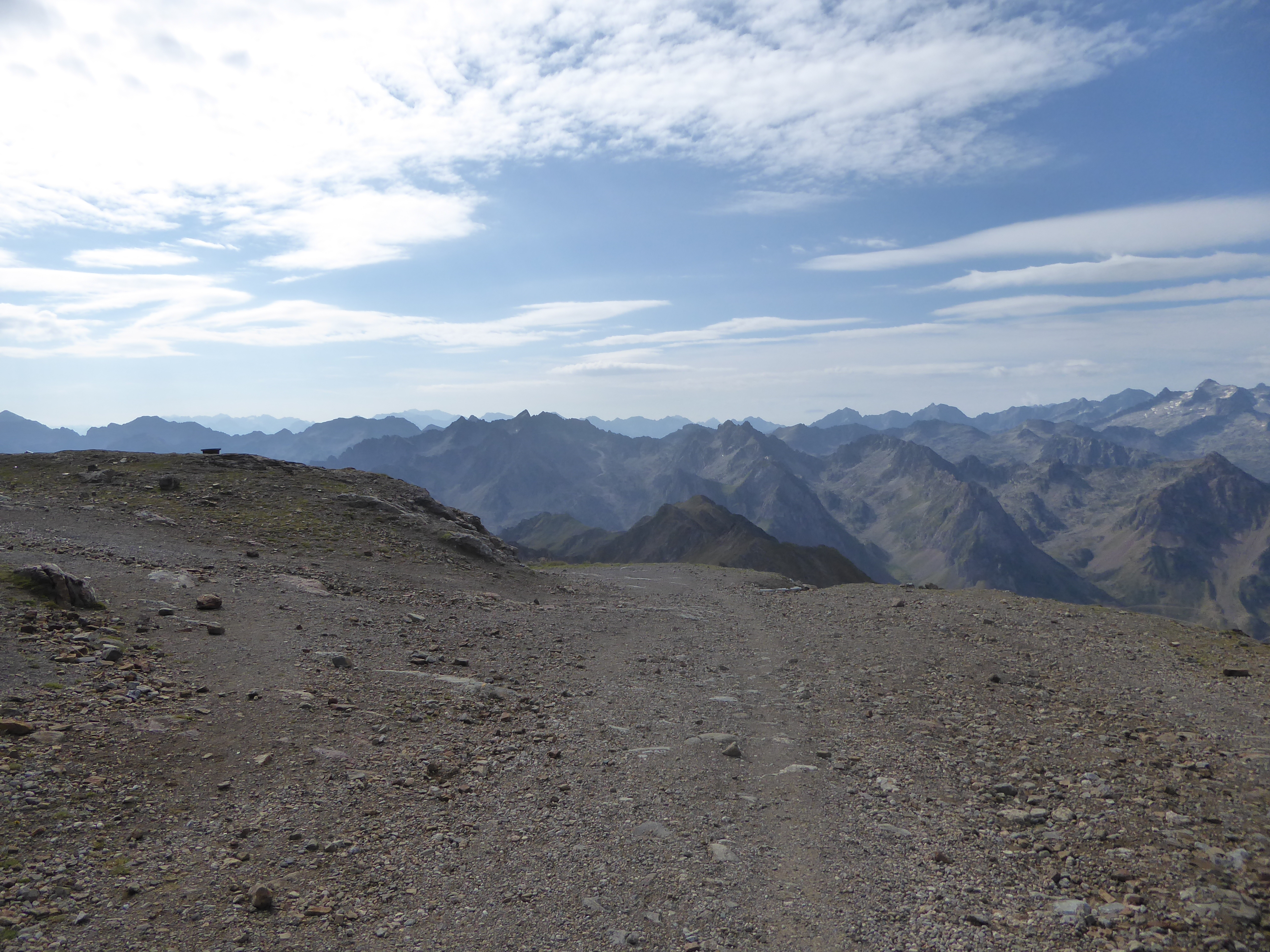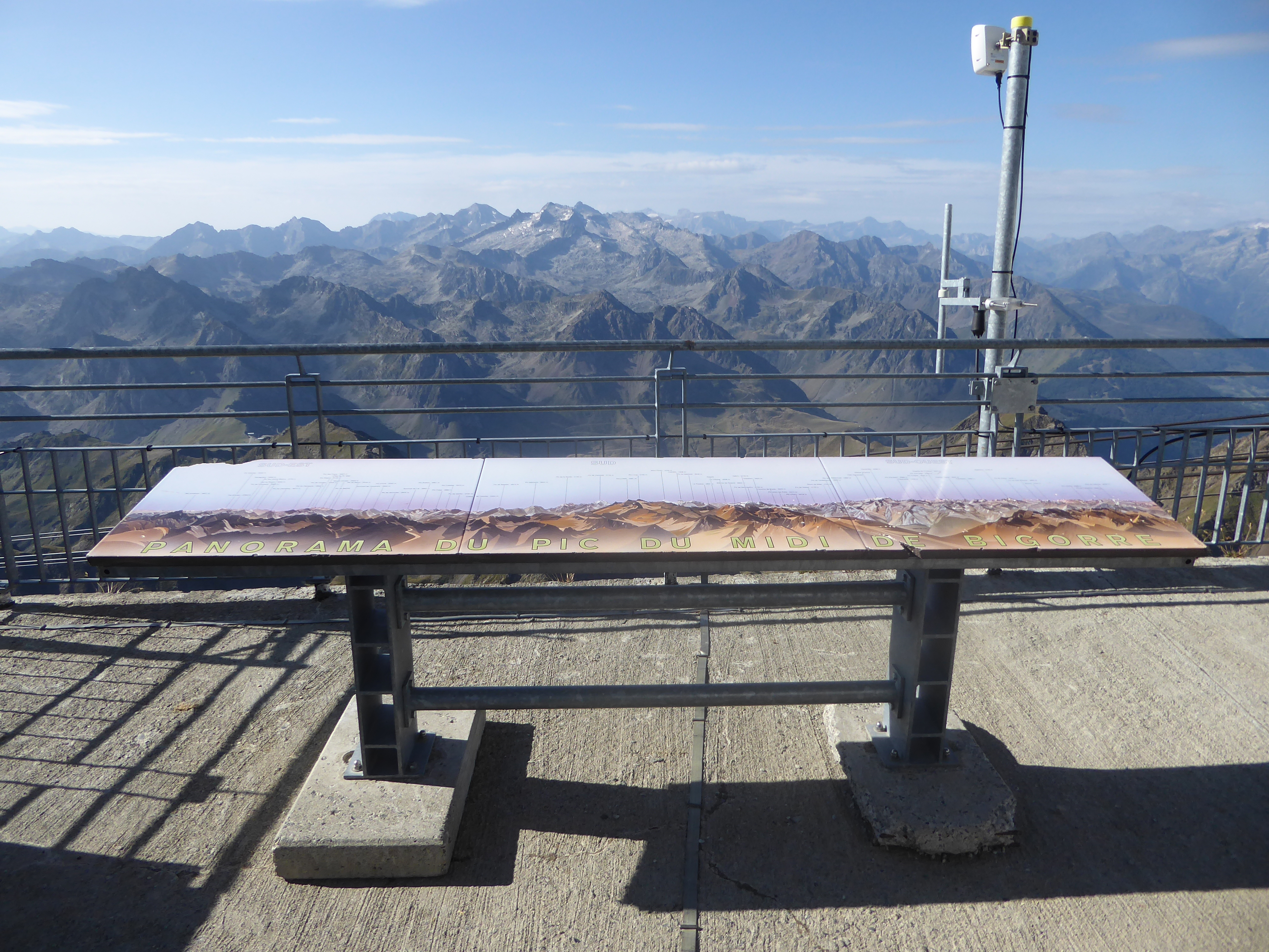 Arrivée au sommet du Pic du Midi de Bigorre (2877 m) : le panorama a été assemblé avec des photos provenant de plusieurs points de vue ; panorama d'ensemble sur les sommets du Luchonnais, du Néouvielle, du Cirque de Gavarnie, du Massif du Vignemale, du secteur d'Arrémoulit, de Col d'Aubisque et sur la plaine