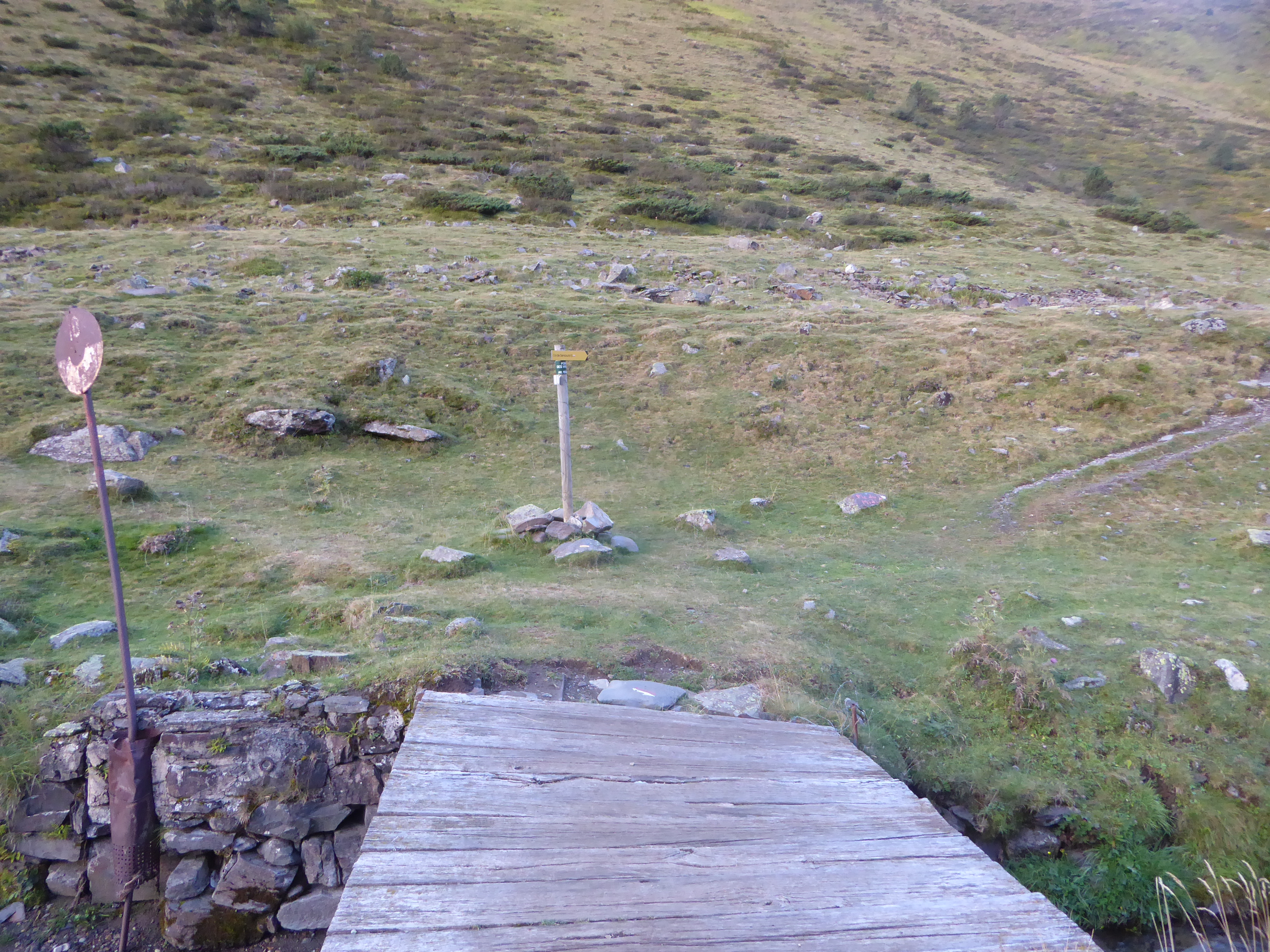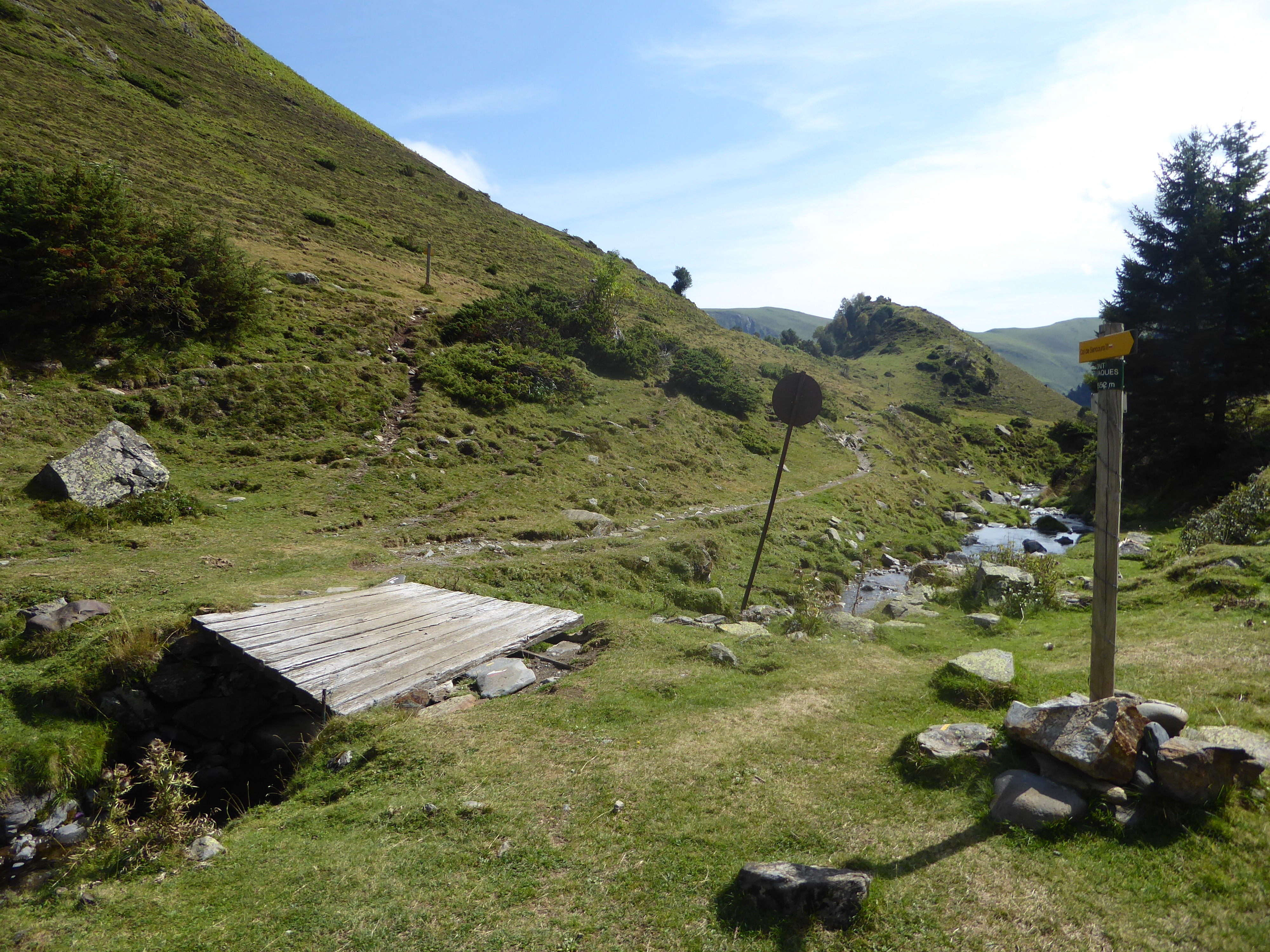Pont des Vasquès (1552 m) : suivre le chemin partant sur la droite puis obliquant sur la gauche direction Pic du Midi, balisé en rouge et blanc, et jaune (bien suivre les balises rouges et blanches pour emprunter le bon chemin)