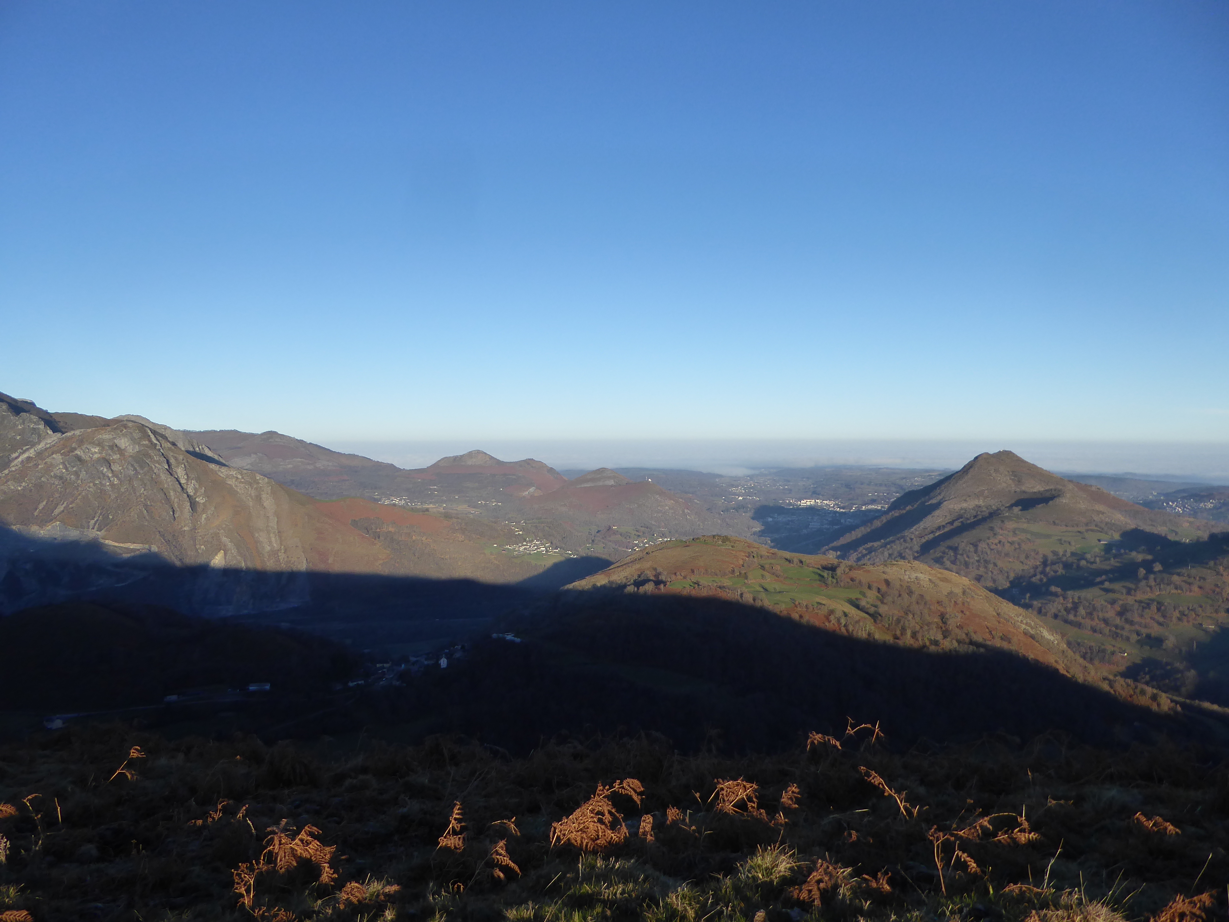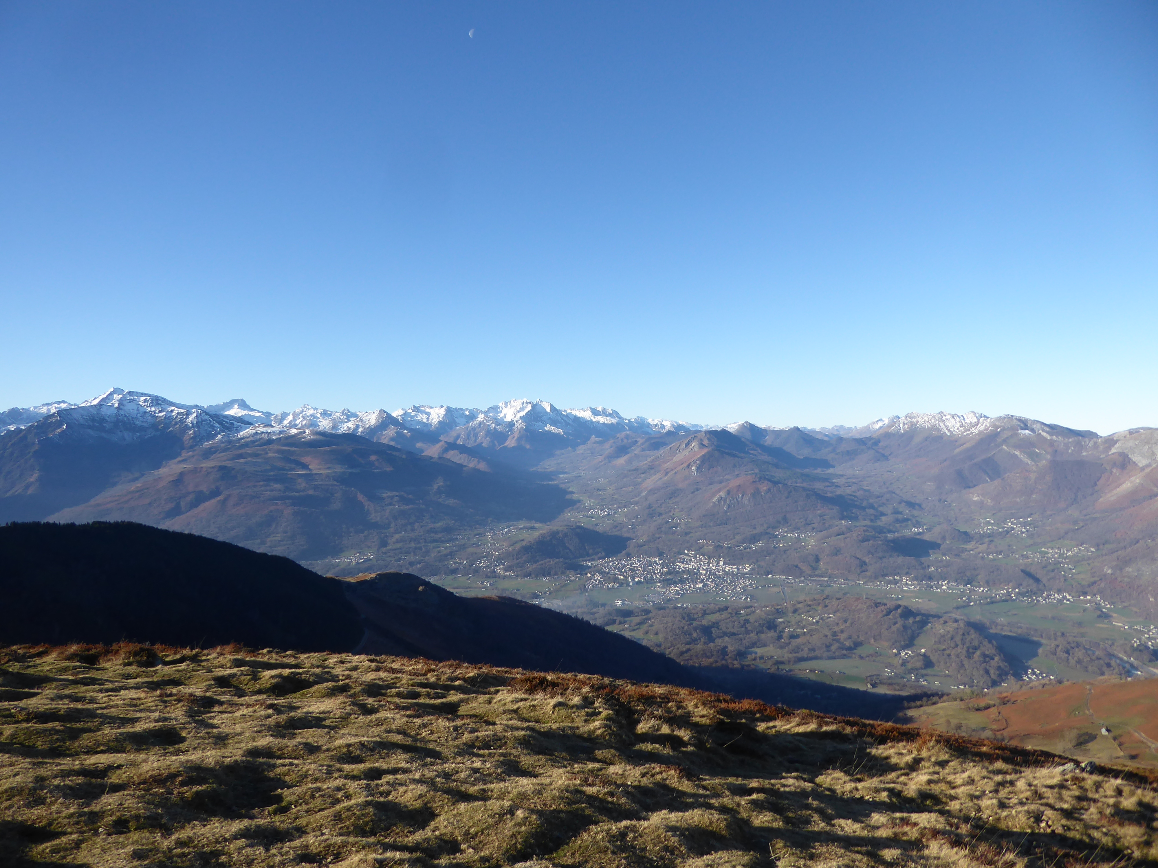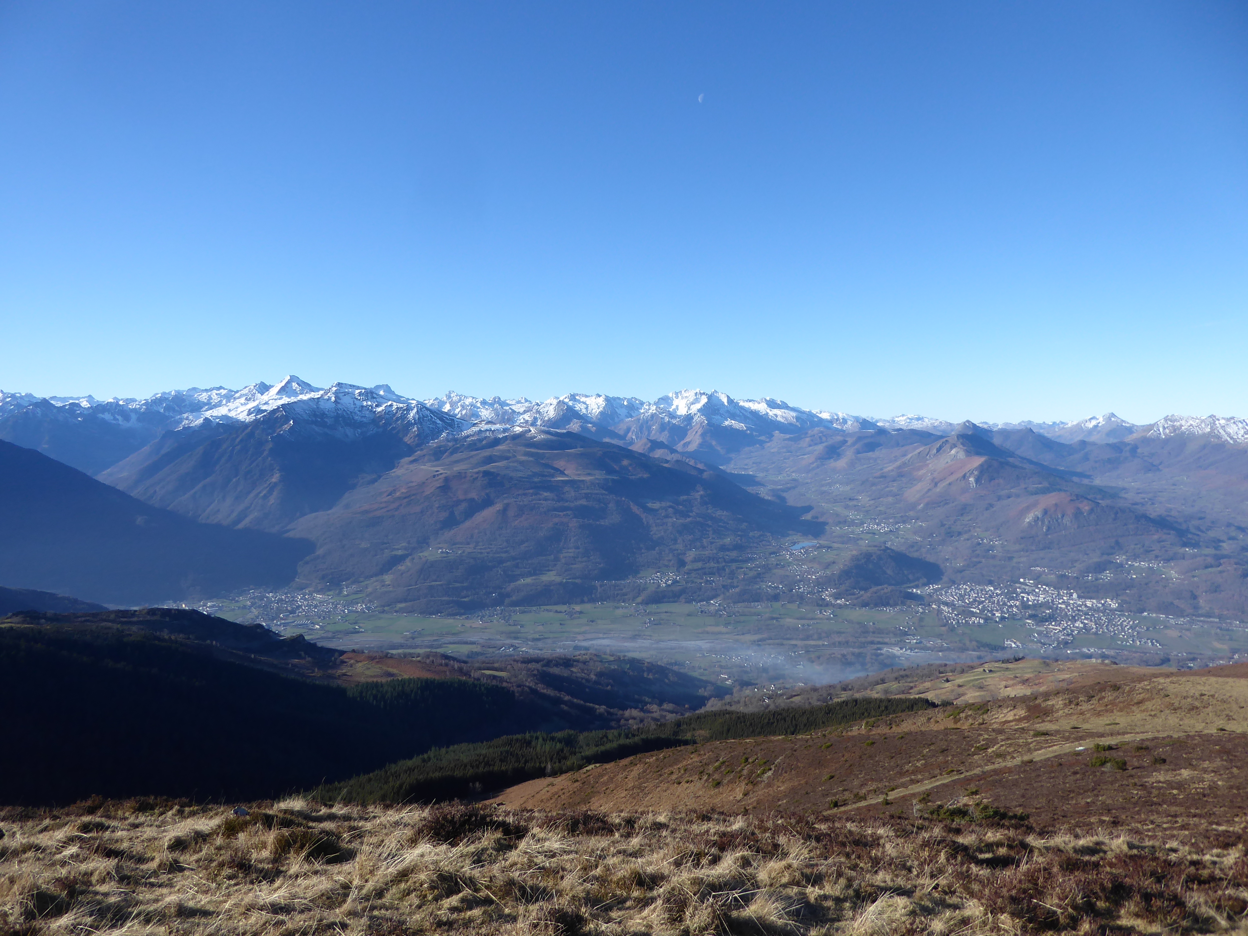 Arrivée au sommet du Soum de Trémou (956 m) : beau panorama sur la plaine ainsi que sur la crête d'Hautacam ... le Montaigu est également visible ainsi que le massif du Pibeste (panorama pris au retour)