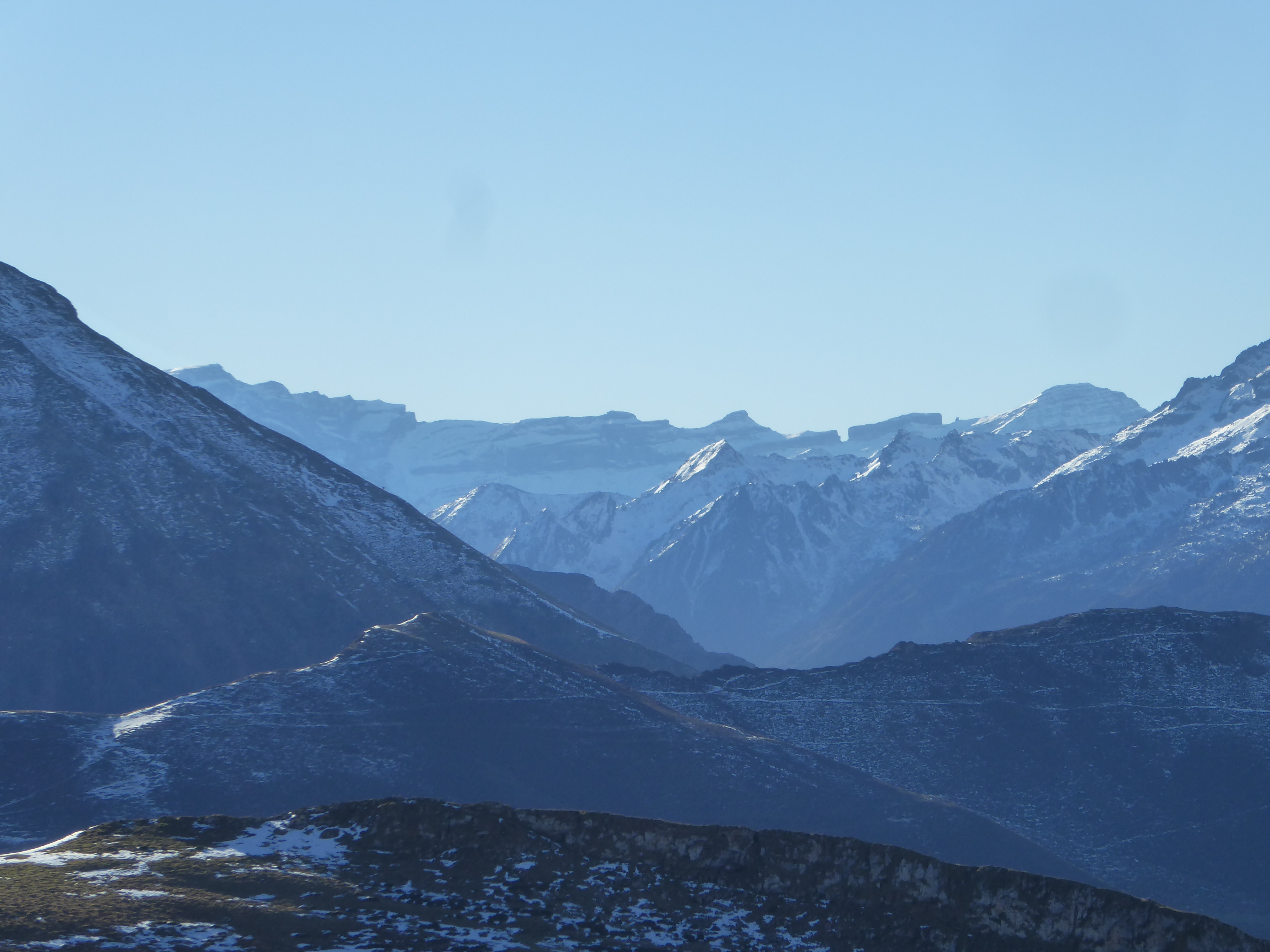 Arrivée au sommet du Soum des Lits (1407 m) : panorama semblable à celui du Rocher de la Boup ... partiellement masqué par la pointe cote 1566 m (panorama pris au retour)
