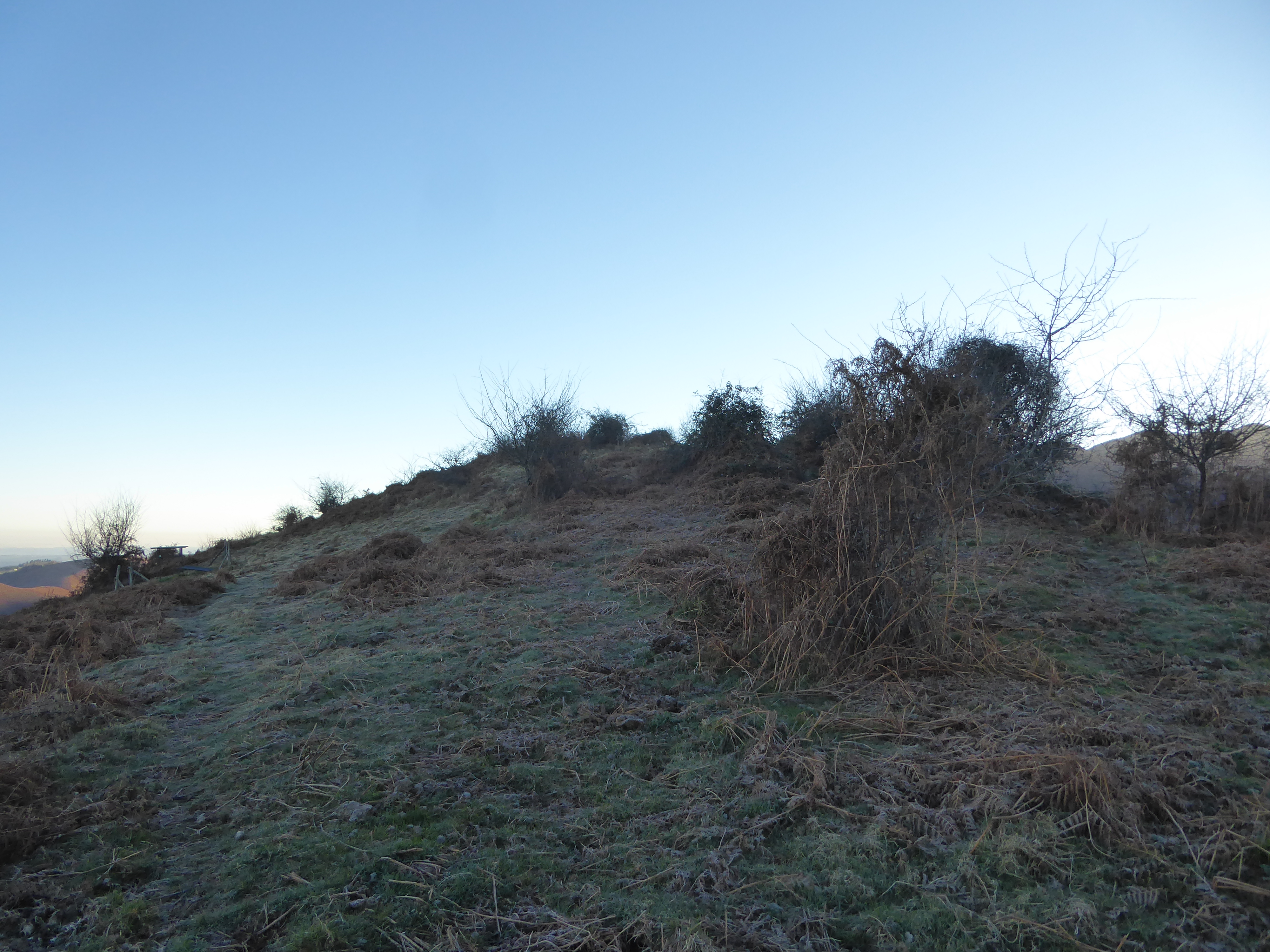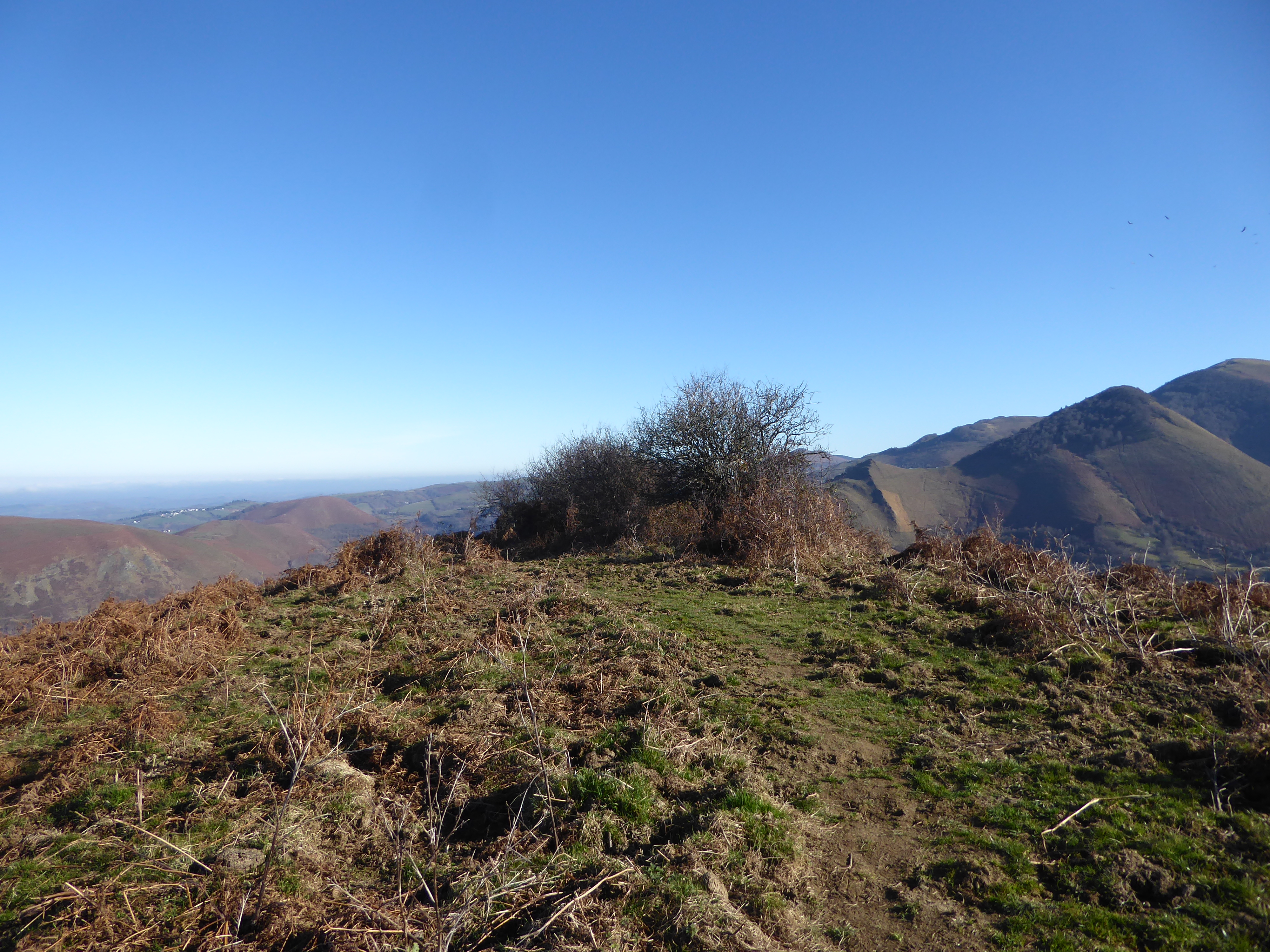 Crête d'Hautacam (940 m) : suivre le chemin partant tout droit et suivant la crête direction Soum des Trées (sommet marqué par l'amas de végétation sur la photo)