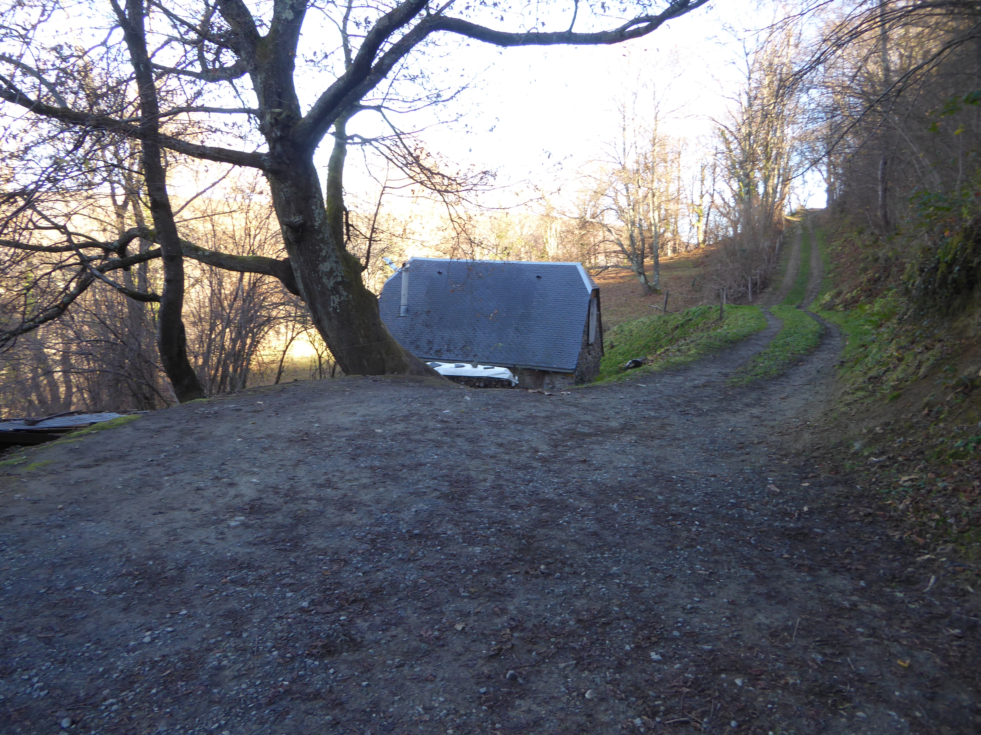 A ce croisement avec une piste (646 m), suivre le chemin descendant tout droit vers la cabane direction Ousté, balisé en jaune