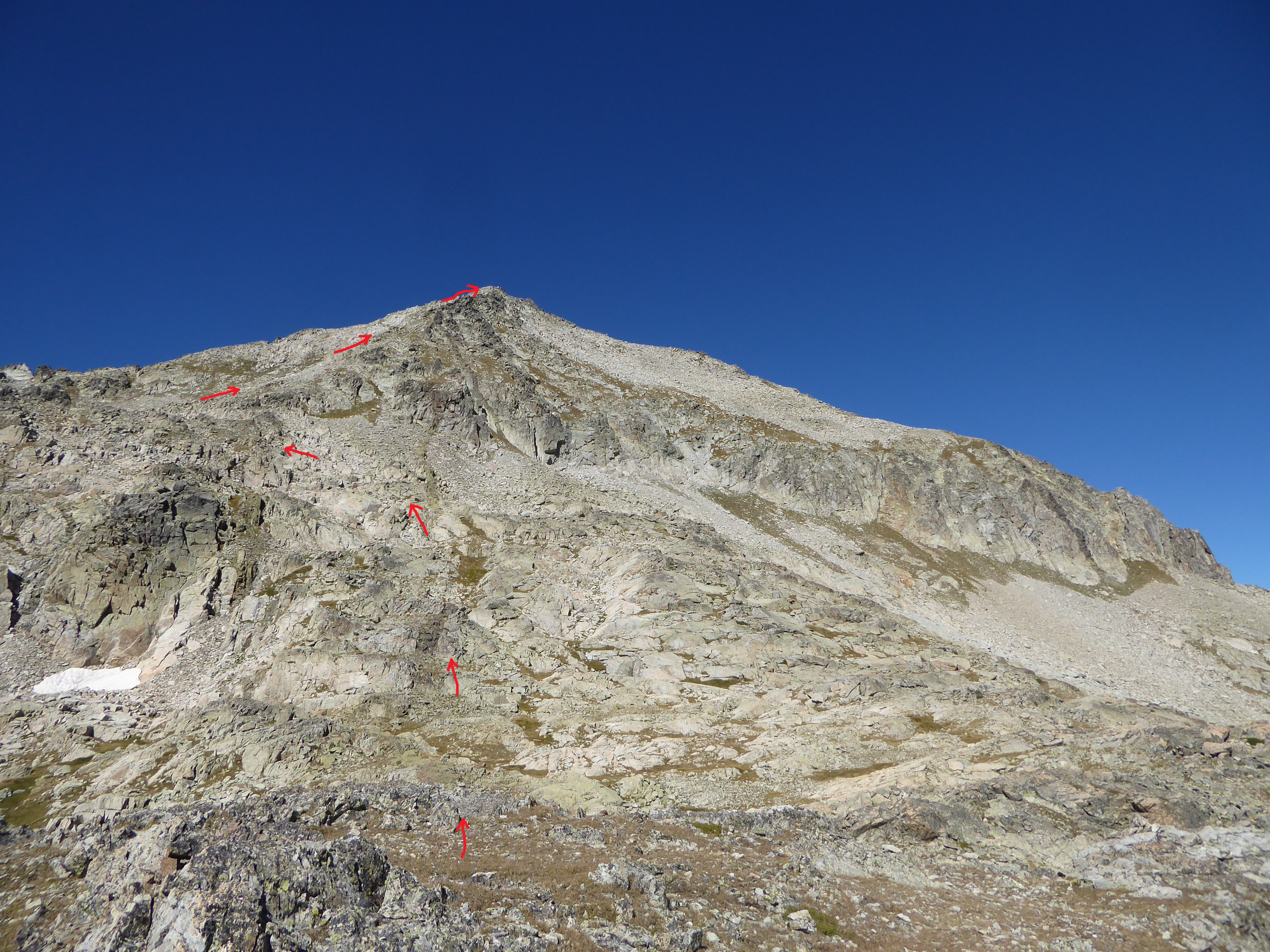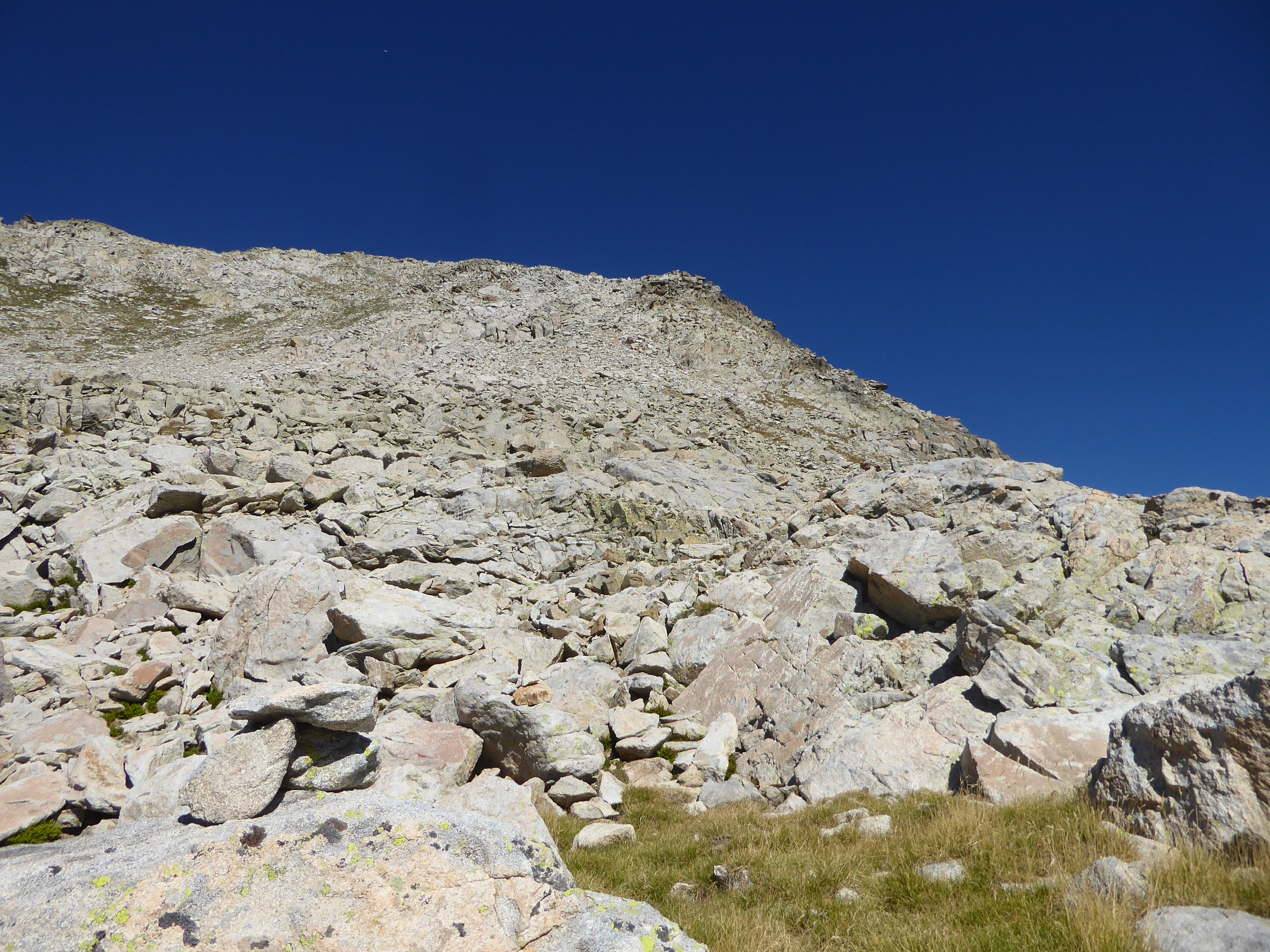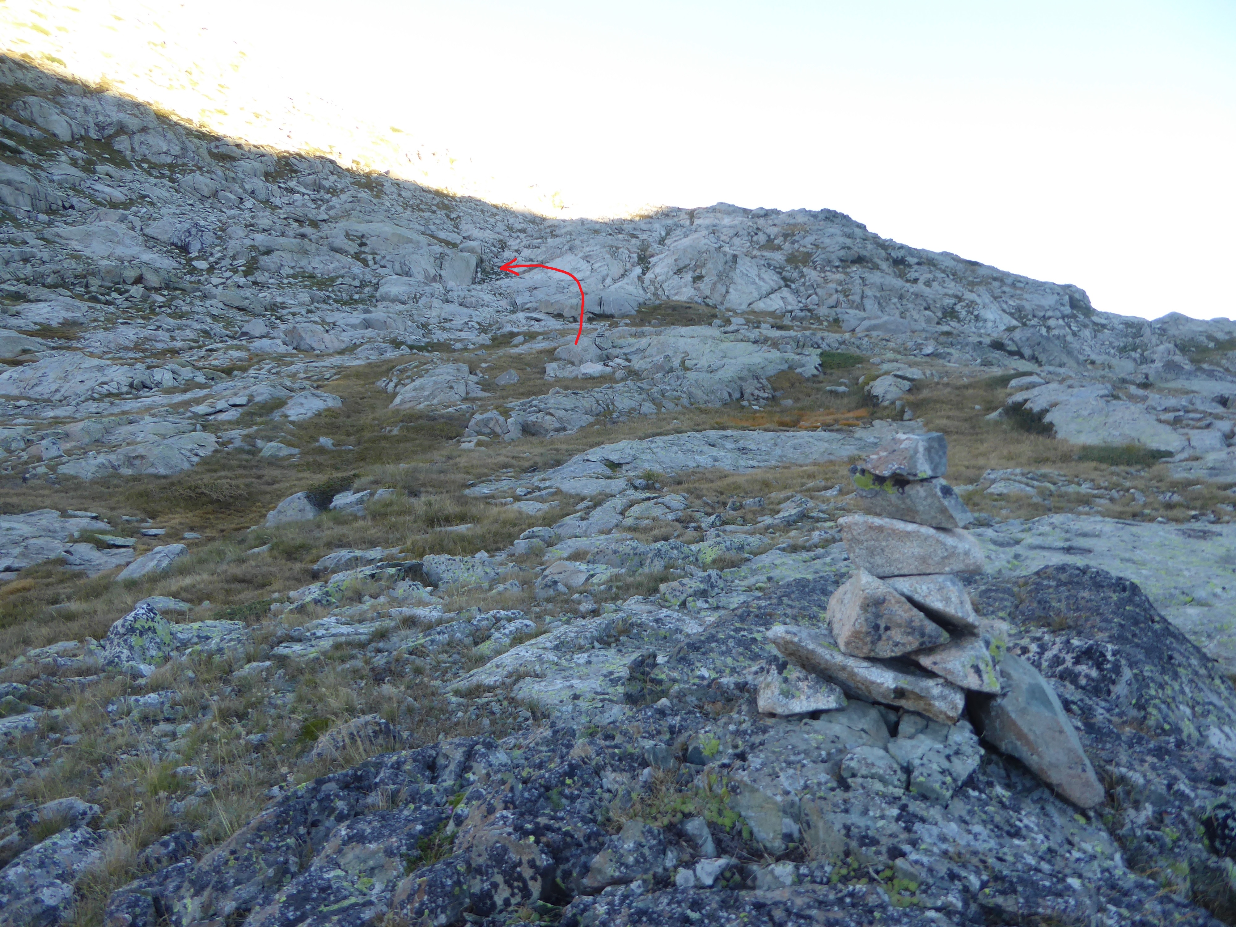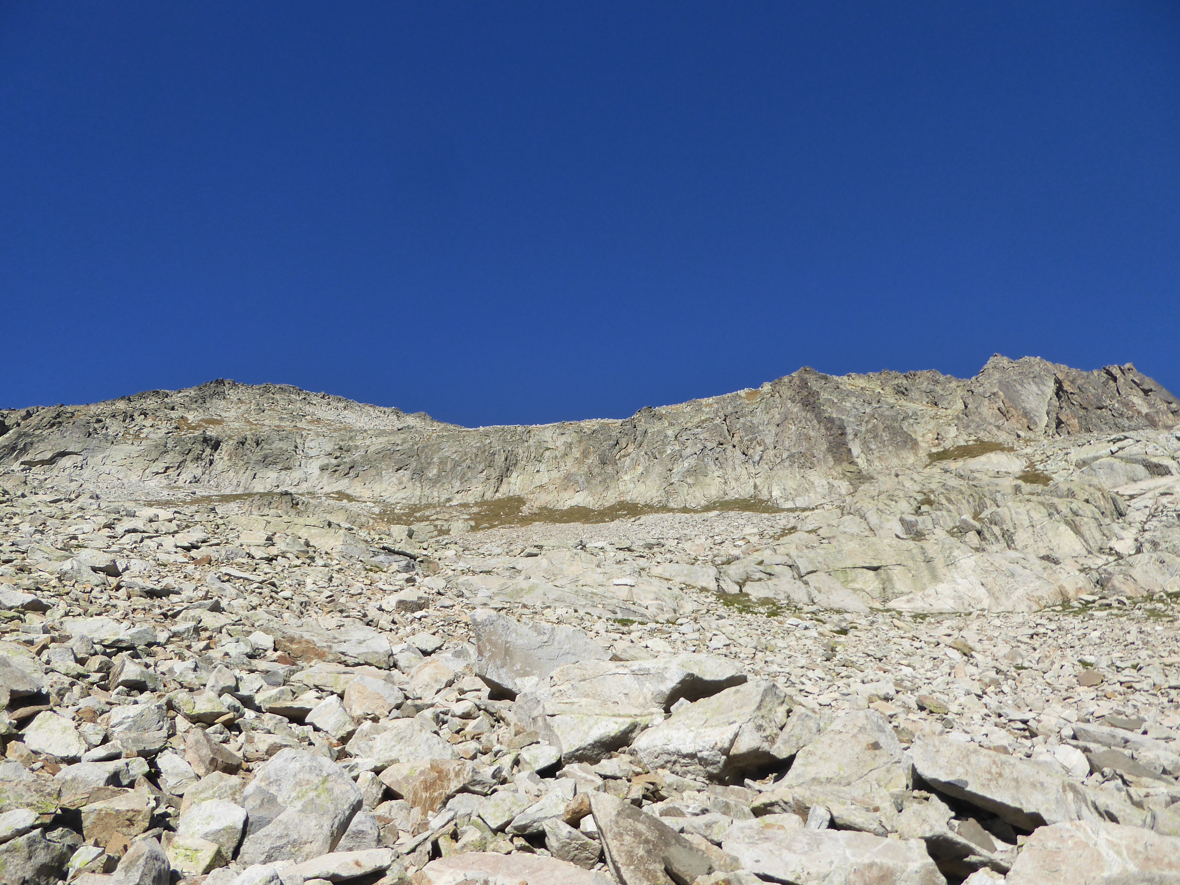 Si vous n'avez pas suivi les cairns partant sur la gauche, vous risquez de tomber nez à nez avec la barre rocheuse : il est possible de la franchir par un couloir raide d'une trentaine de mètres (je n'en garde pas un très bon souvenir) ... je vous conseille de contourner intégralement cette barre vers la gauche vers la ligne frontière afin de retrouver des éboulis (et des cairns si vous êtes allés bien à gauche) moins techniques à remonter ! Il doit exister des cairns qui contournent cette barre mais je ne les ai pas vus !
