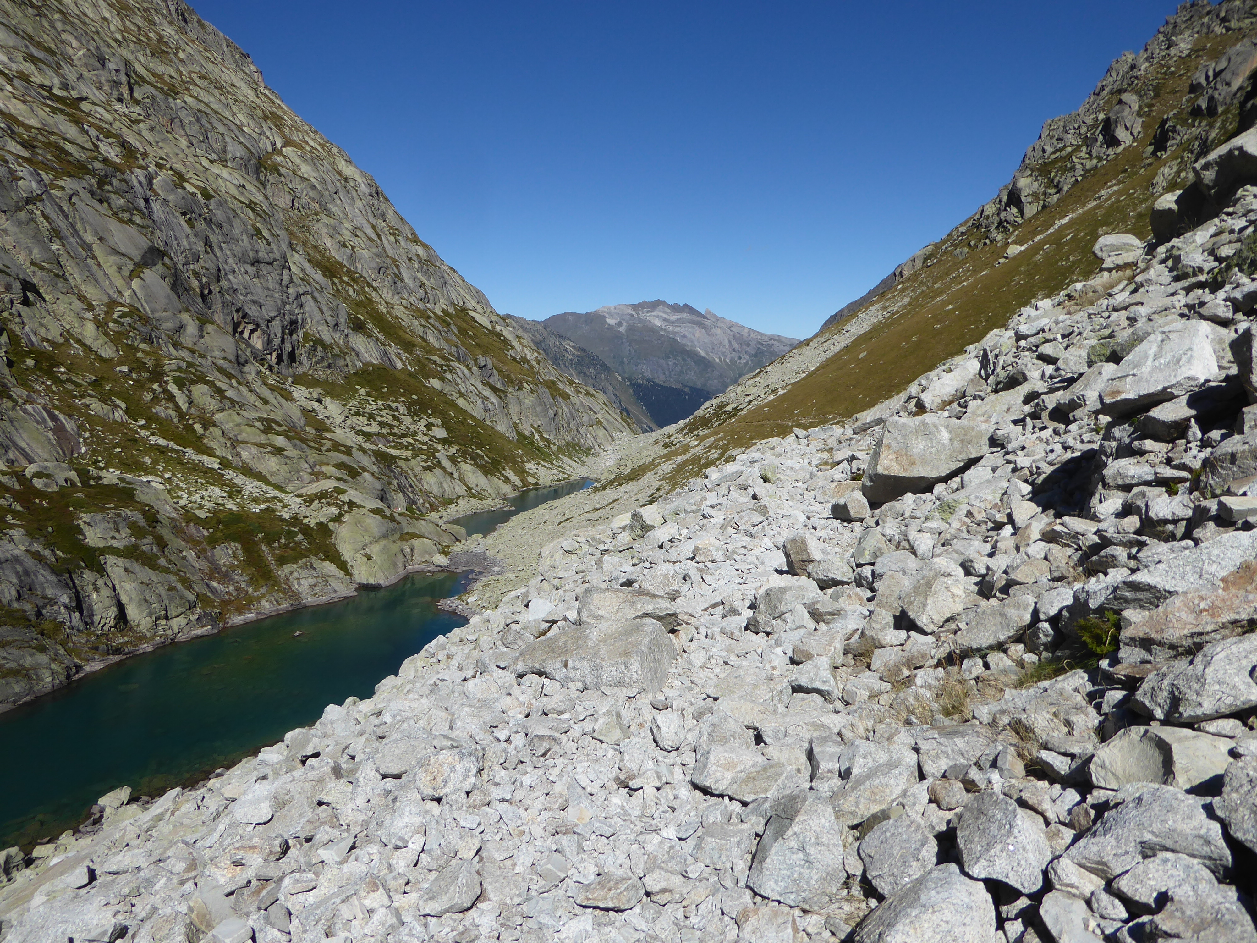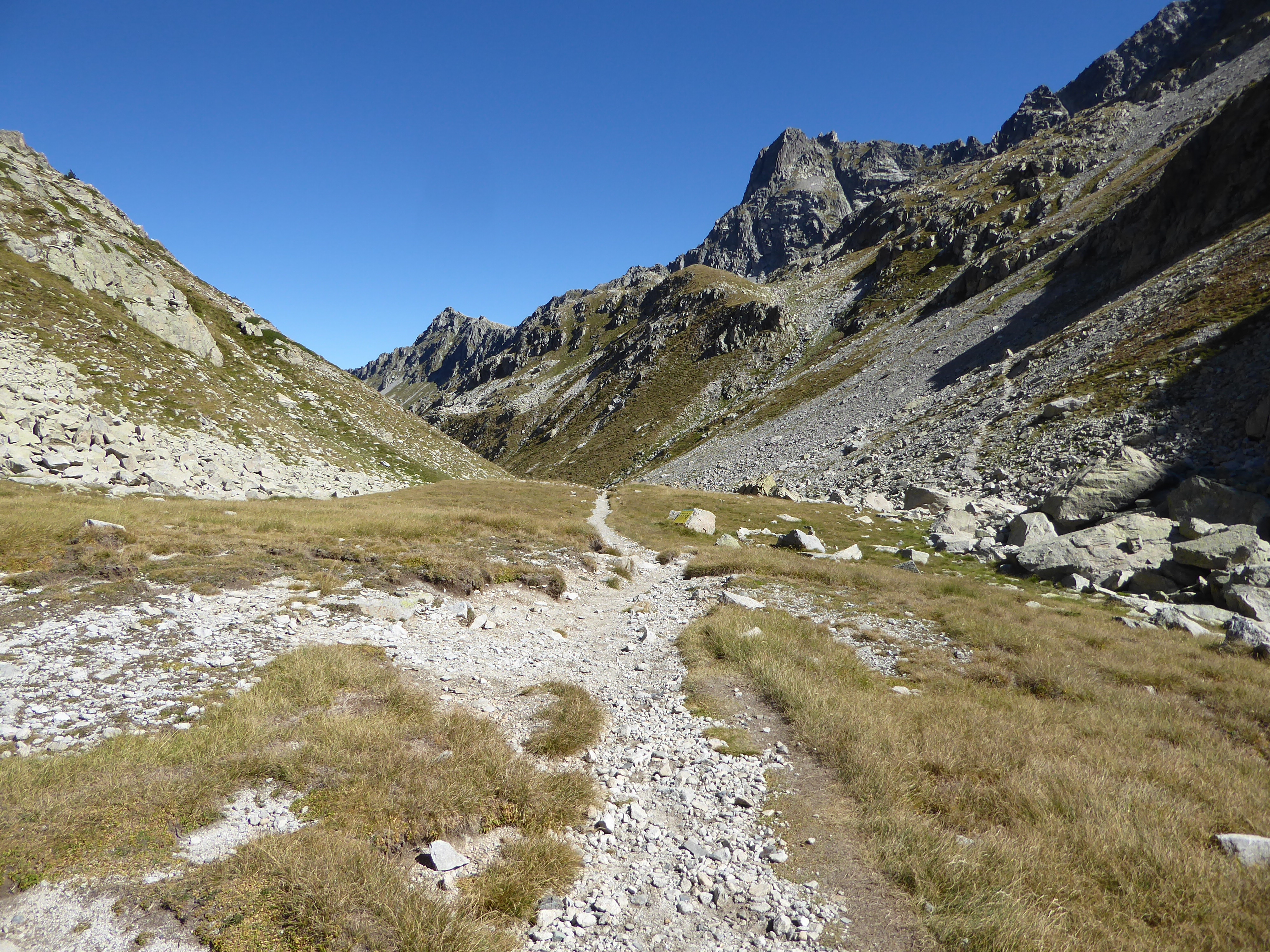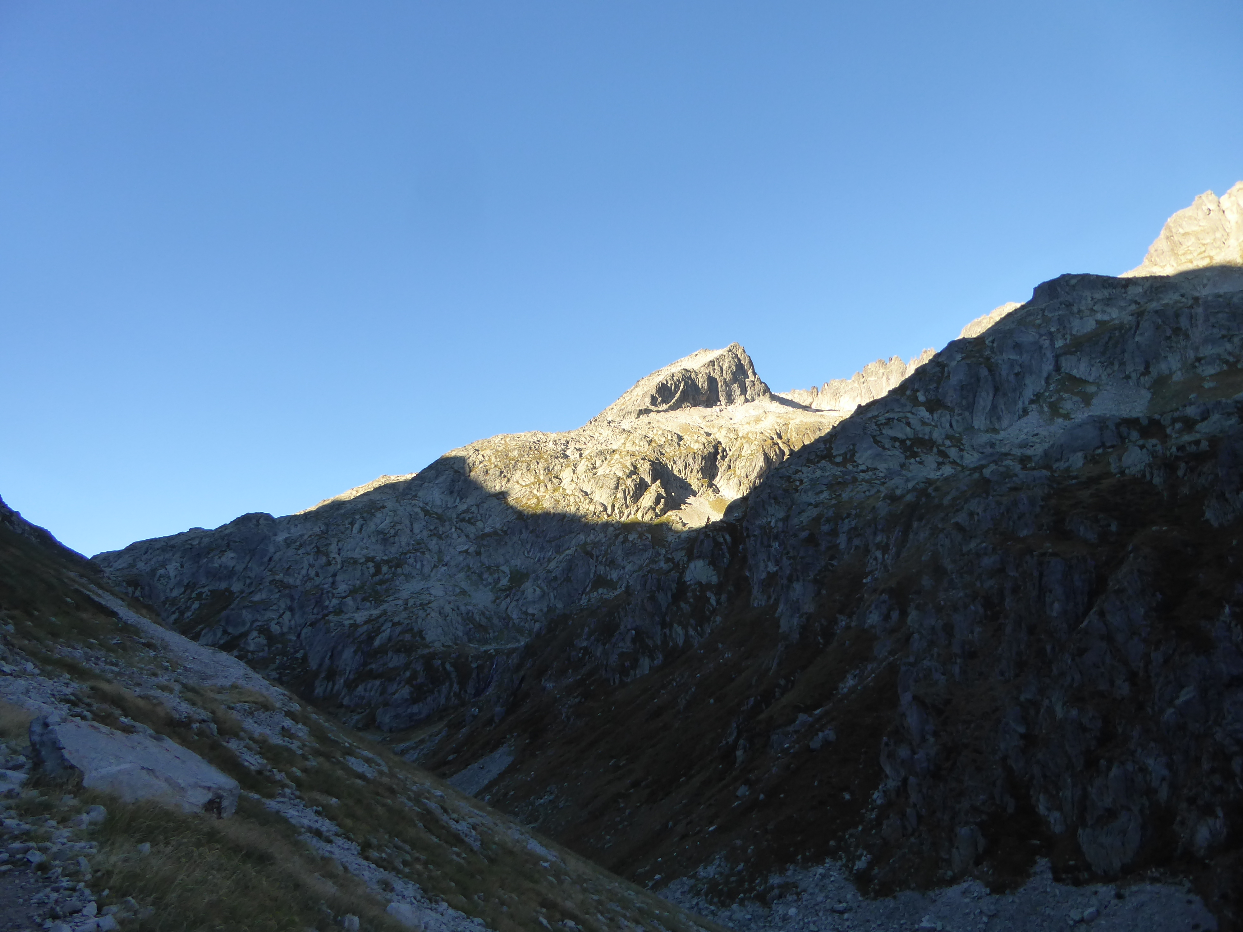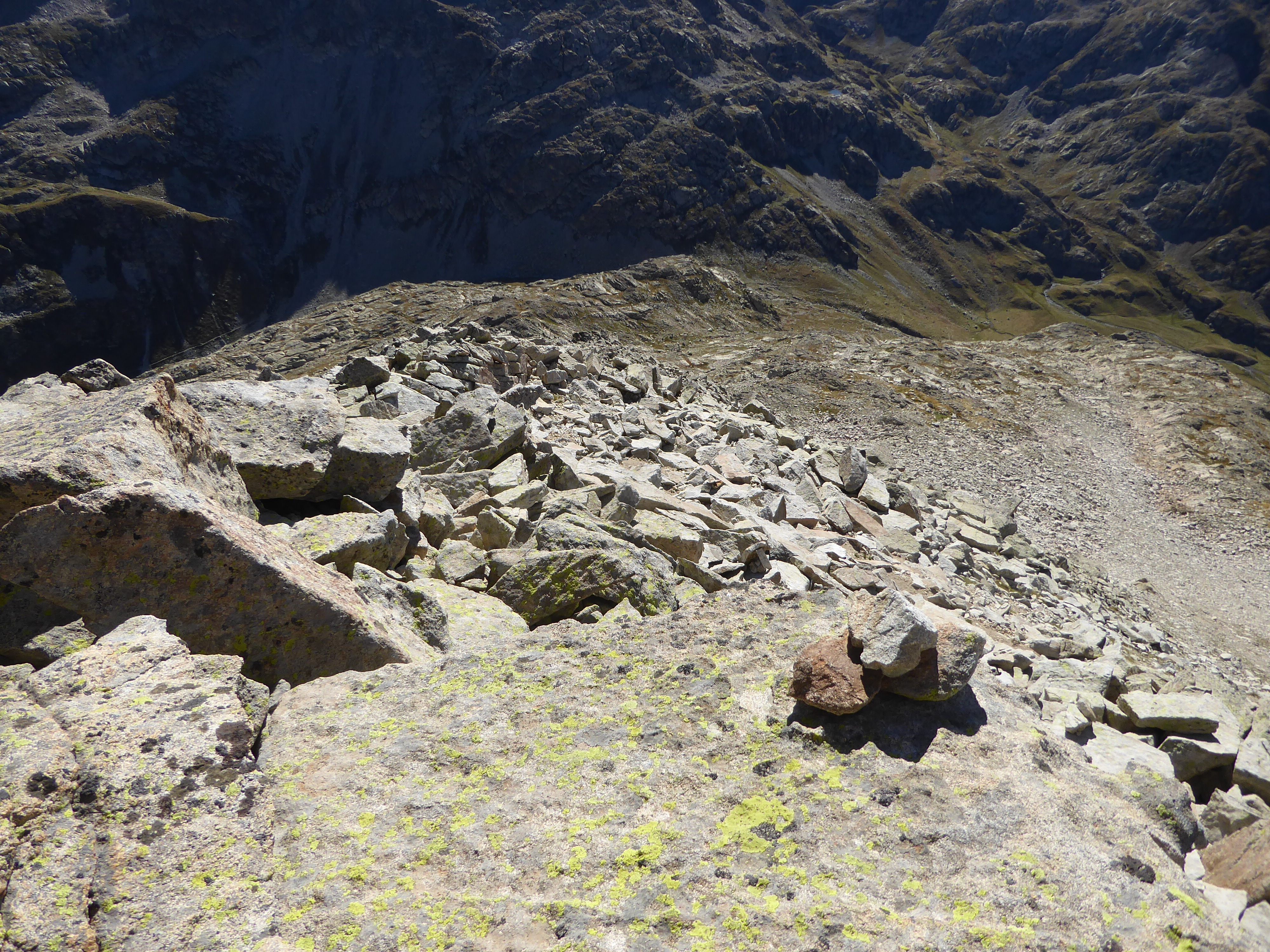Si vous n'avez pas suivi les cairns partant sur la gauche, vous risquez de tomber nez à nez avec la barre rocheuse : il est possible de la franchir par un couloir raide d'une trentaine de mètres (je n'en garde pas un très bon souvenir) ... je vous conseille de contourner intégralement cette barre vers la gauche vers la ligne frontière afin de retrouver des éboulis (et des cairns si vous êtes allés bien à gauche) moins techniques à remonter ! Il doit exister des cairns qui contournent cette barre mais je ne les ai pas vus !