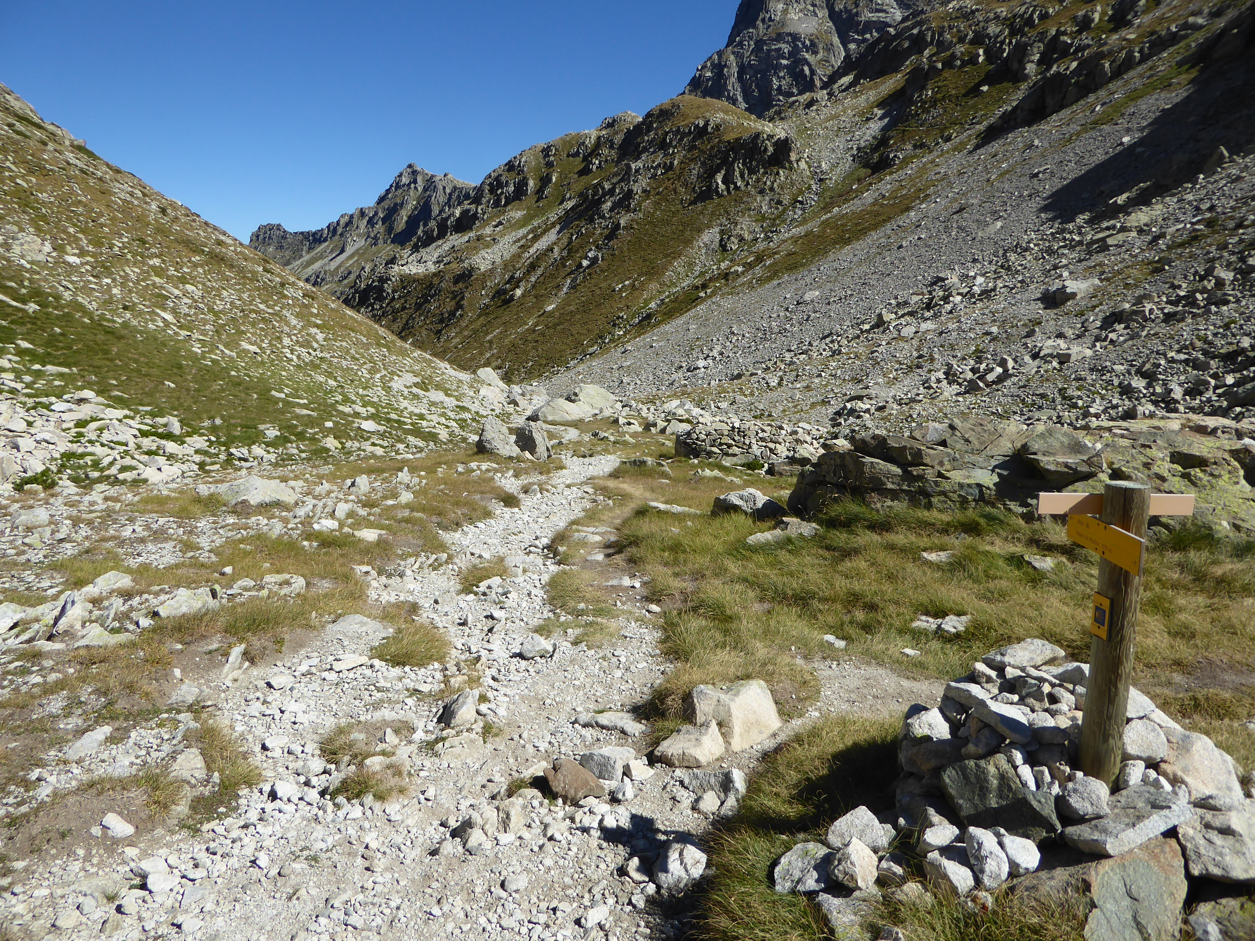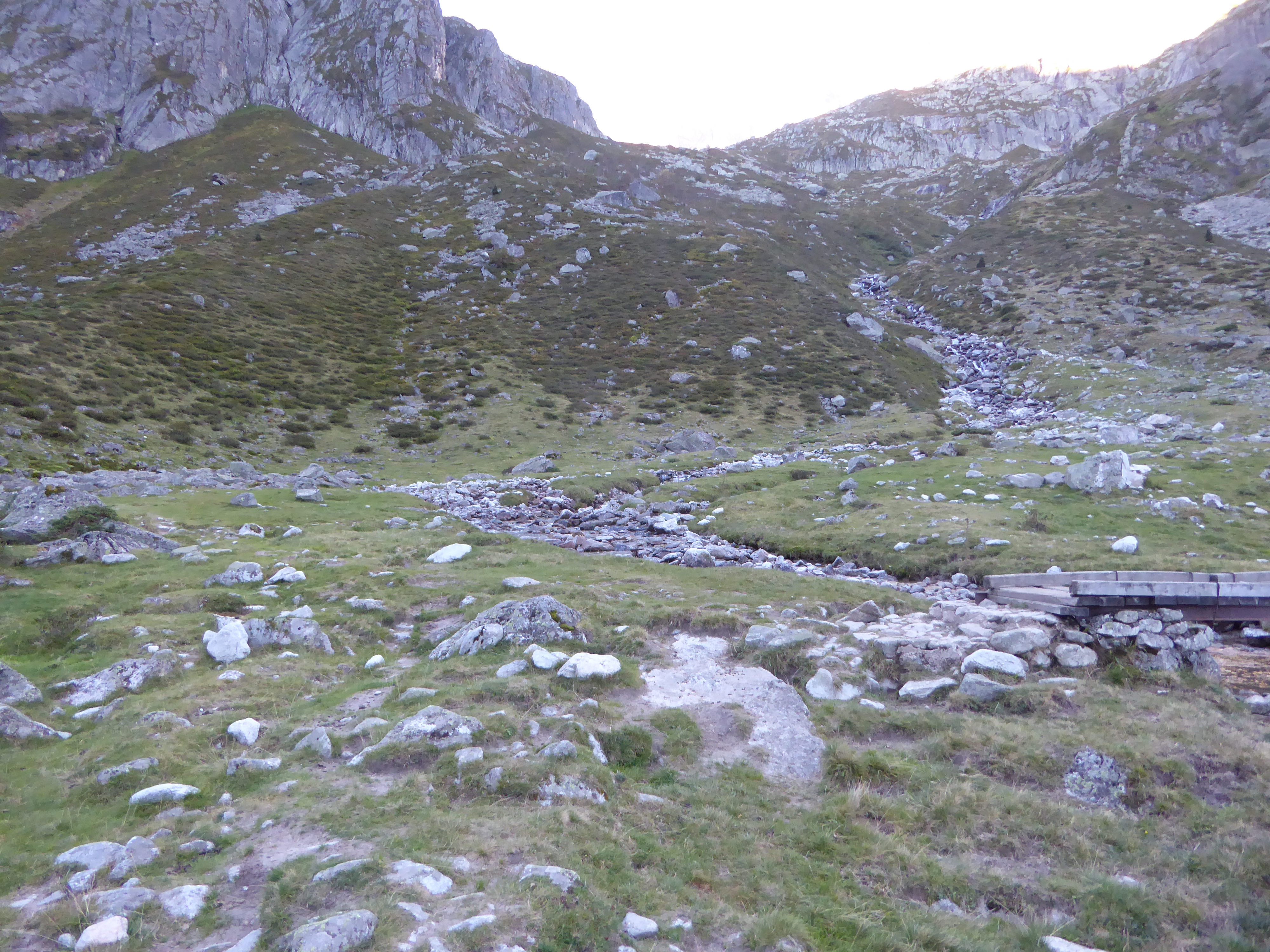 Replat herbeux (2667 m) : monter à vue à travers les éboulis plus ou moins stables et pénibles à monter direction Gavizo-Cristail (suivre impérativement les cairns)