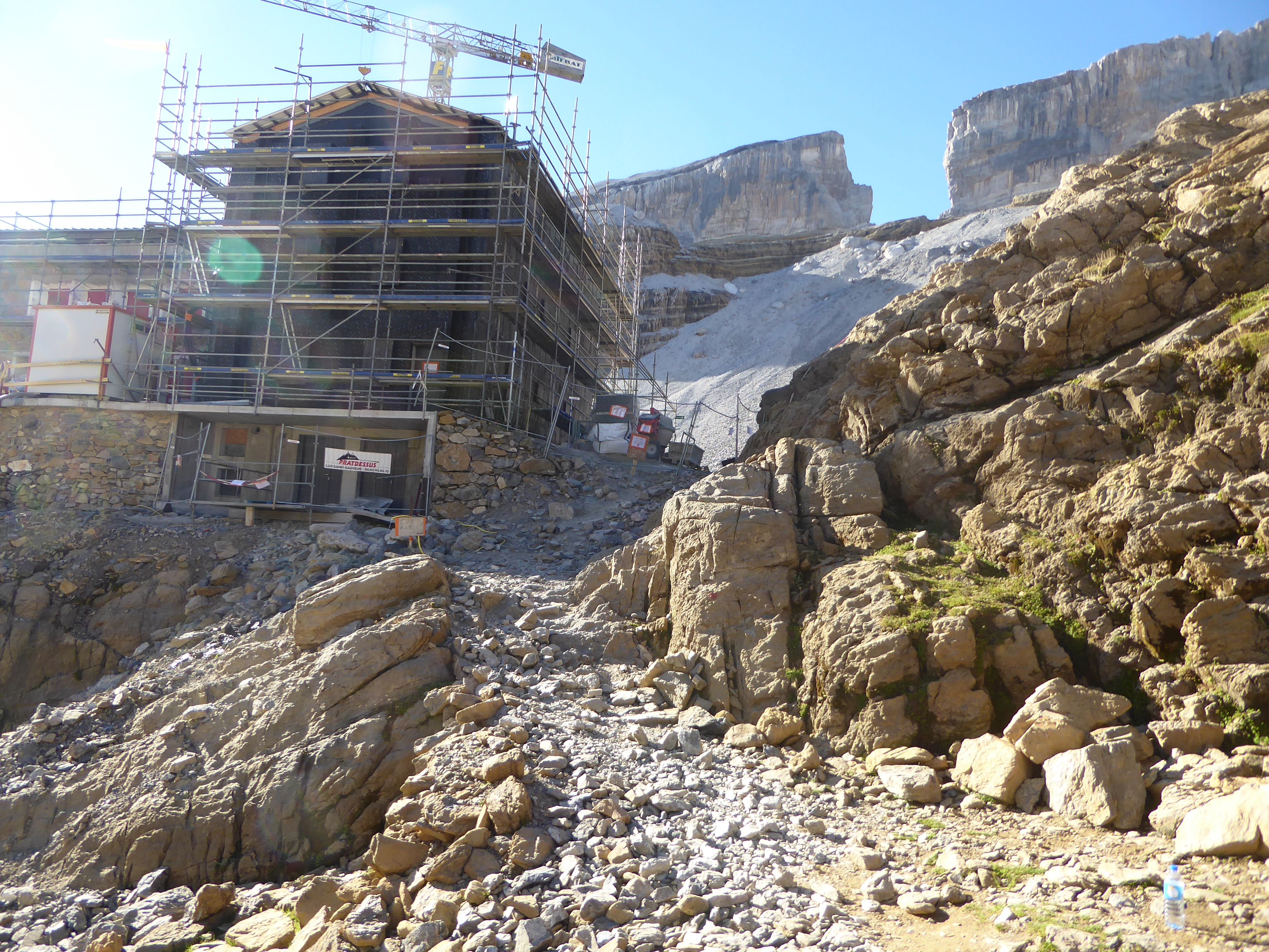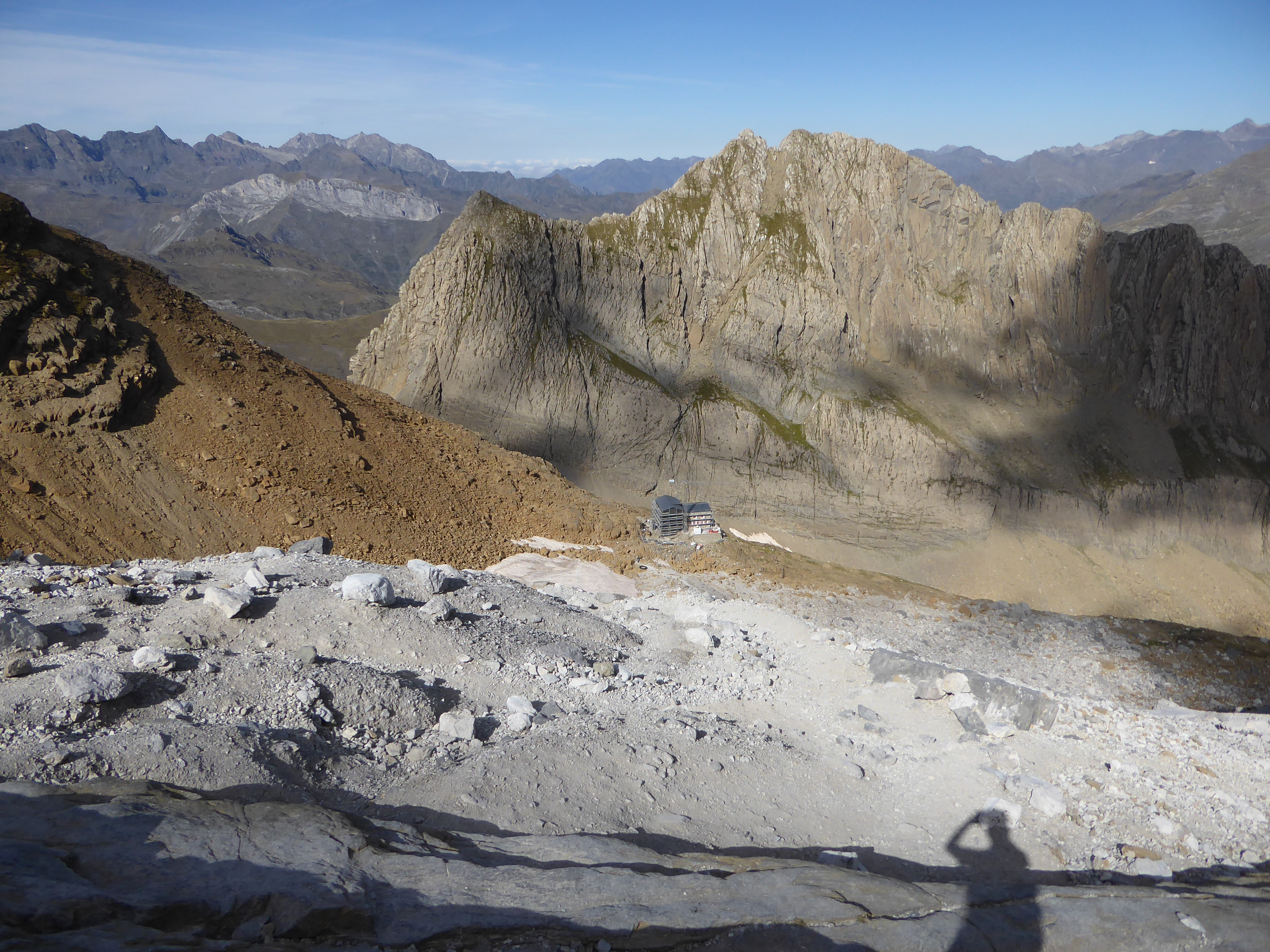 Refuge de la Brèche ou Refuge des Sarradets (2587 m) : suivre le chemin contournant le refuge sur la droite direction Brèche de Roland