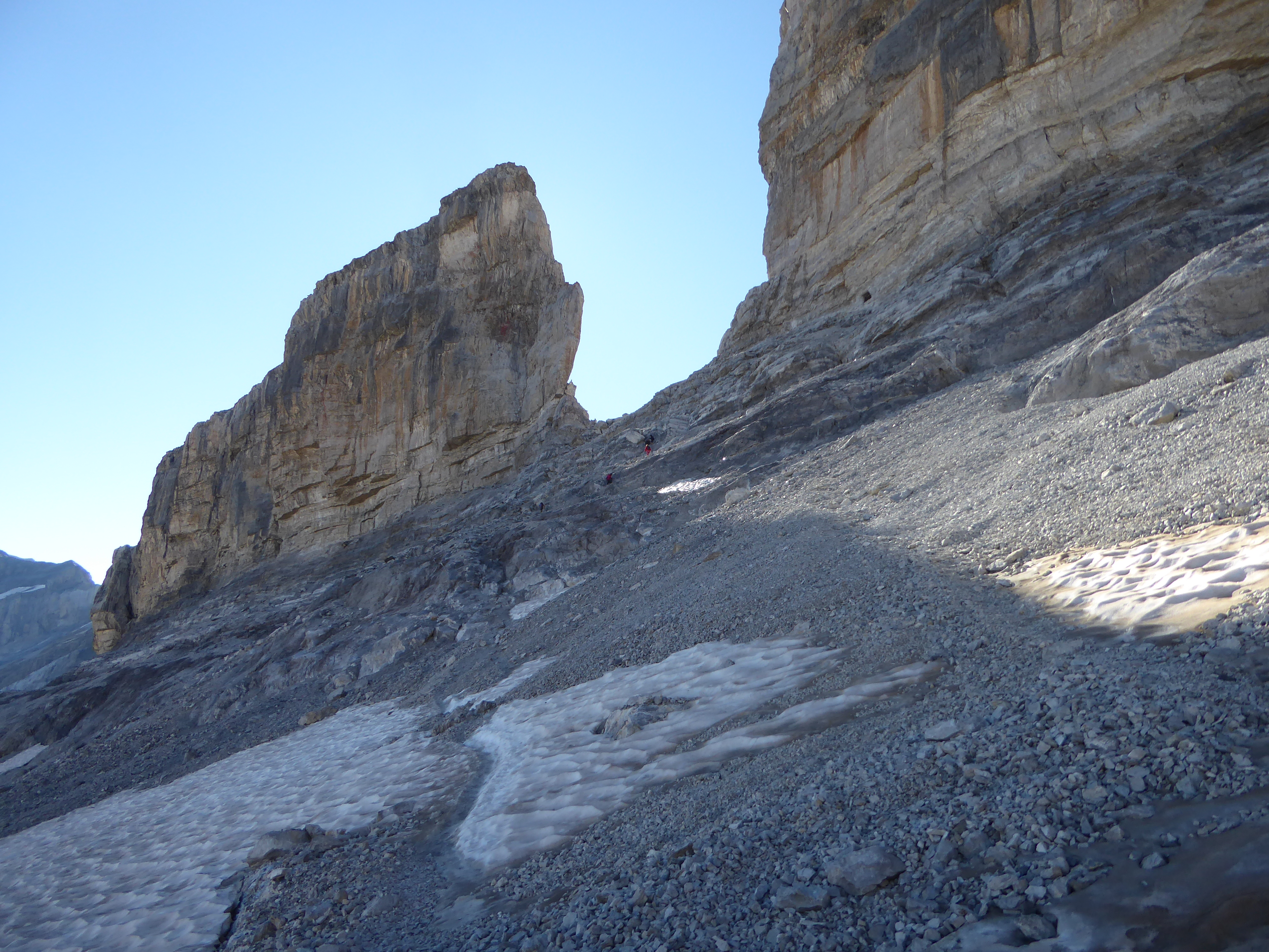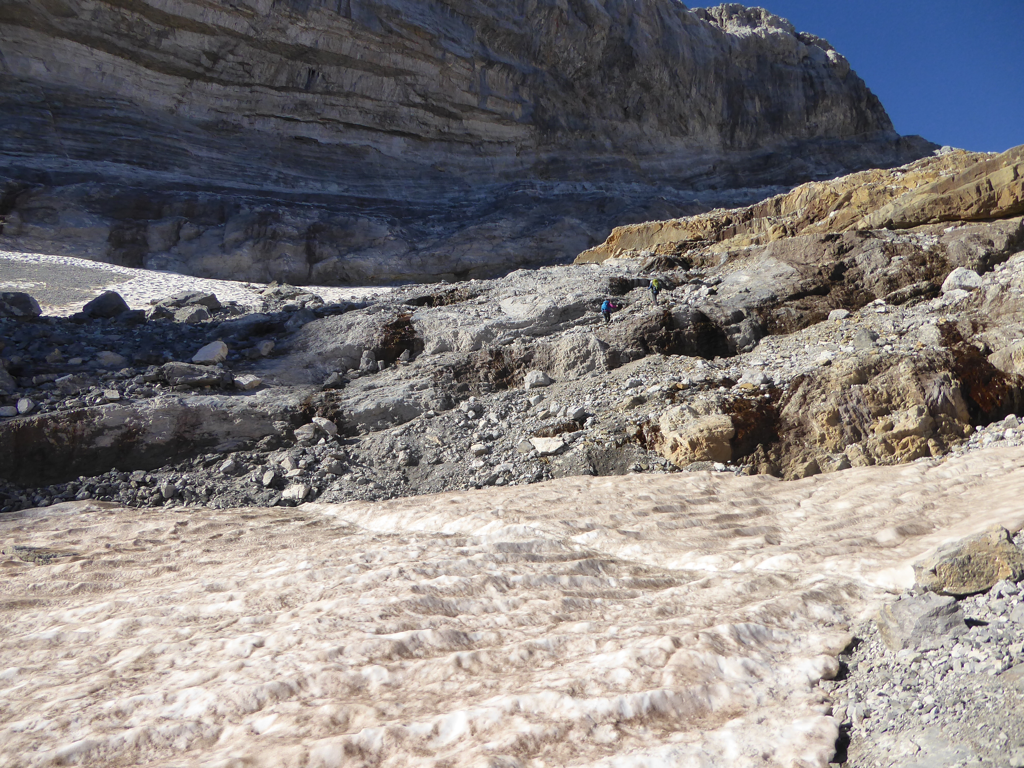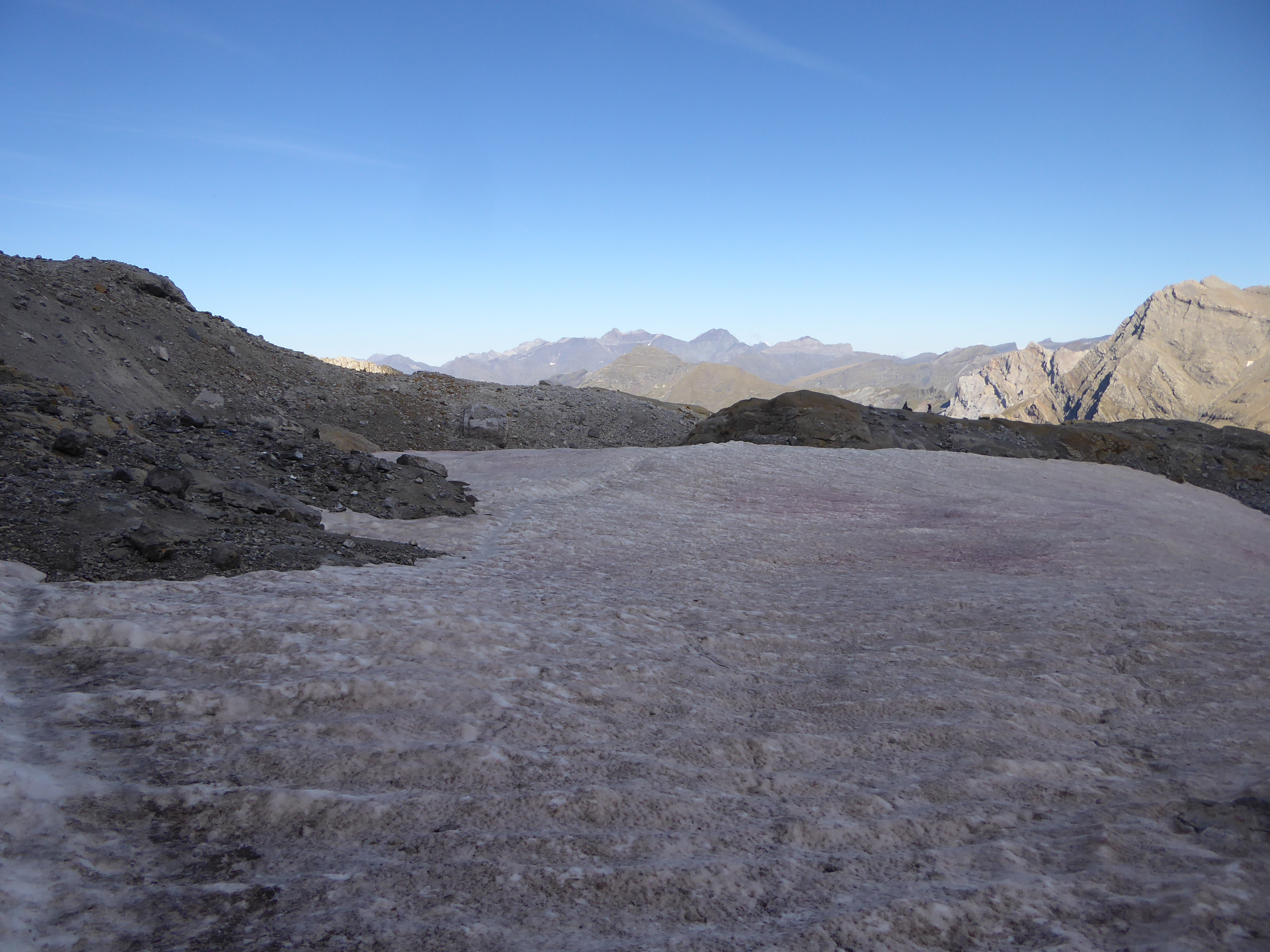 Même en fin de saison, le névé du Glacier de la Brèche est toujours présent : pas de danger à le franchir direction Brèche de Roland