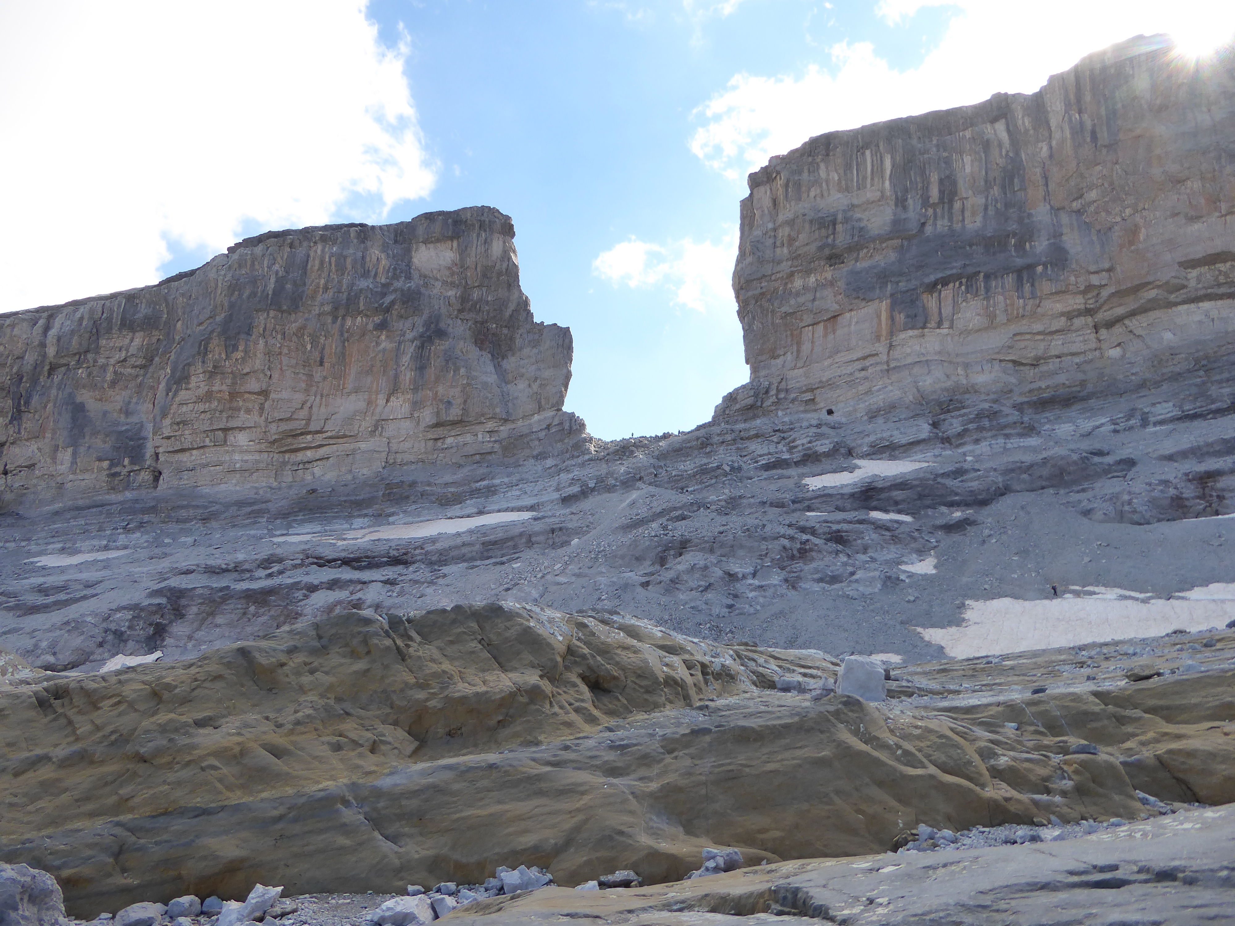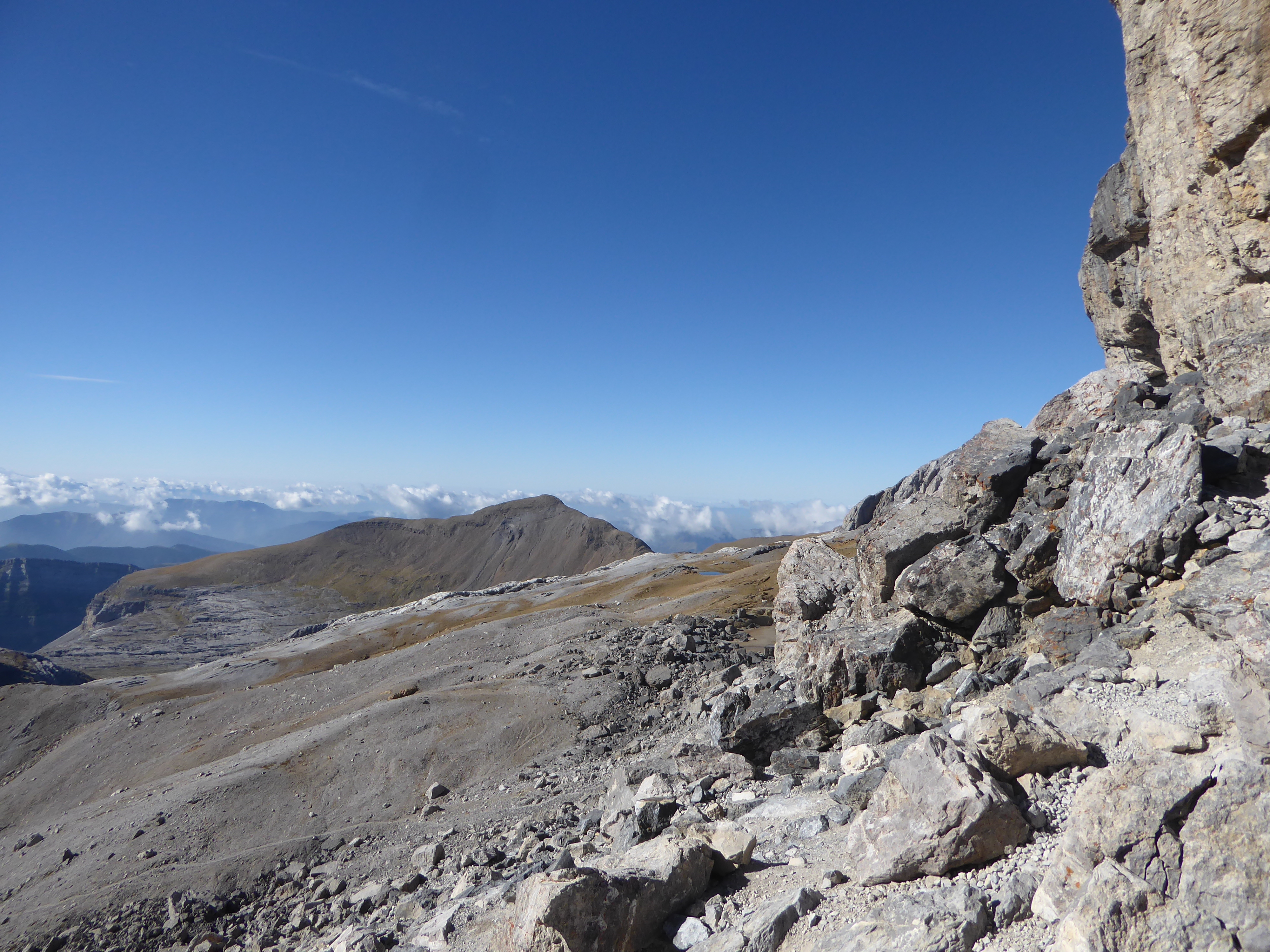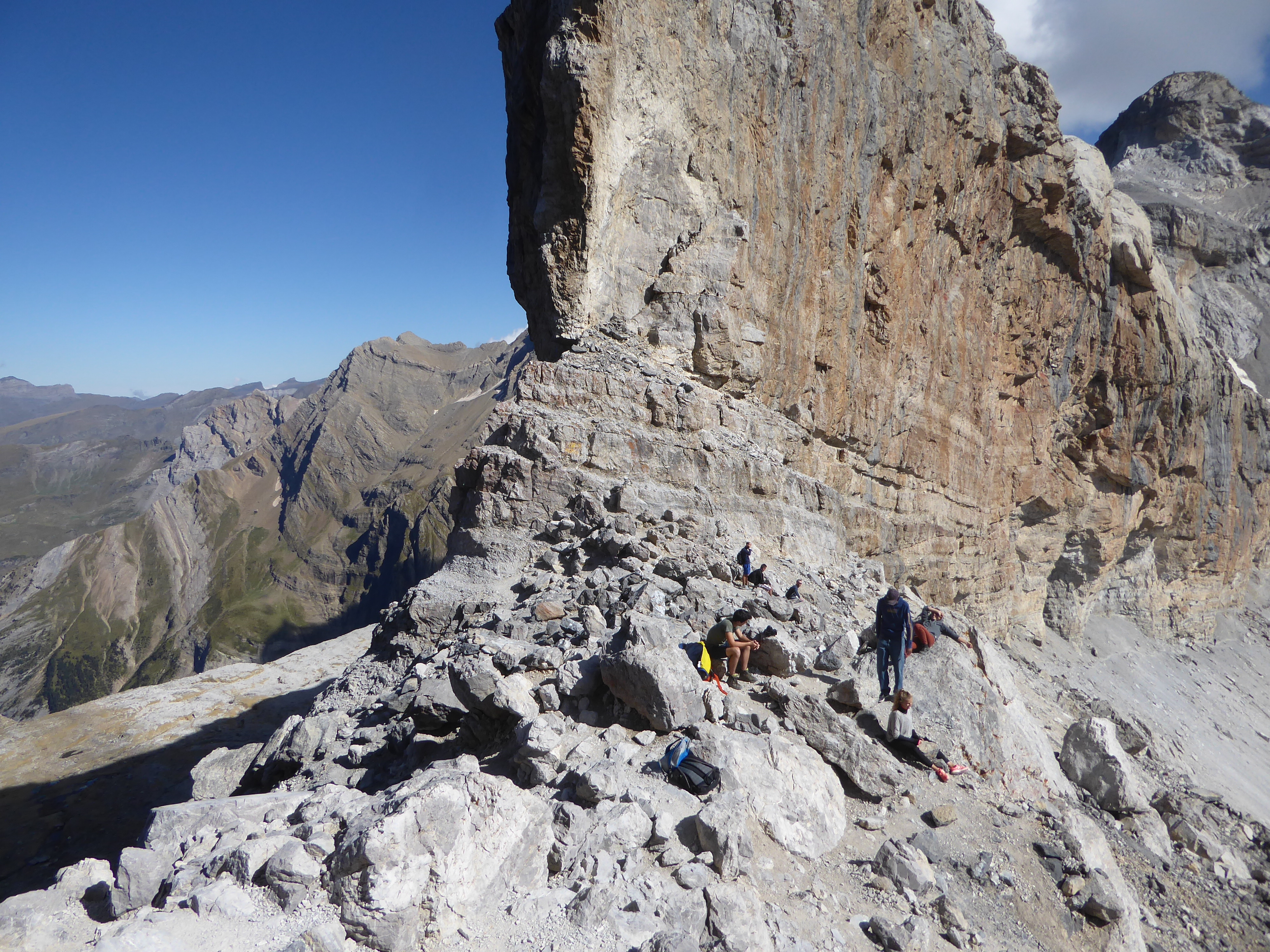 Brèche de Roland (2790 m) : frontière franco-espagnole et entrée dans le Parque Nacional de Ordesa y Monte Perdido (sortie du Parc National des Pyrénées) : suivre le chemin frontalier longeant la falaise vers l'Ouest direction le Taillon