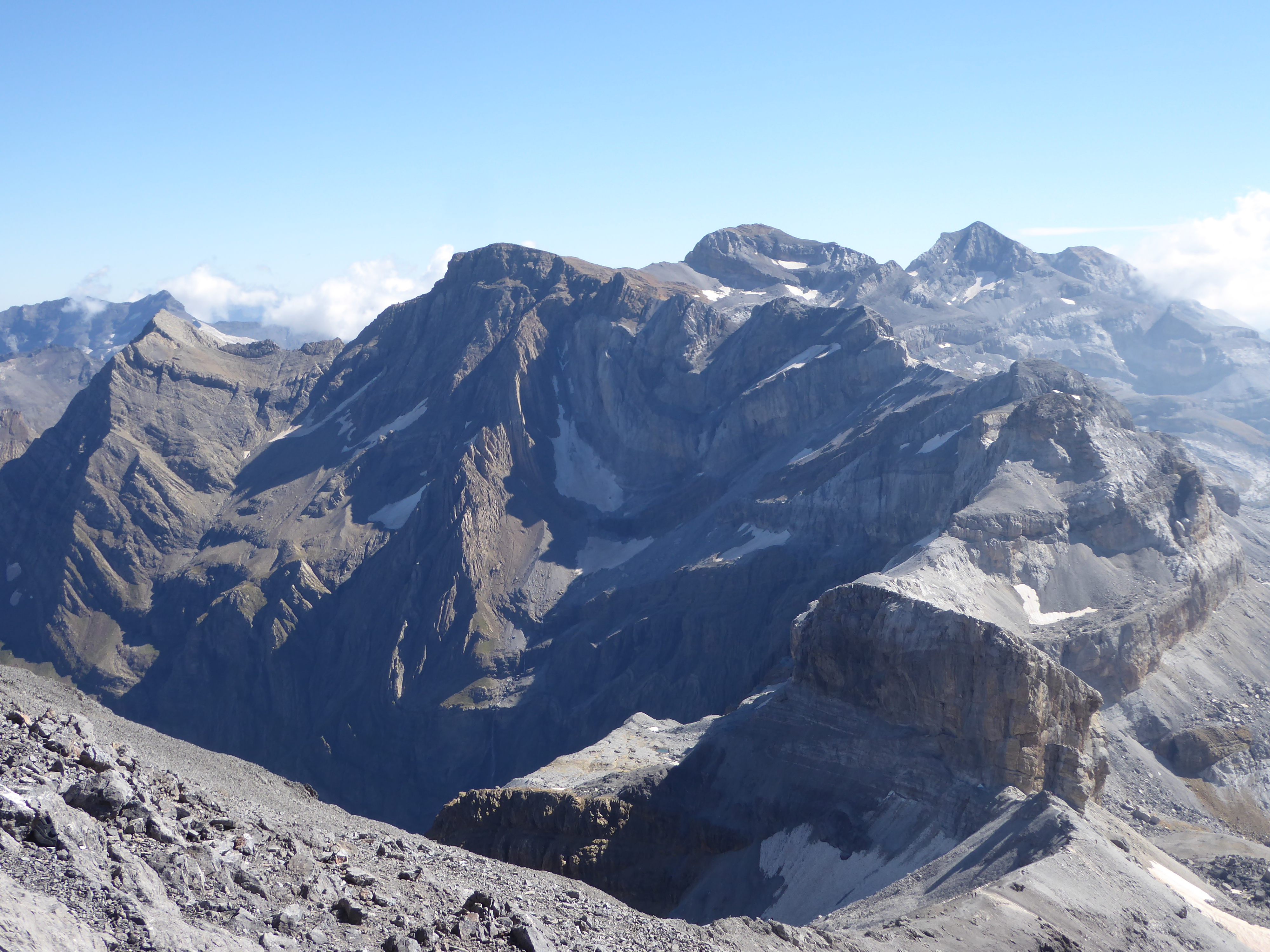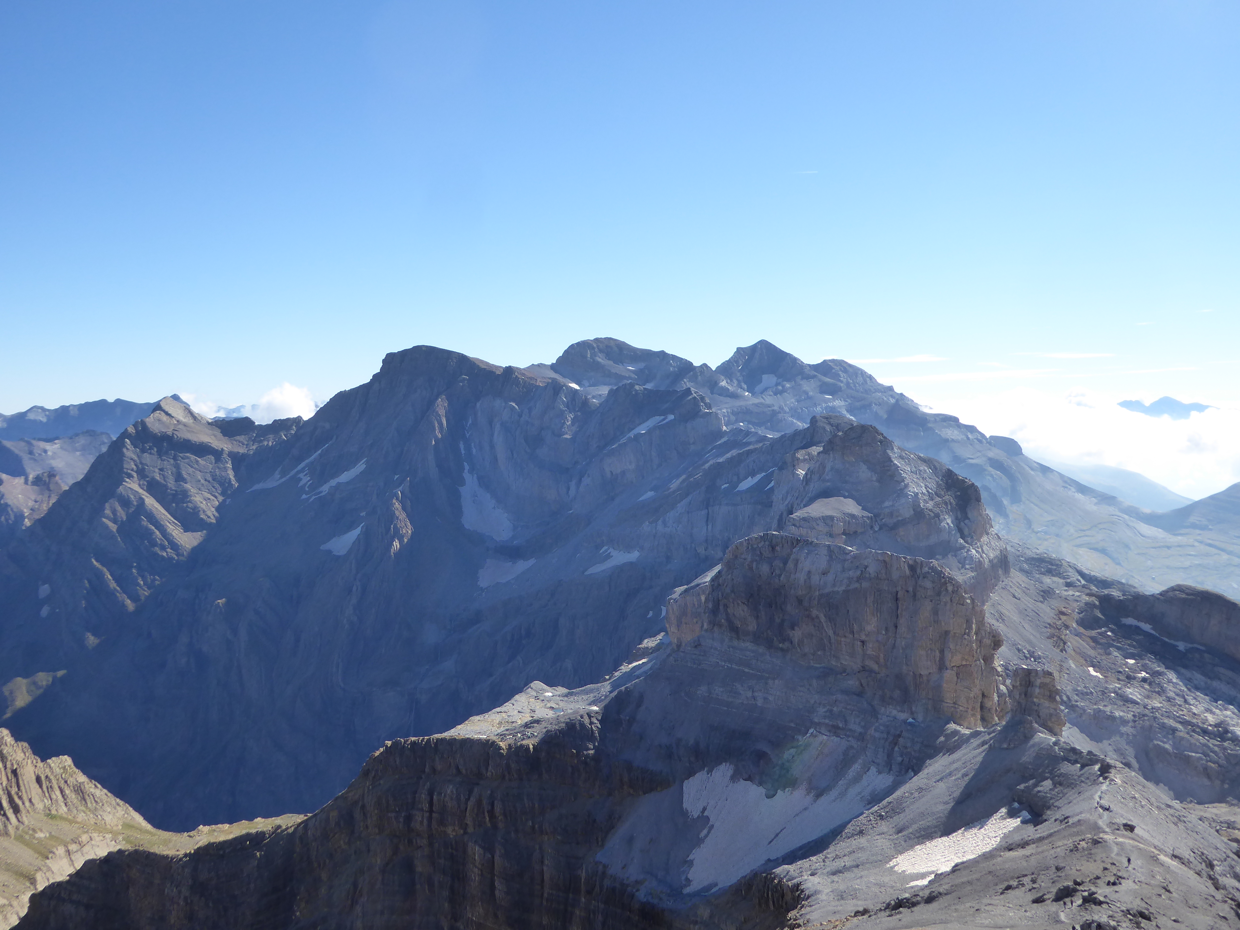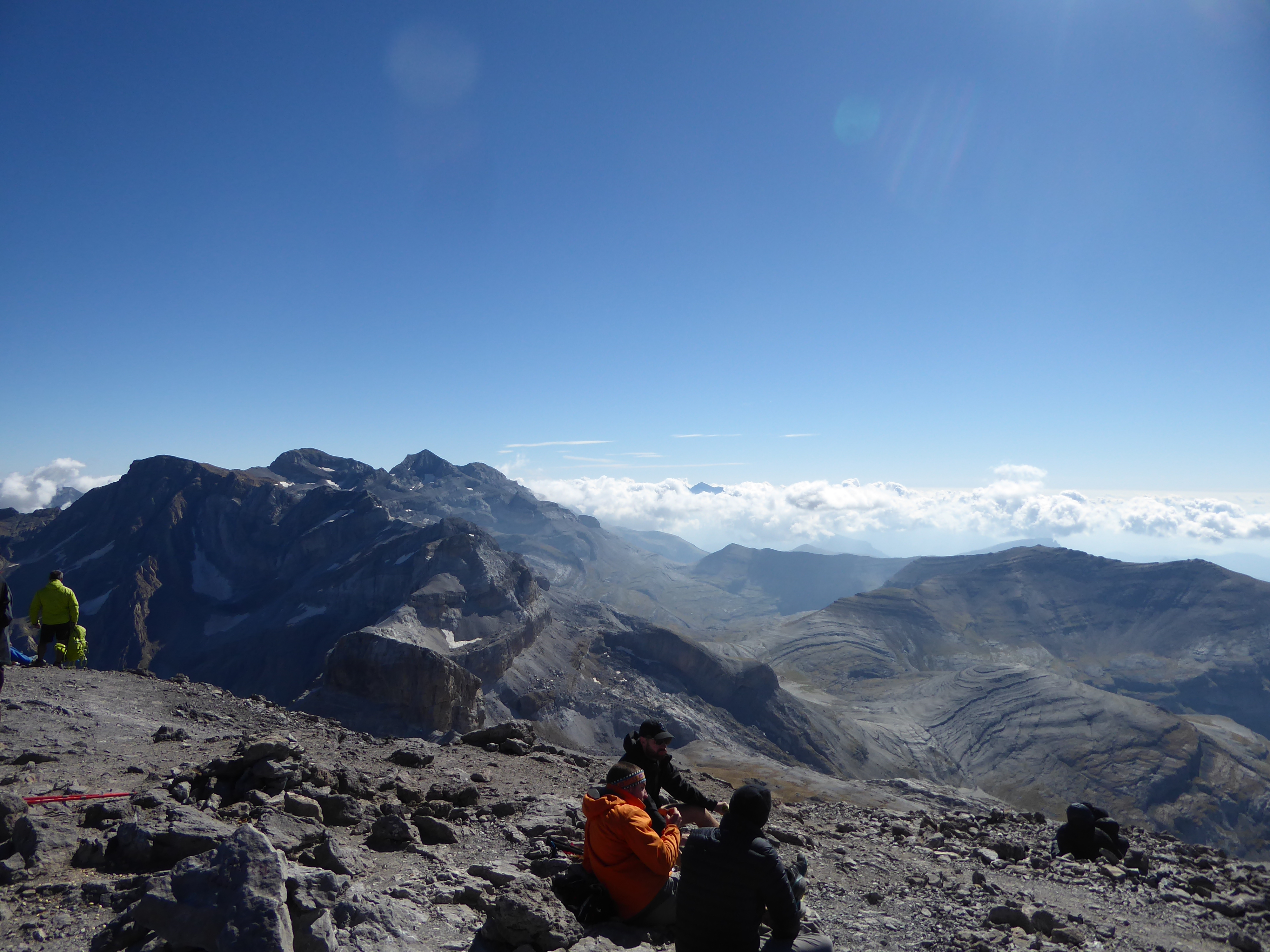 Arrivée au sommet du Taillon (3144 m) : très beau panorama aujourd'hui quelque peu bouché côté espagnol alors que la veille, c'était du côté français (Peña Collarada) : vue sur les sommets du Béarn, des Hautes-Pyrénées et de l'Aragon ... et le Cirque de Gavarnie ! Du monde au sommet pour ce "3000" accessible !