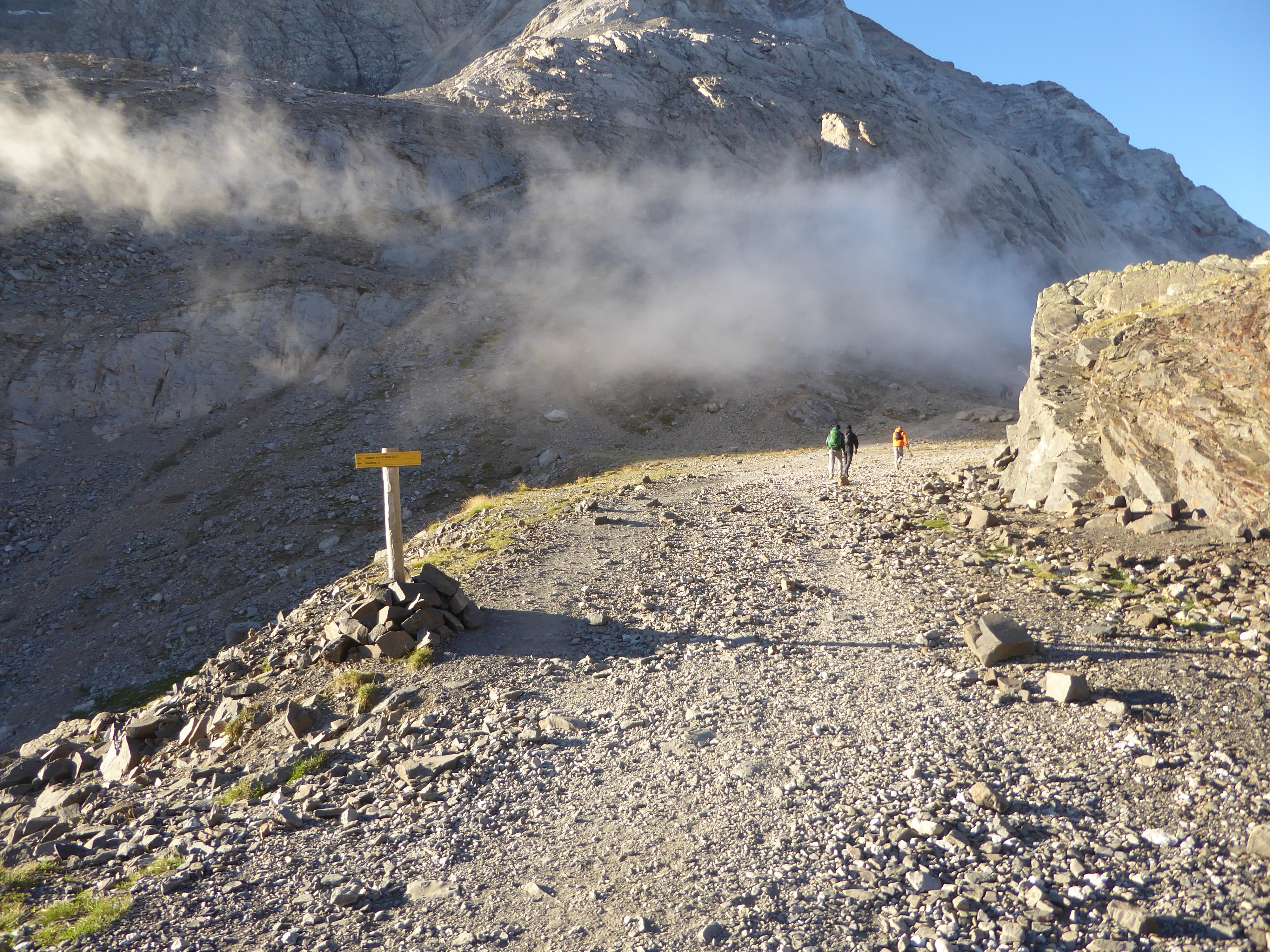 Brèche de Roland (2790 m) : frontière franco-espagnole et entrée dans le Parc National des Pyrénées (sortie du Parque Nacional de Ordesa y Monte Perdido) : suivre le chemin descendant sur la gauche direction Refuge de la Brèche