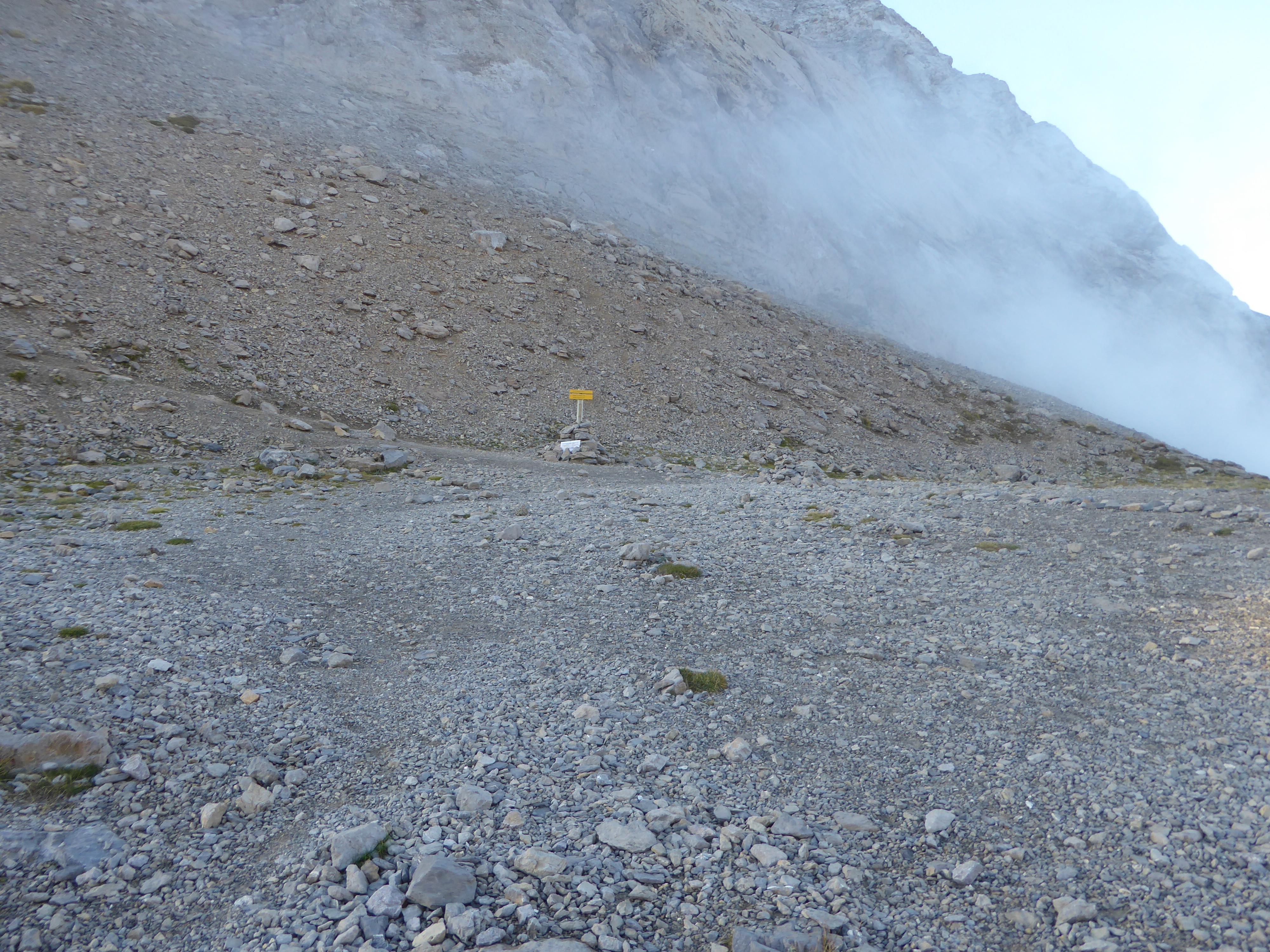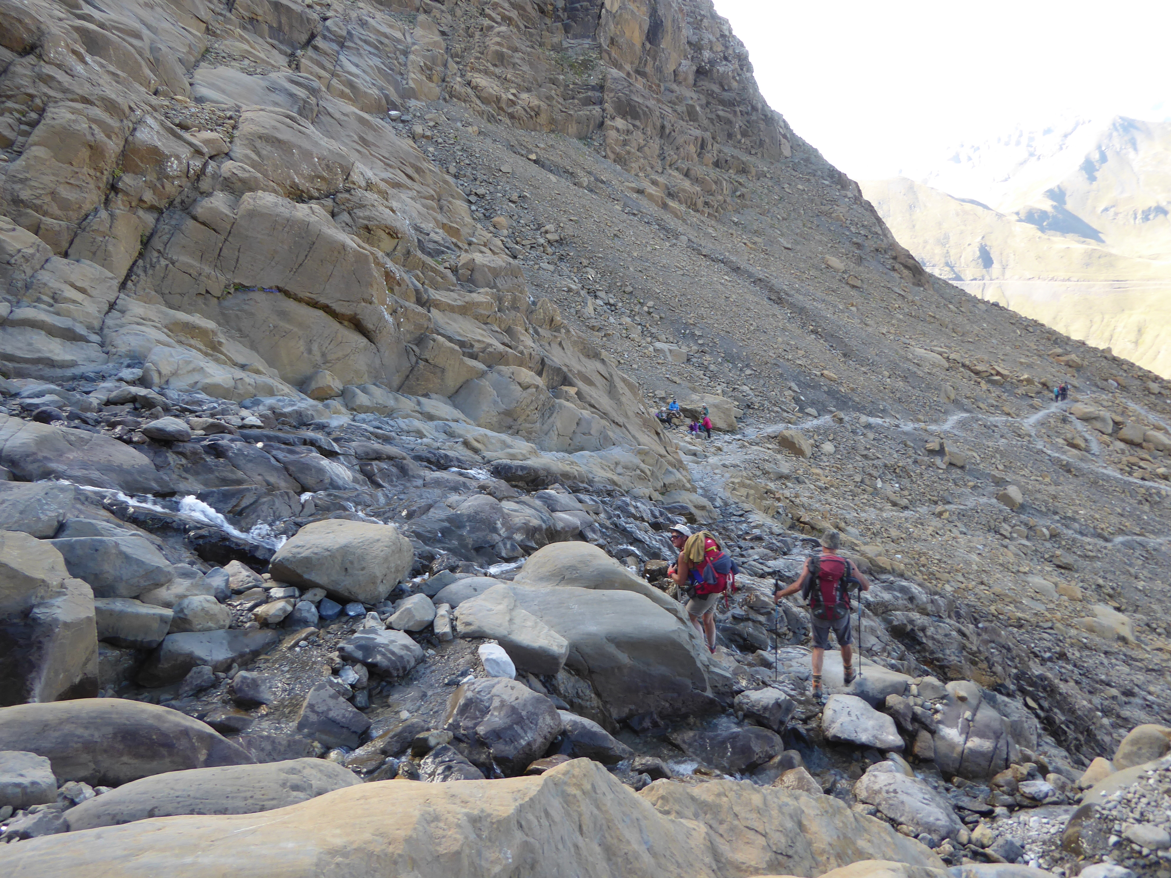 Après avoir traversé le névé, suivre le chemin descendant raidement dans le pierrier vers le refuge direction Refuge de la Brèche