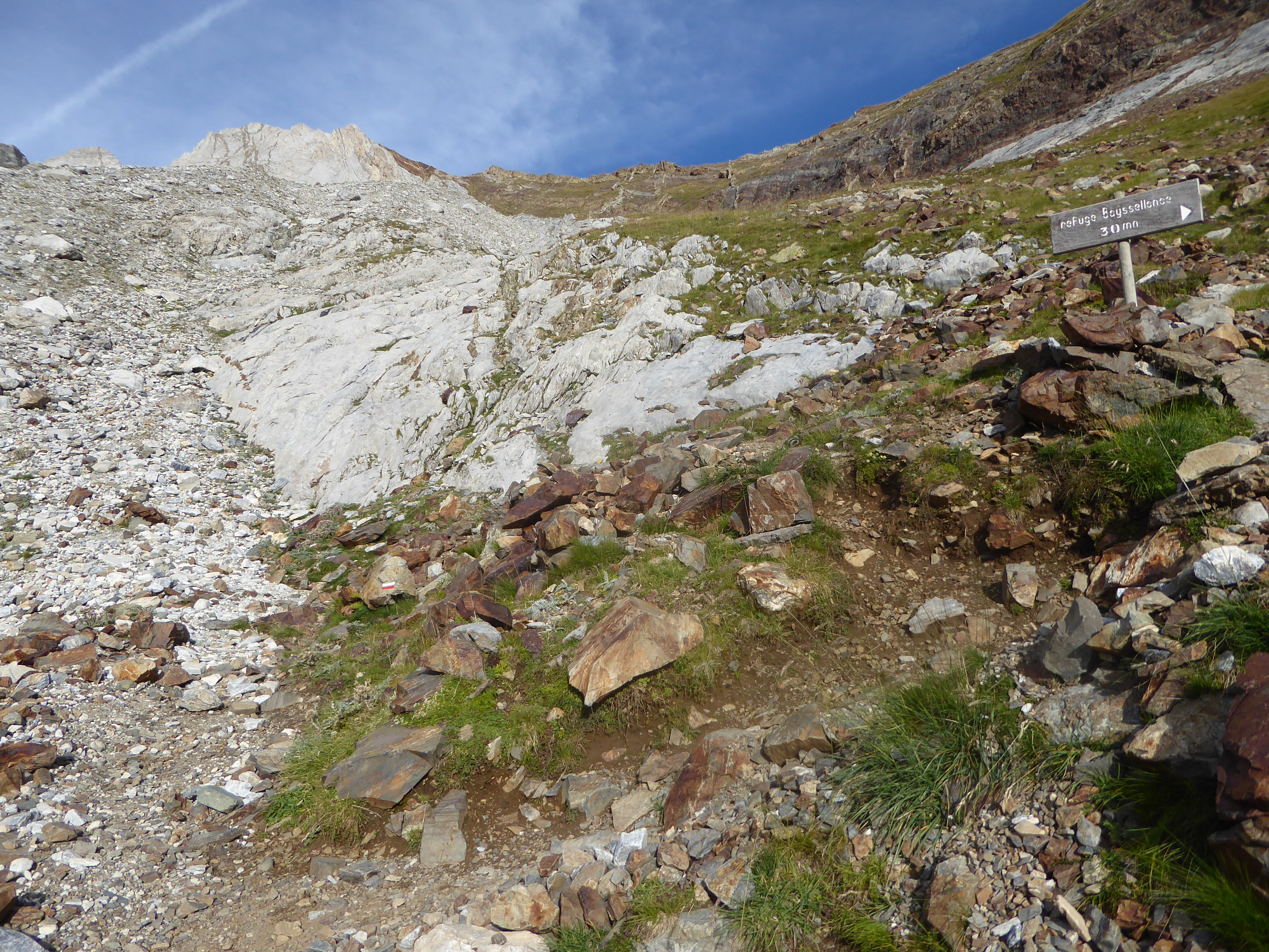 A ce croisement marqué d'un panneau "Refuge Baysselance 30 min" (2457 m), suivre le chemin montant sur la droite direction Hourquette d'Oussoue, balisé en rouge et blanc (le chemin partant tout droit mène au Glacier d'Oussoue pour l'ascension de la Pique Longue)