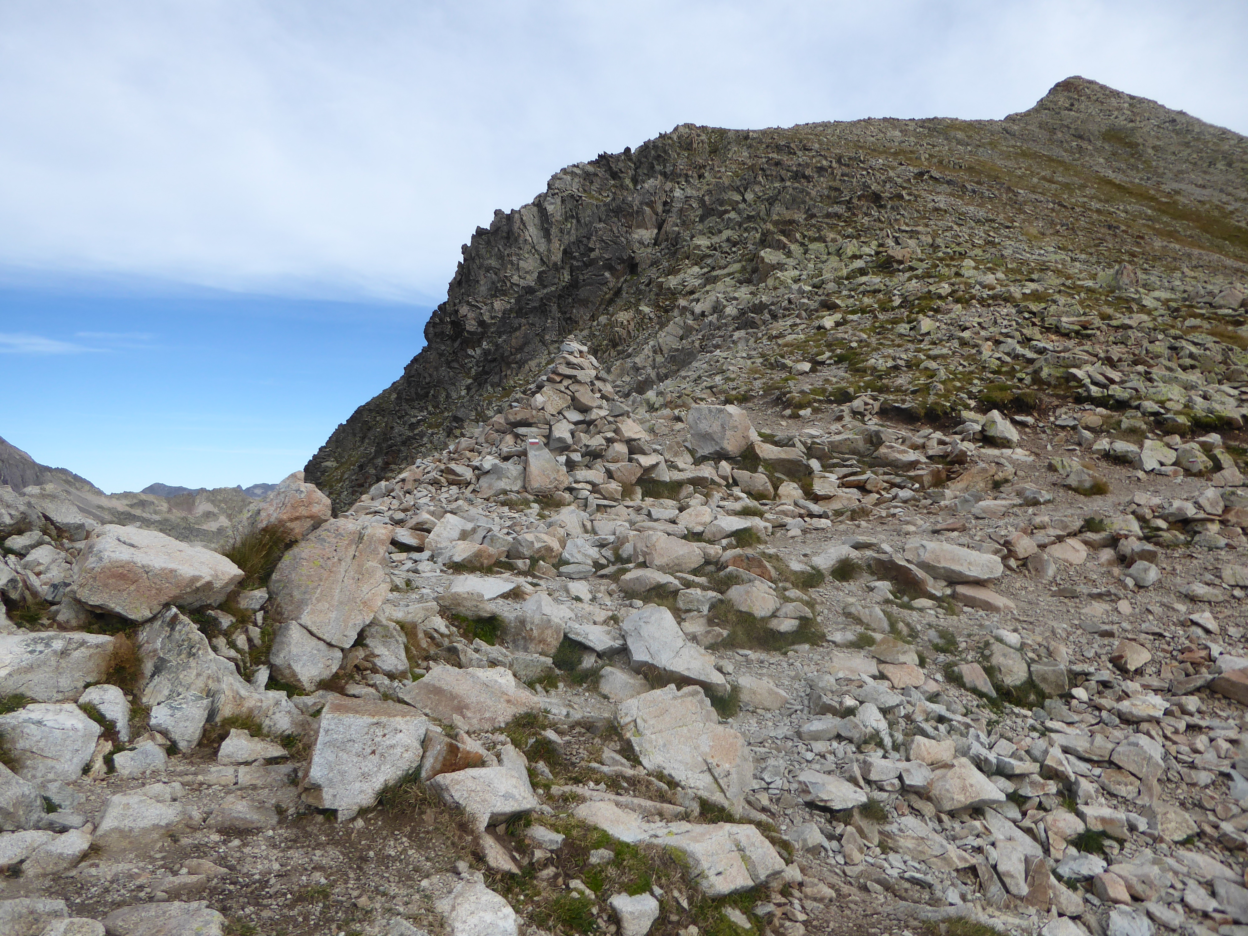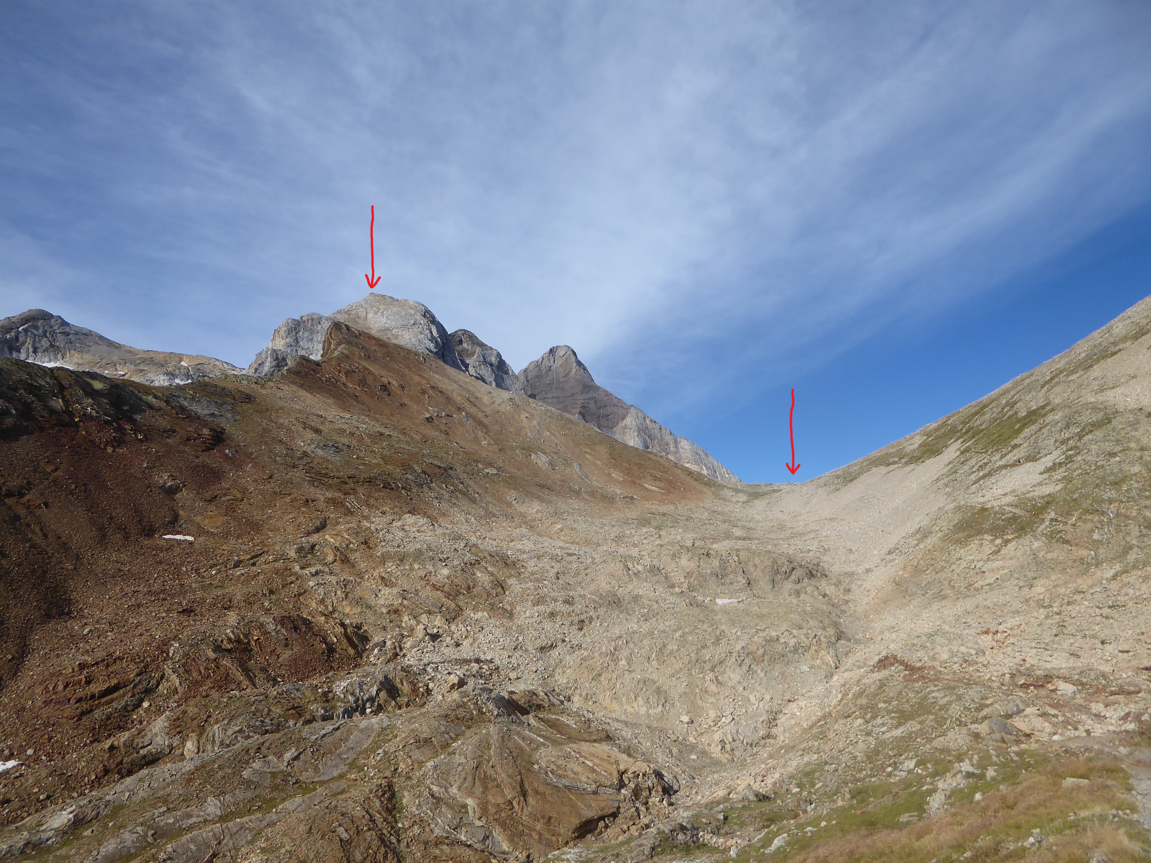 Hourquette d'Oussoue (2734 m) : suivre le chemin partant sur la gauche (cairné et bien tracé) montant vers le sommet direction Petit Vignemale, aucun balisage dorénavant