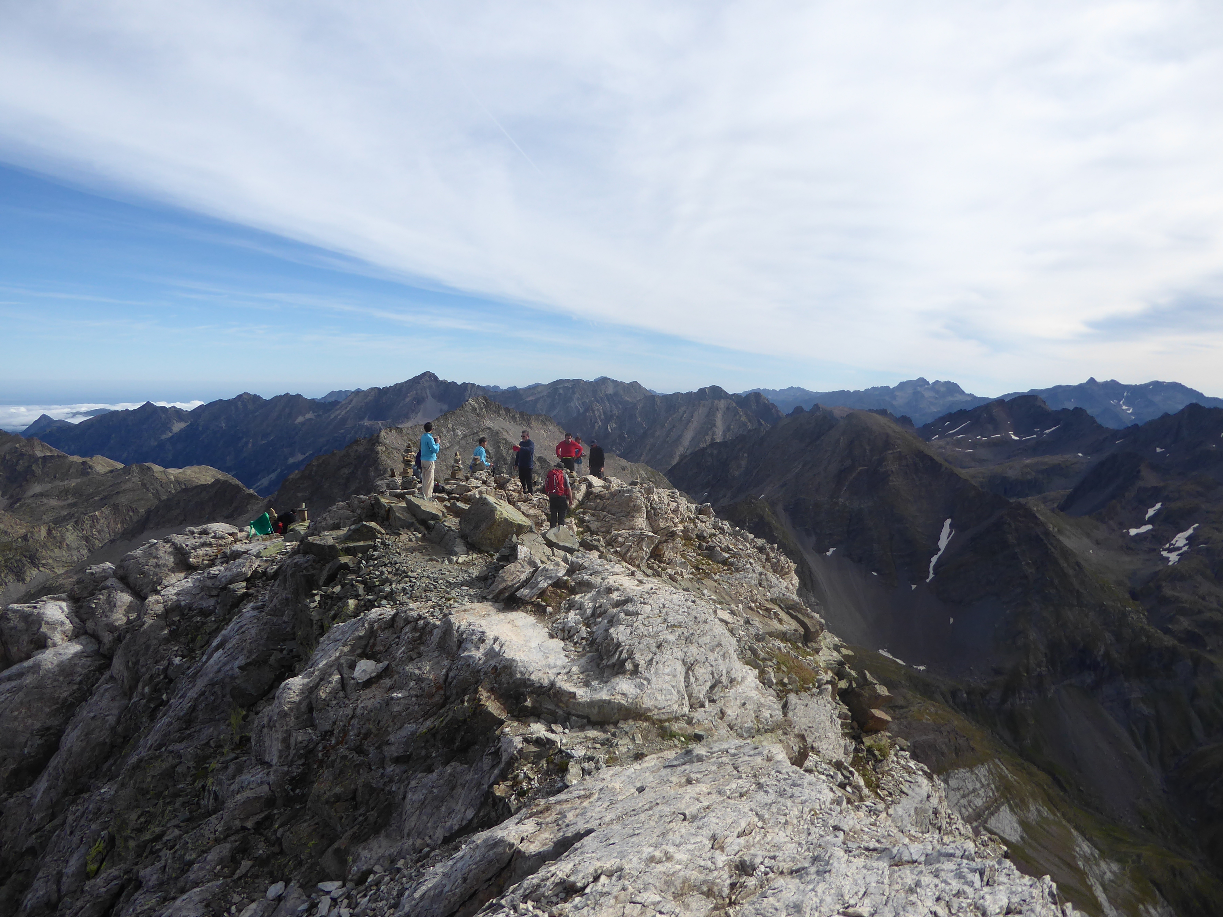 Arrivée au sommet du Petit Vignemale (3032 m) : beau contraste aujourd'hui avec ce voile nuageux : belle vue sur les sommets des Hautes-Pyrénées et de l'Est du Béarn ... et même jusqu'en Ariège et l'Aneto ! Beaucoup de monde au sommet pour ce "3000" accessible !