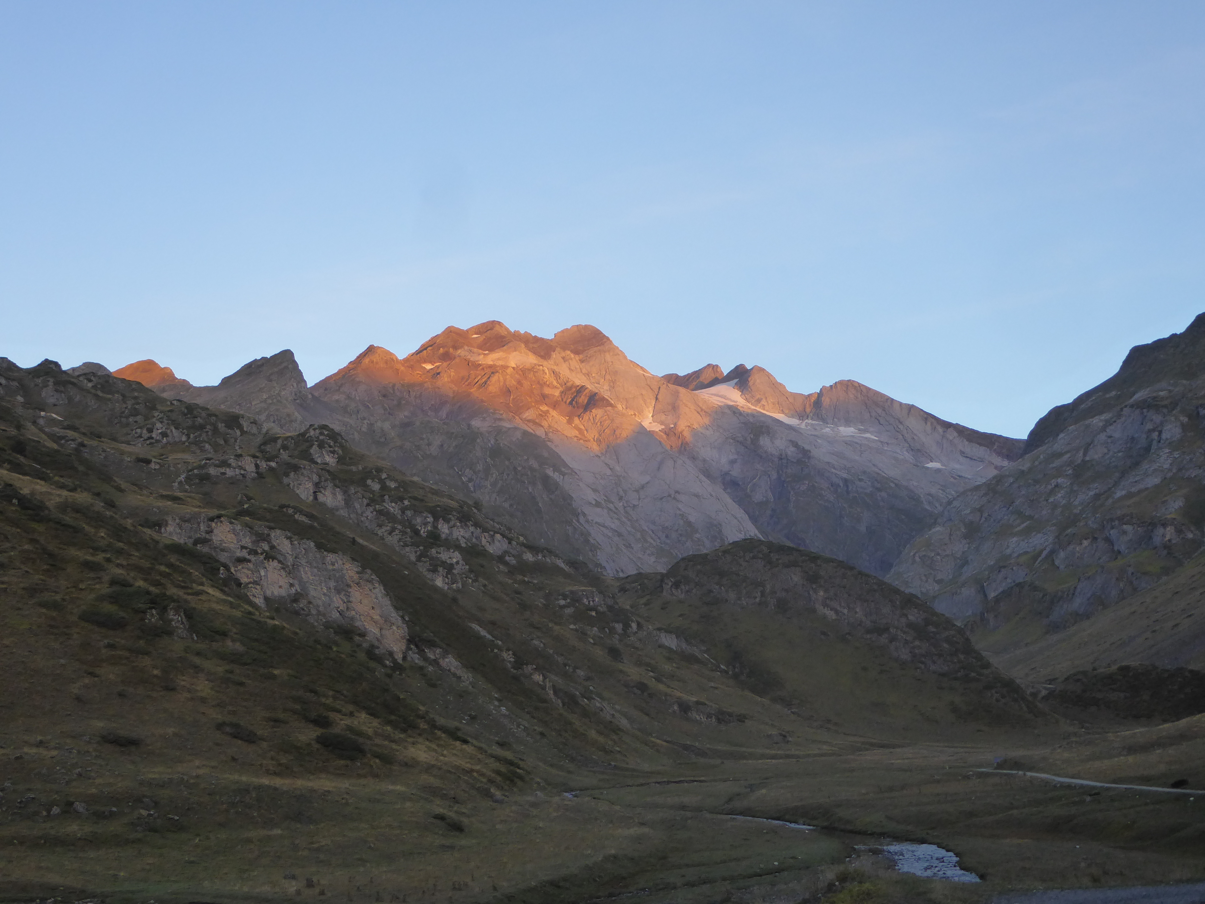 Lever de soleil sur le Massif du Vignemale ; le Petit Vignemale est le sommet gris le plus à droite !