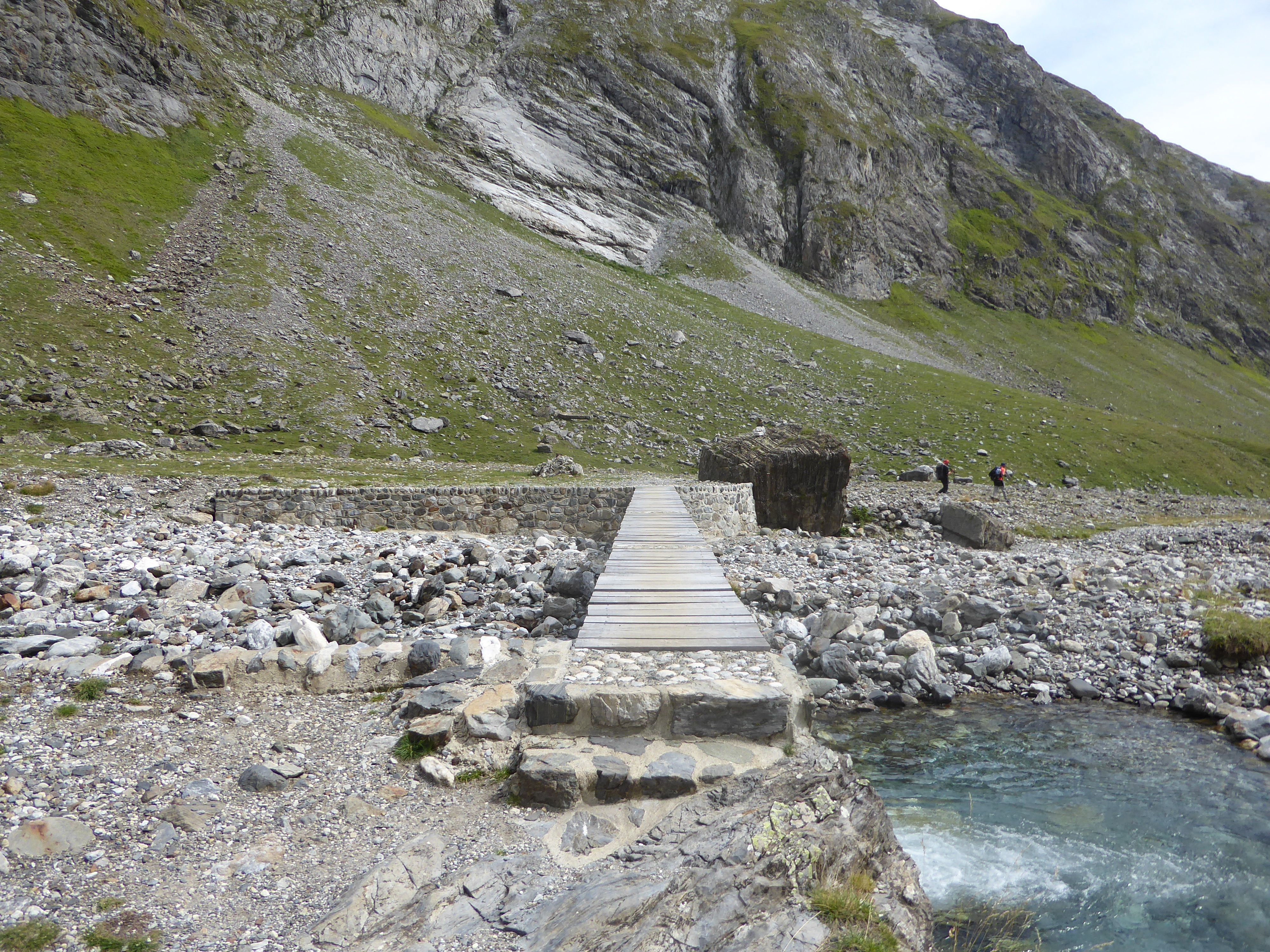 Passerelle (1865 m) : traverser cette passerelle pour passer rive droite du Ruisseau d'Oussoue direction Hourquette d'Oussoue, balisé en rouge et blanc (le cumul du dénivelé démarre véritablement maintenant)