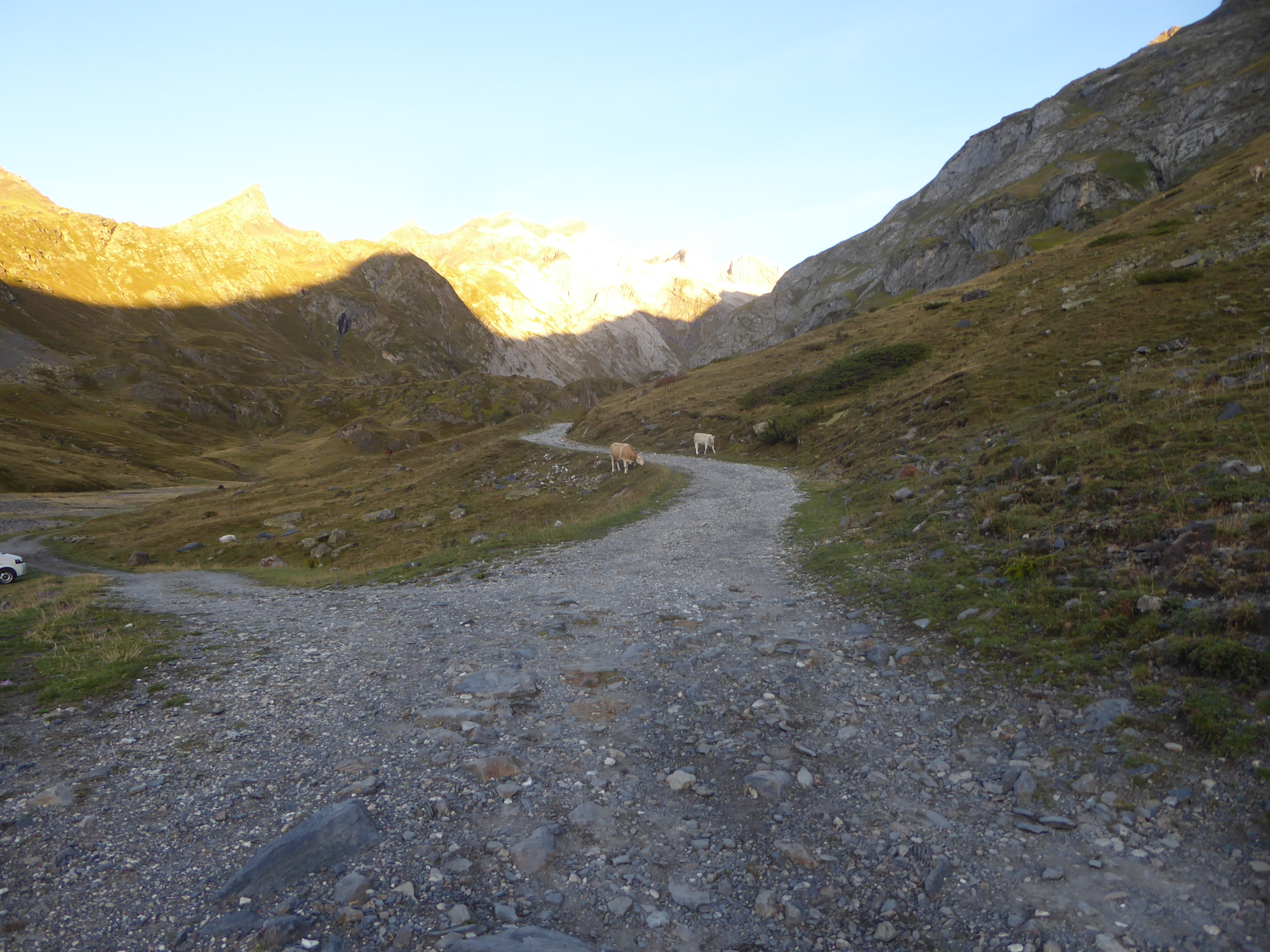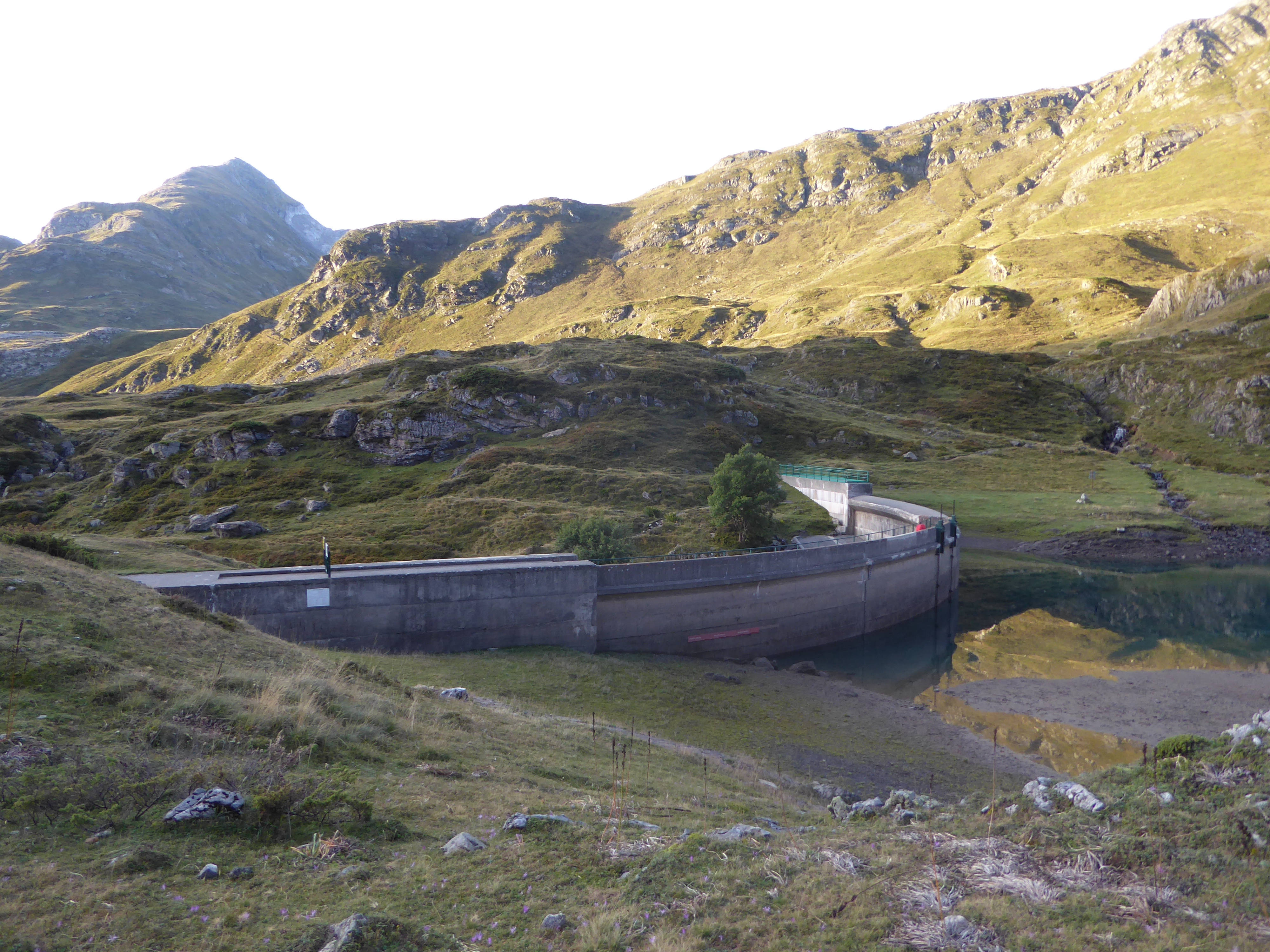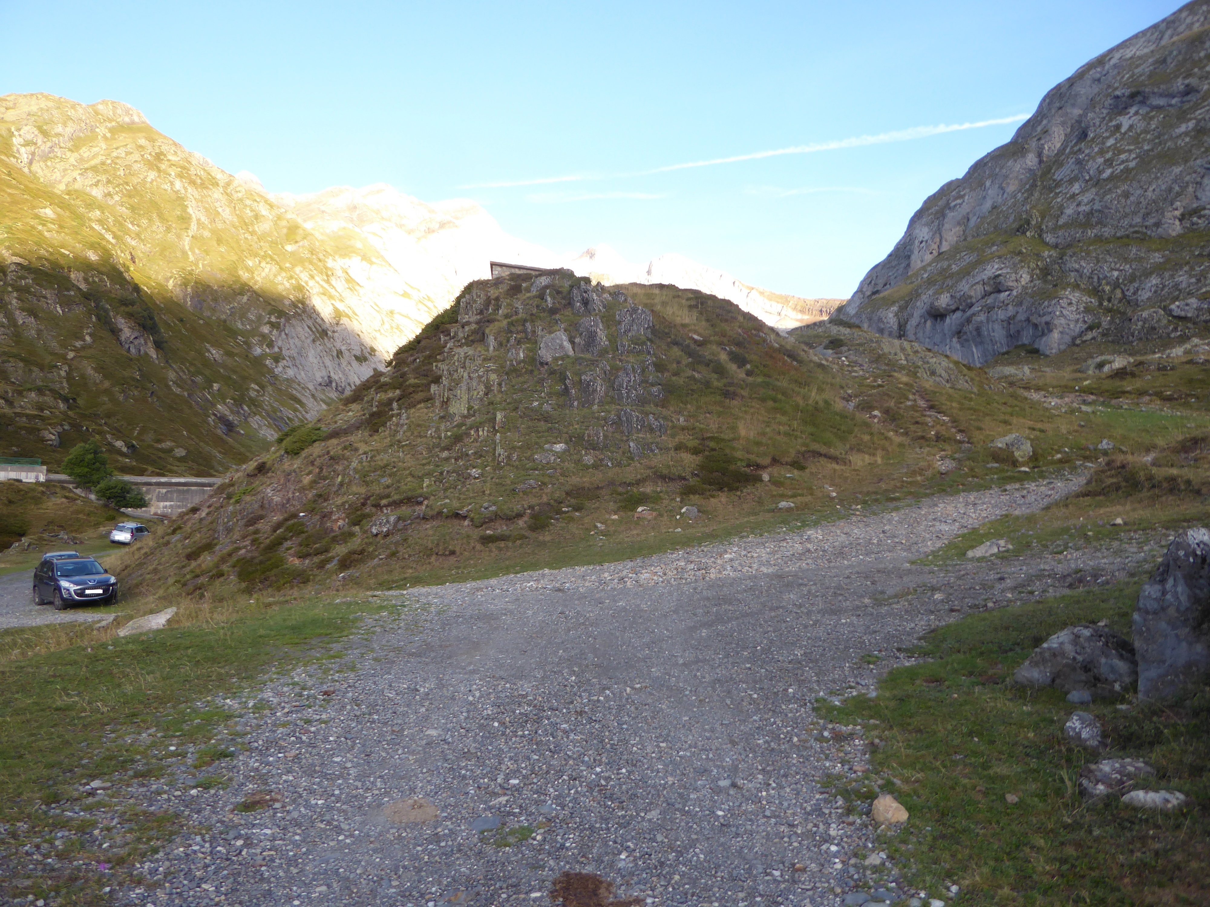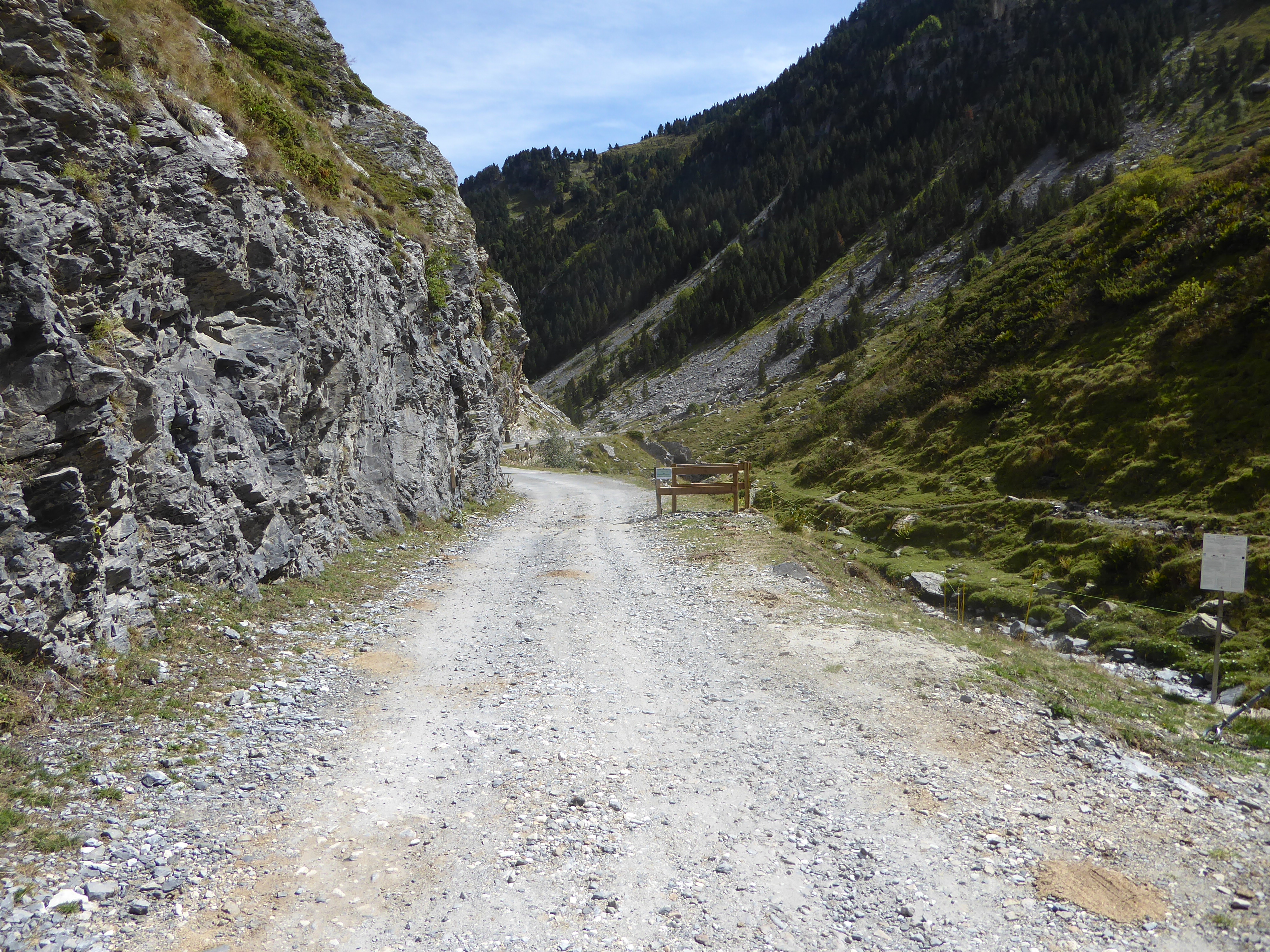 Barrage d'Oussoue (1838 m) : sortie du Parc National des Pyrénées : suivre le chemin partant tout droit et se transformant rapidement en piste carrossable direction Pont d'Artigouli, aucun balisage dorénavant