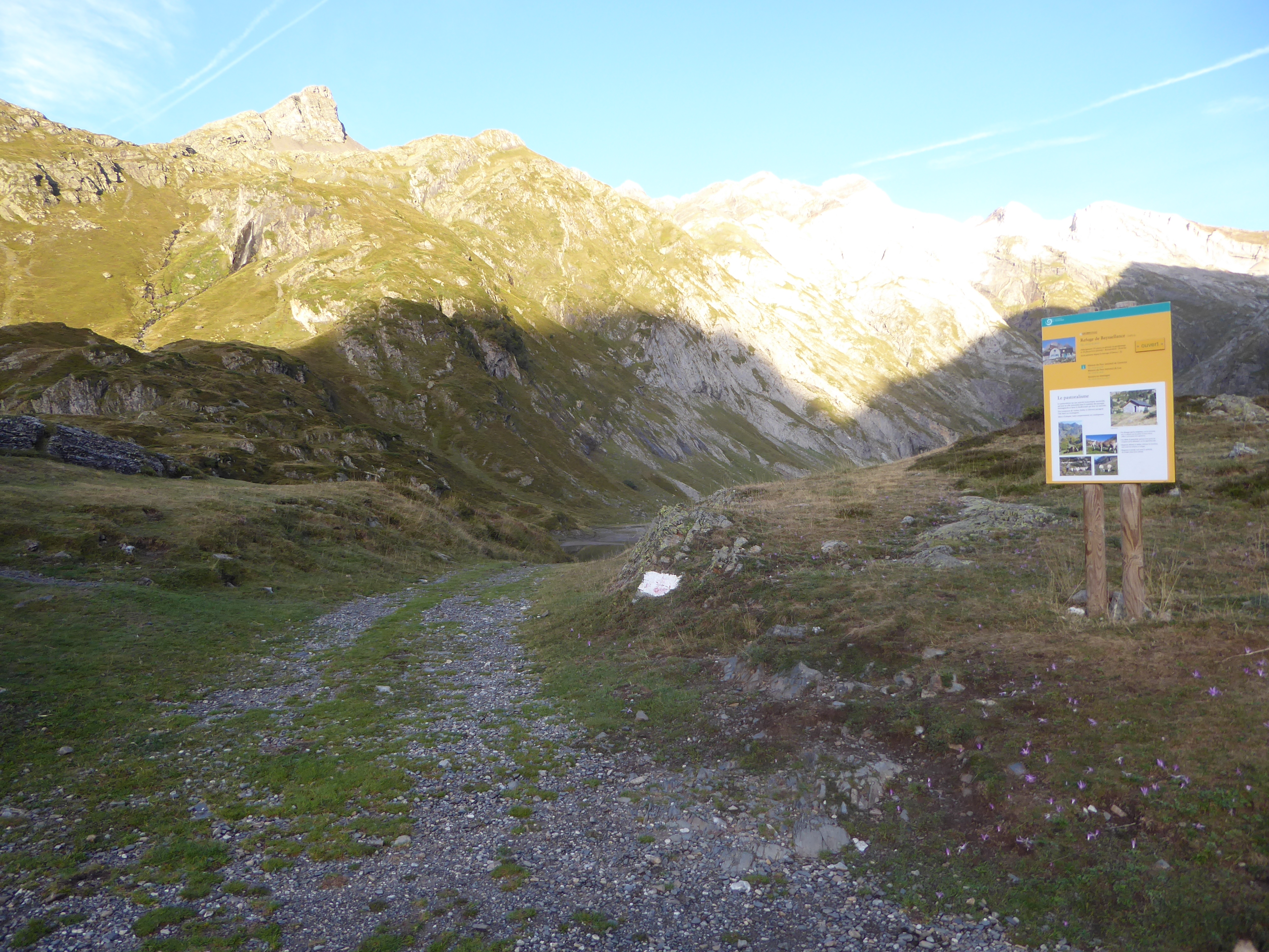 A ce croisement marqué d'un panneau "Refuge Baysselance 30 min" (2457 m), suivre le chemin descendant sur la gauche direction Barrage d'Oussoue, balisé en rouge et blanc