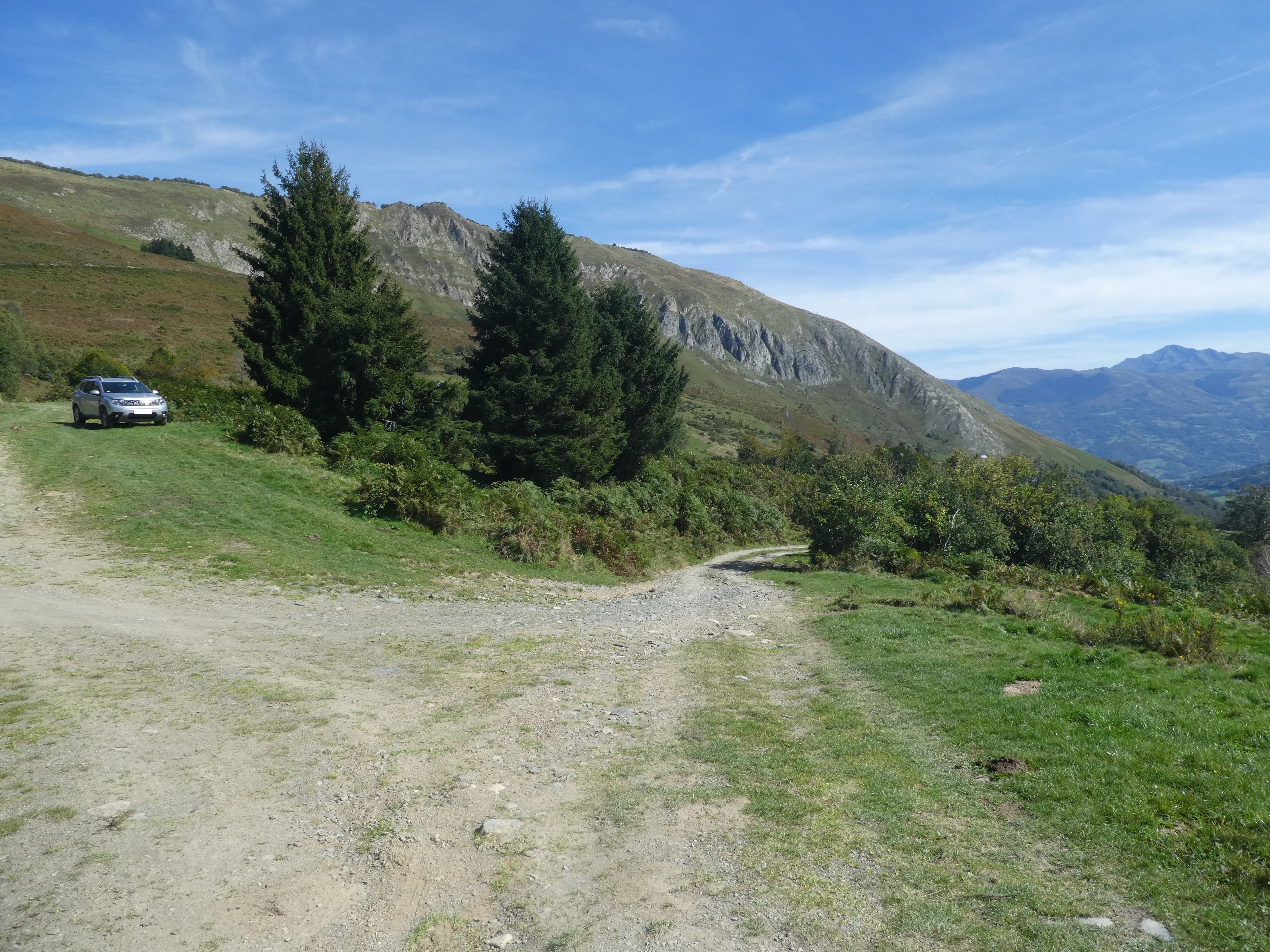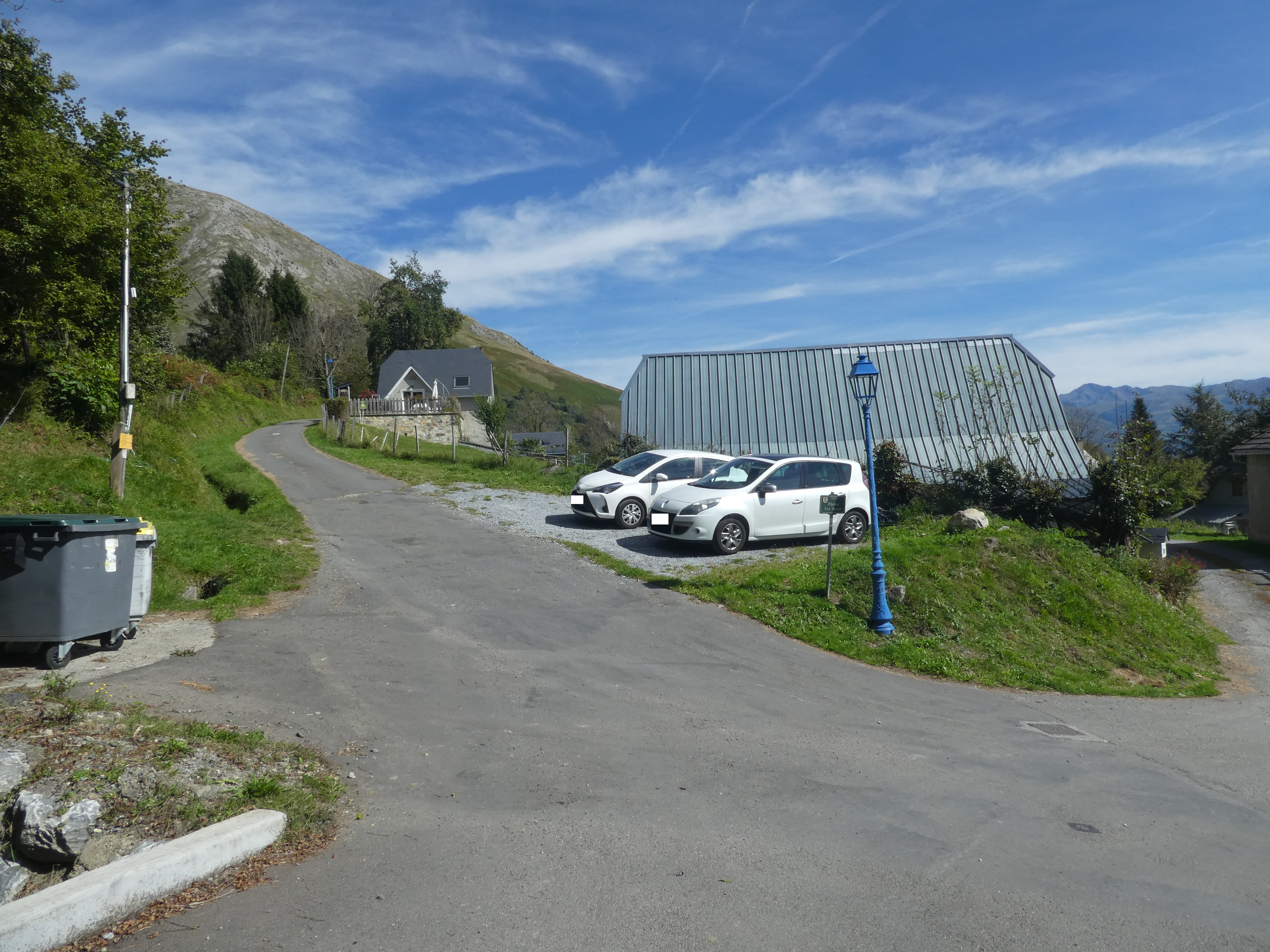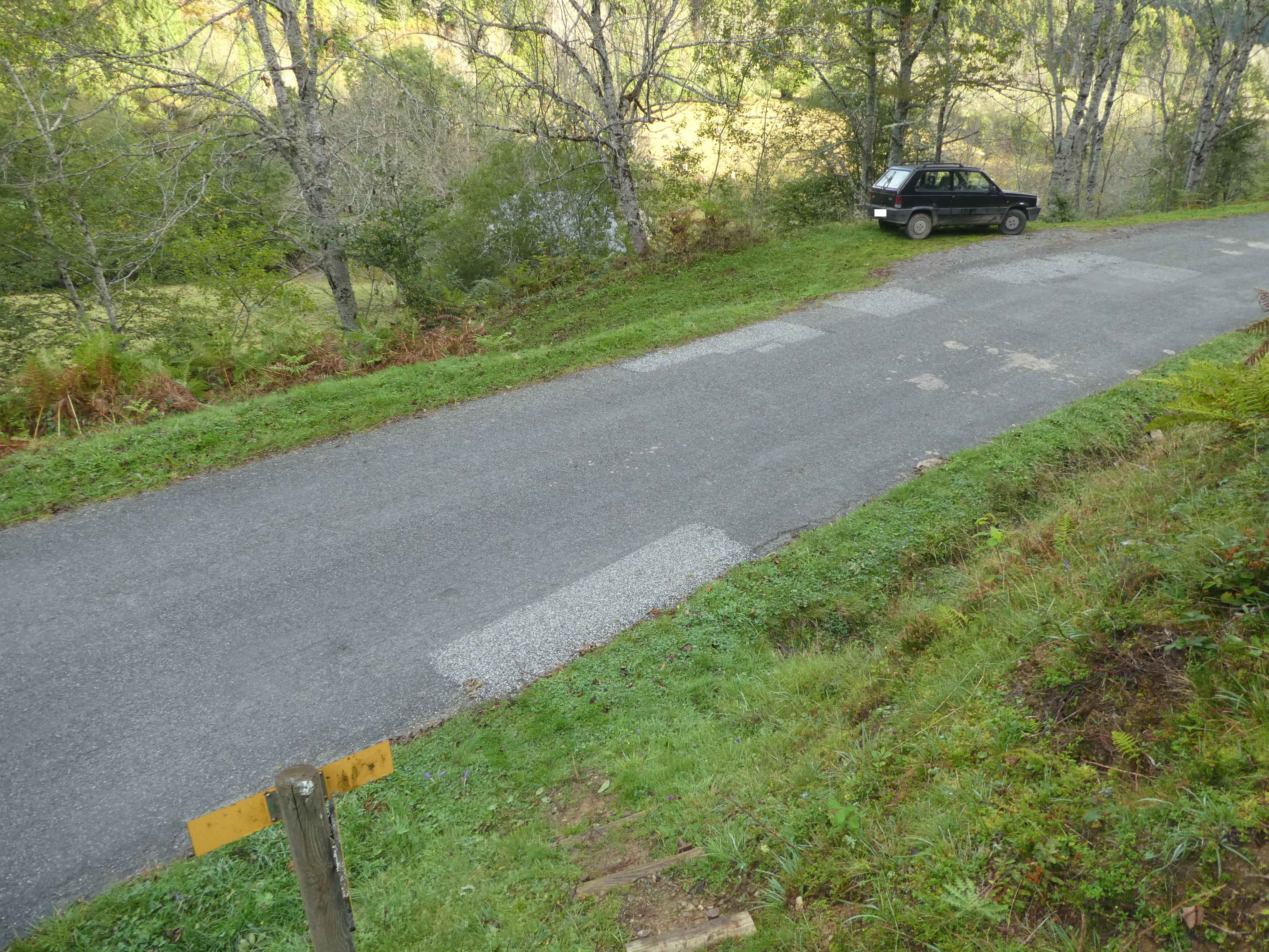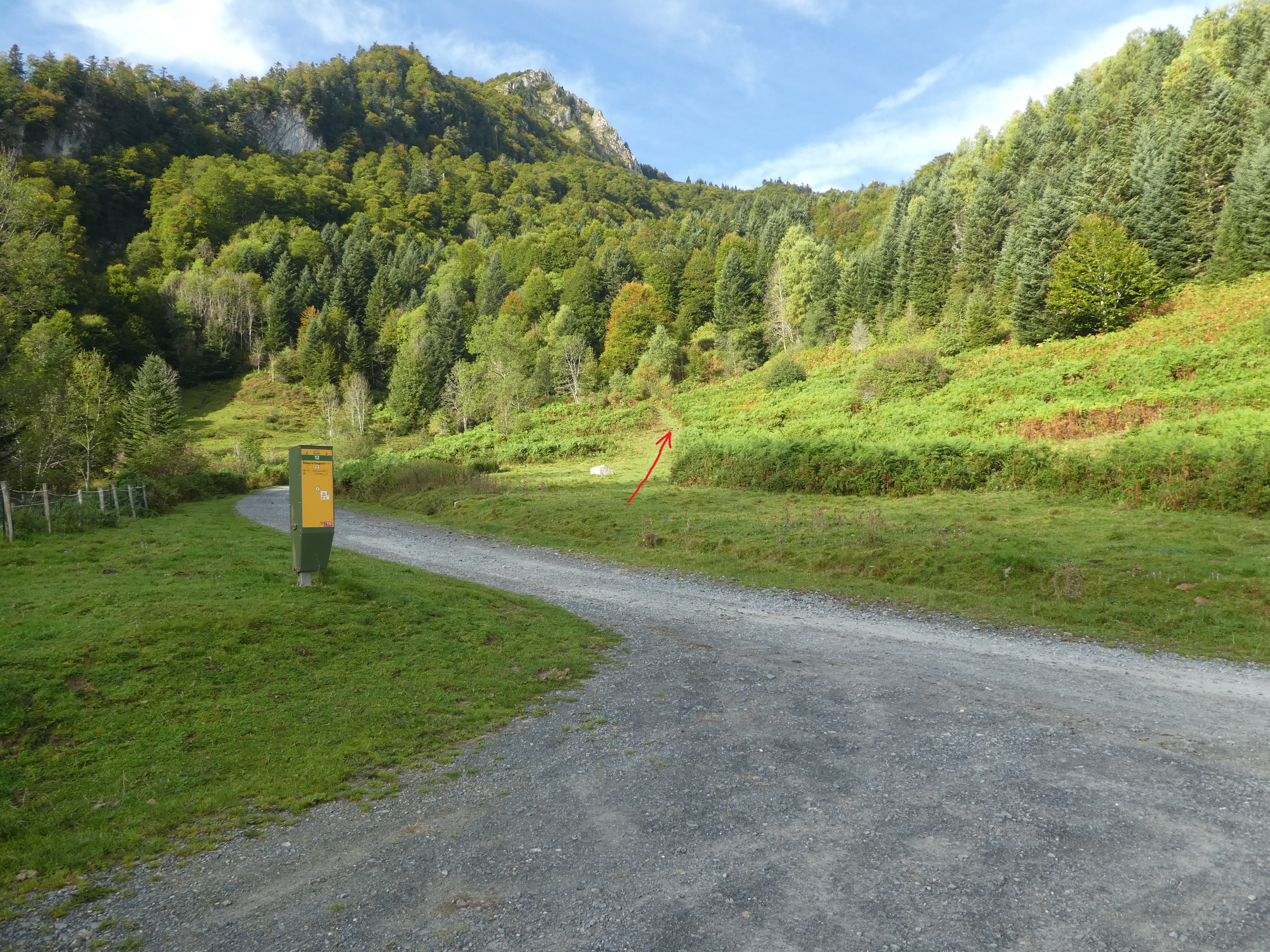A ce croisement marqué par la présence d'un panneau directionnel (450 mètres après le Col de Couraduque), suivre le chemin partant sur la gauche et longeant le parking direction Aucun