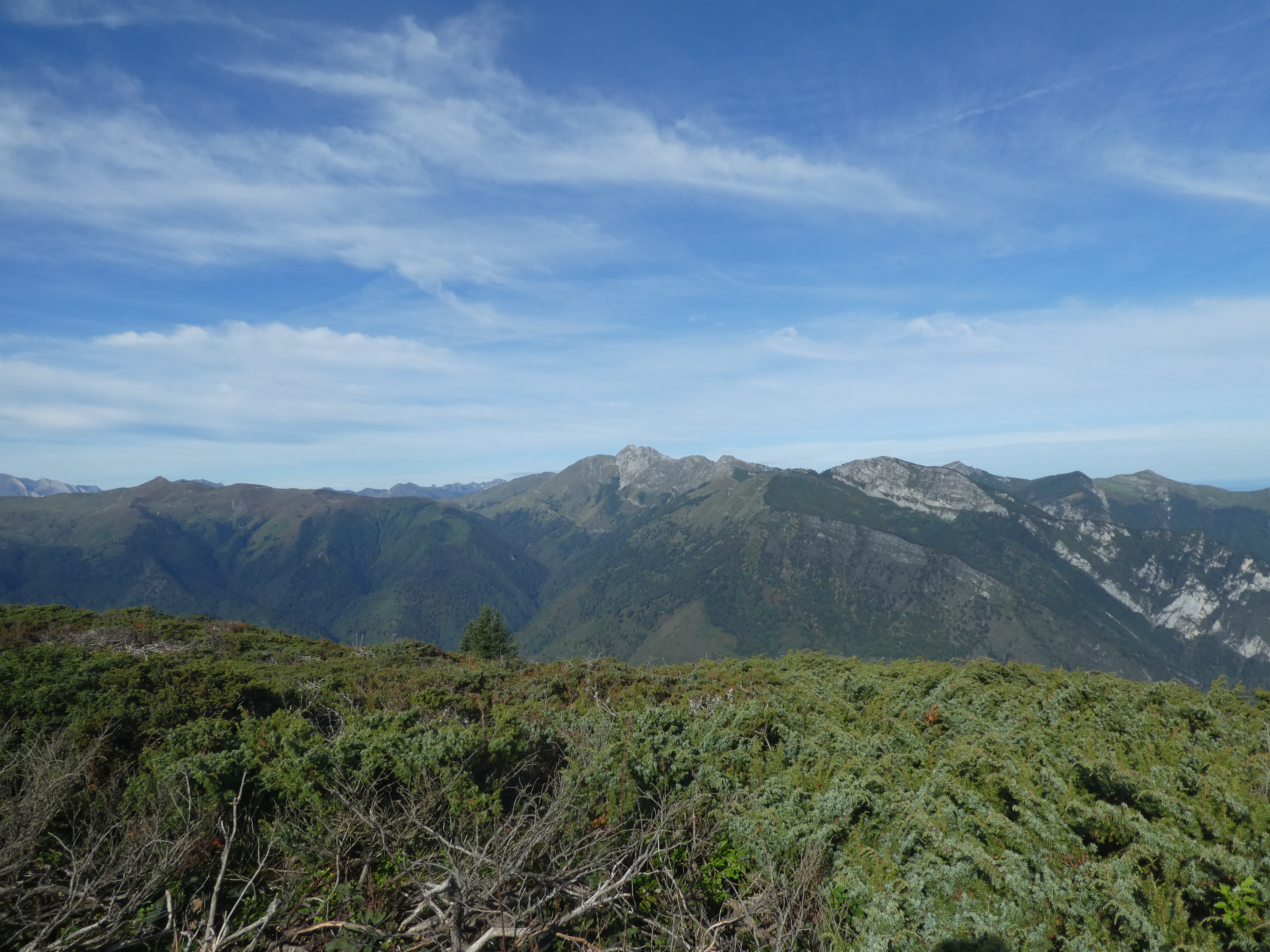 Arrivée au sommet du Pic de Navaillo (1666 m) : beau panorama sur le Pic de l'Estibète, le Soum de Granquet, le Soum de la Pène, le Montaigu, le Midi de Bigorre, le Néouvielle, le Pic Long, le Cabaliros, l'Ardiden, le Moun Né, le Grand Barbat, le Midi d'Arrens, le Pic de Bazès, les Gabizos, le Pic de Ger, le Sesques, le Soum de Grum, la Moulle de Jaüt ainsi que sur la Vallée de l'Ouzom, du Bergons et la plaine