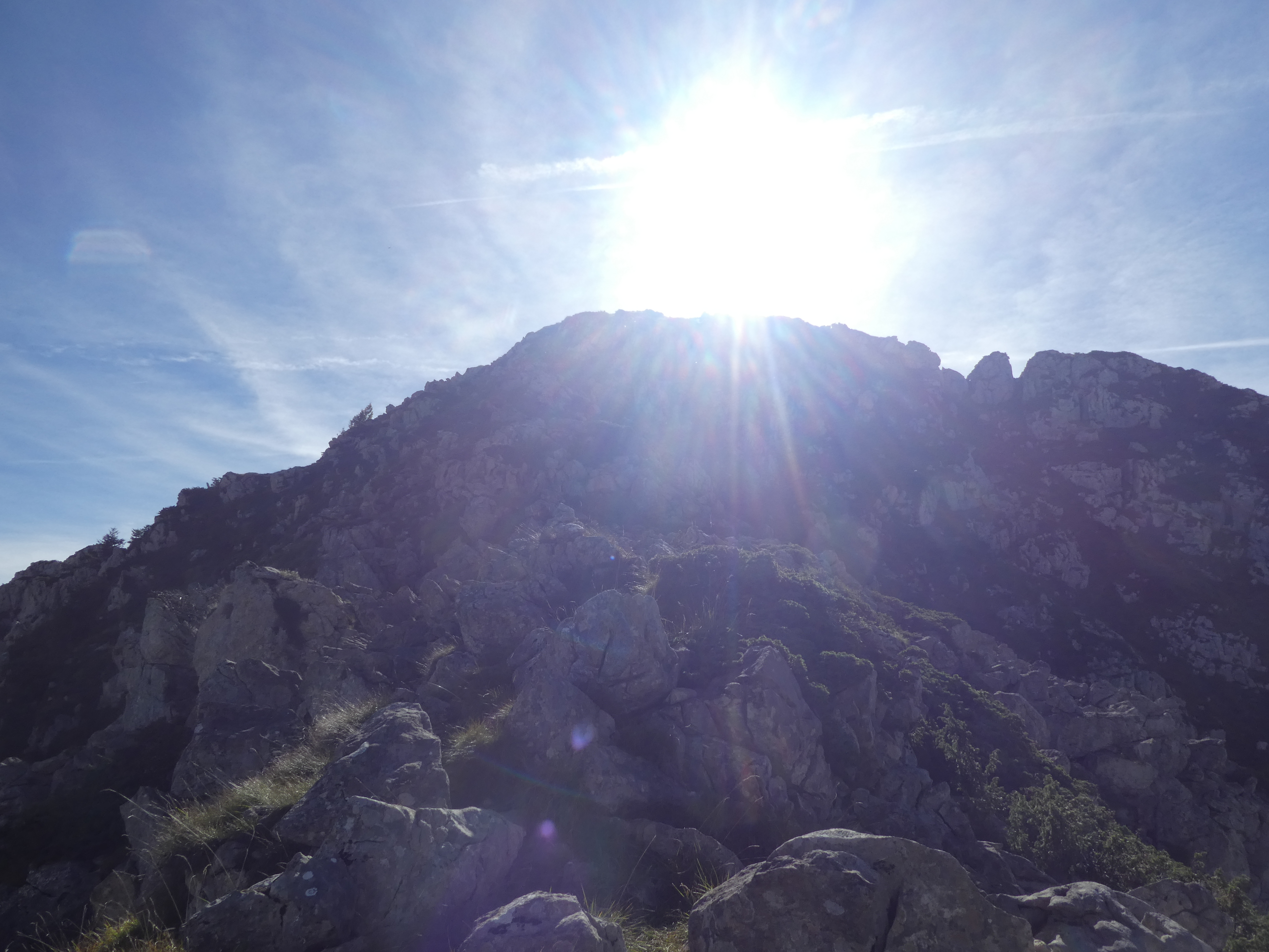 Vue à contrejour de la crête composée de blocs rocheux : bien suivre les quelques cairns pour parvenir jusqu'au sommet direction Pic de Bazès