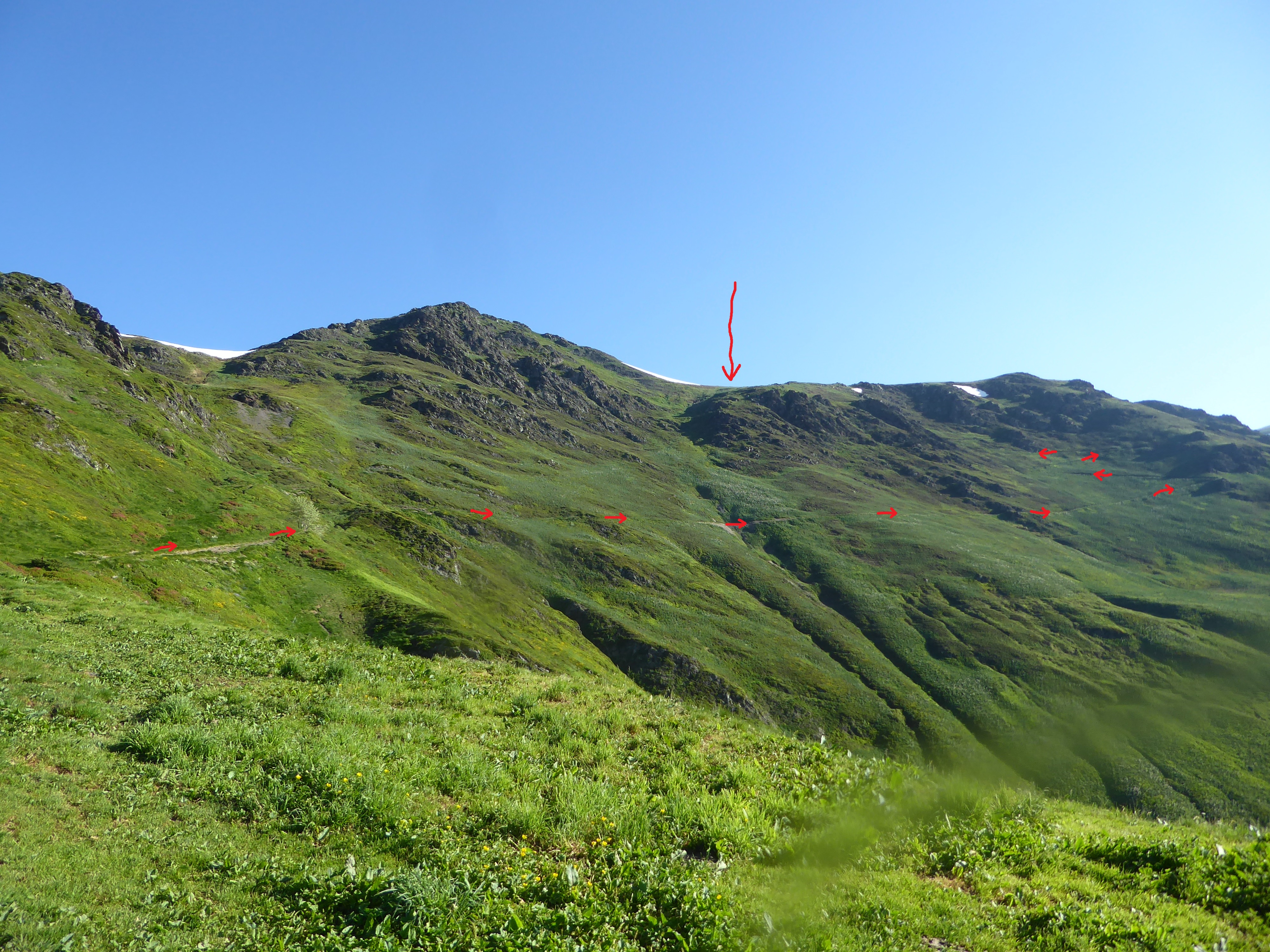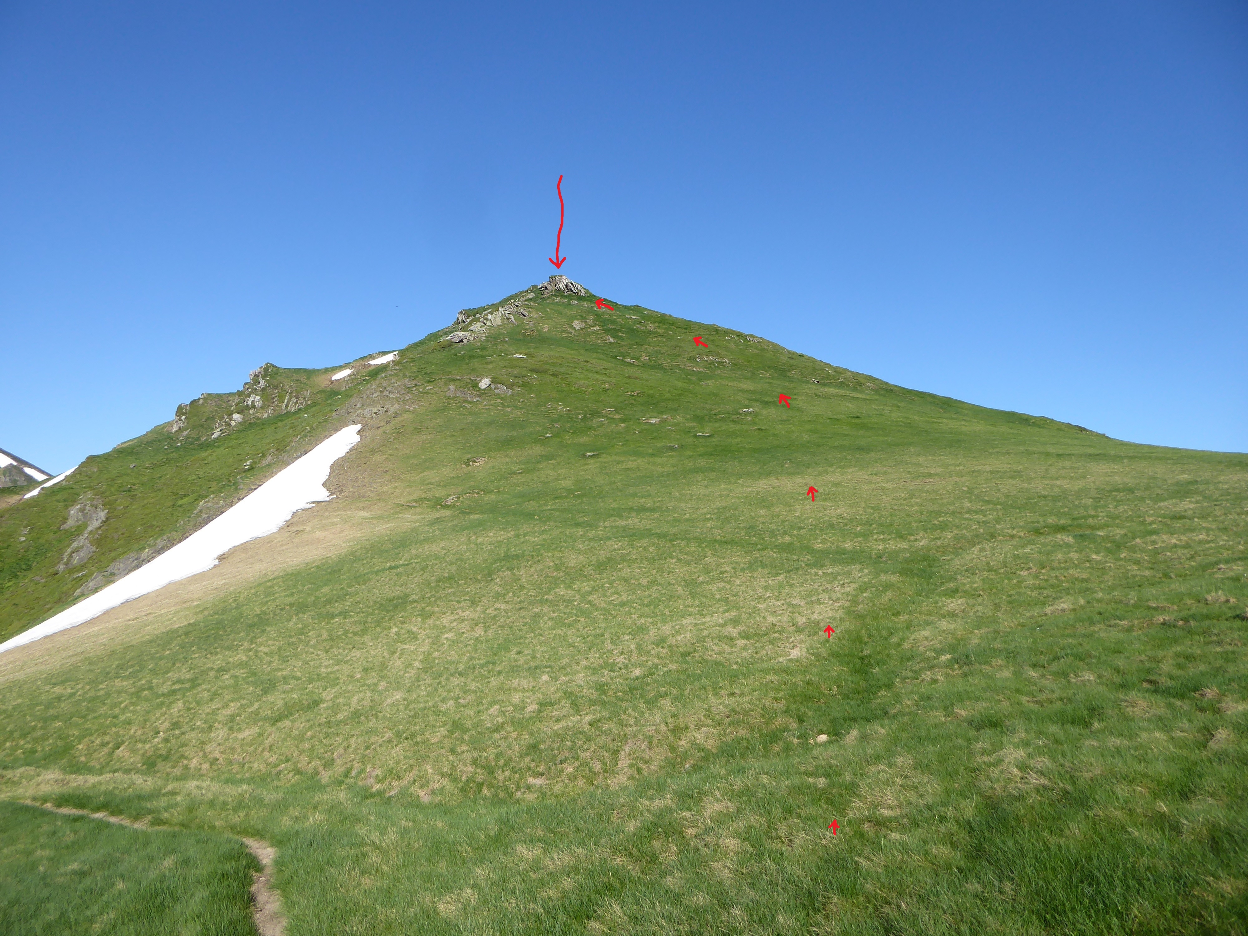 Col de Contente (2149 m) : monter à vue sur la gauche vers le Tuc de Labasse direction Tuc de Labasse (si vous ne voulez pas y aller, continuer à suivre le sentier bien tracé partant tout droit vers le Pic du Cabaliros)
