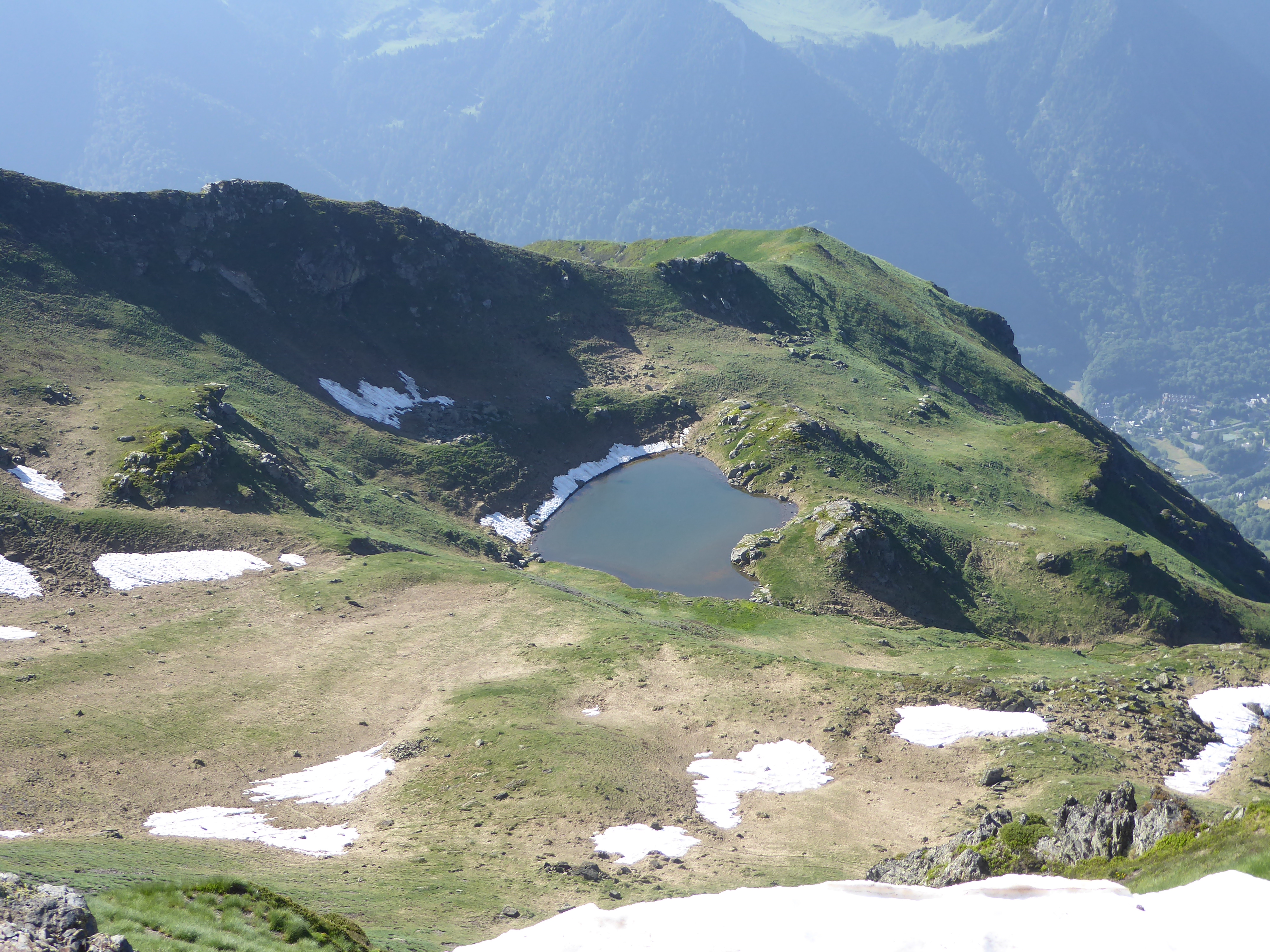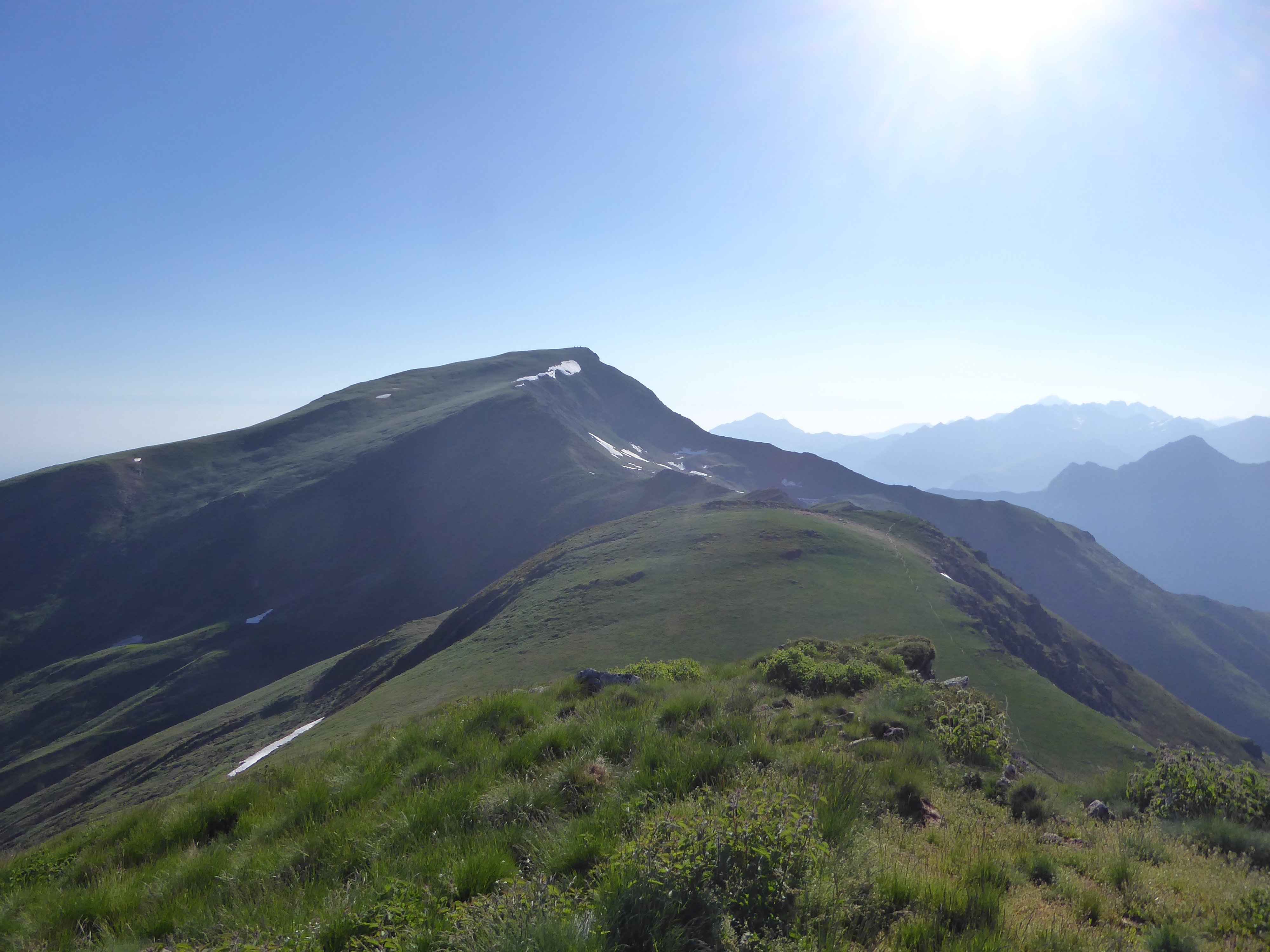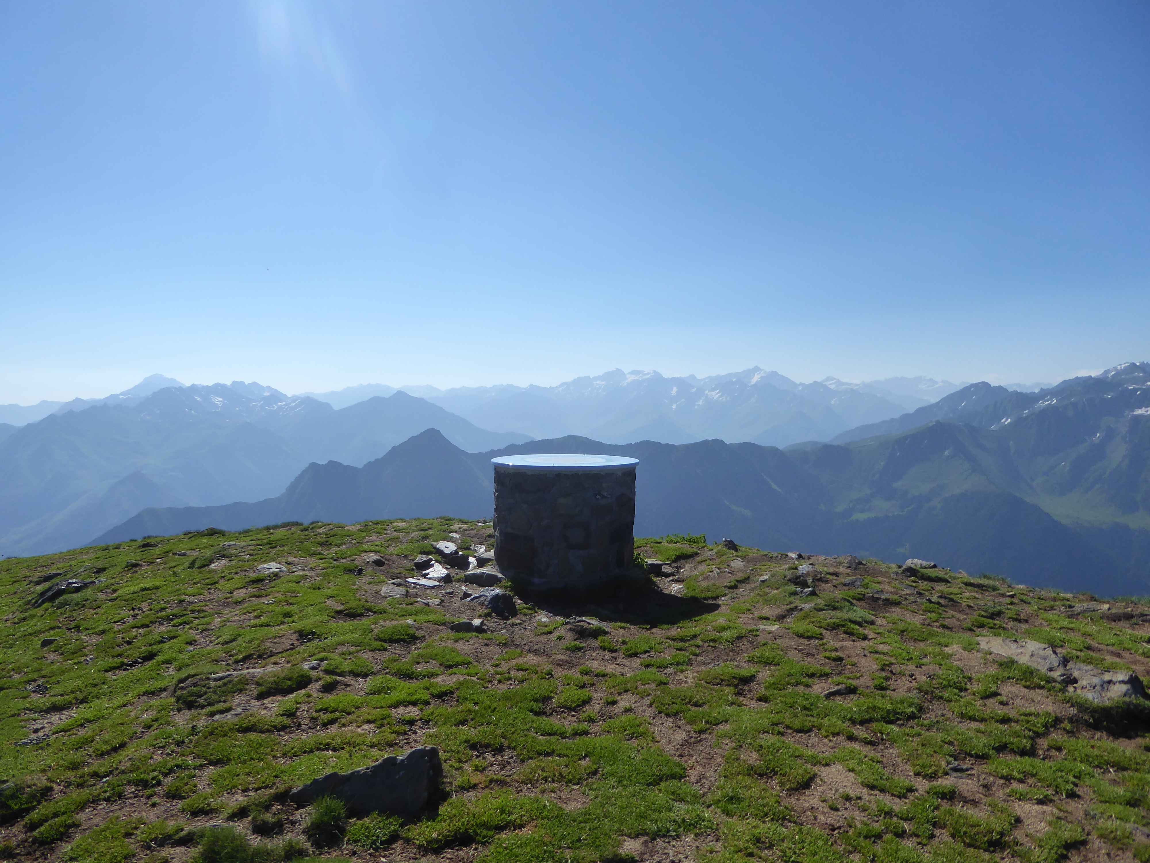 Arrivée au sommet du Tuc de Labasse (2201 m) : très beau panorama sur les sommets bigourdans et sur les premiers sommets des Pyrénées-Atlantiques ... de la brume de chaleur en direction de la plaine !