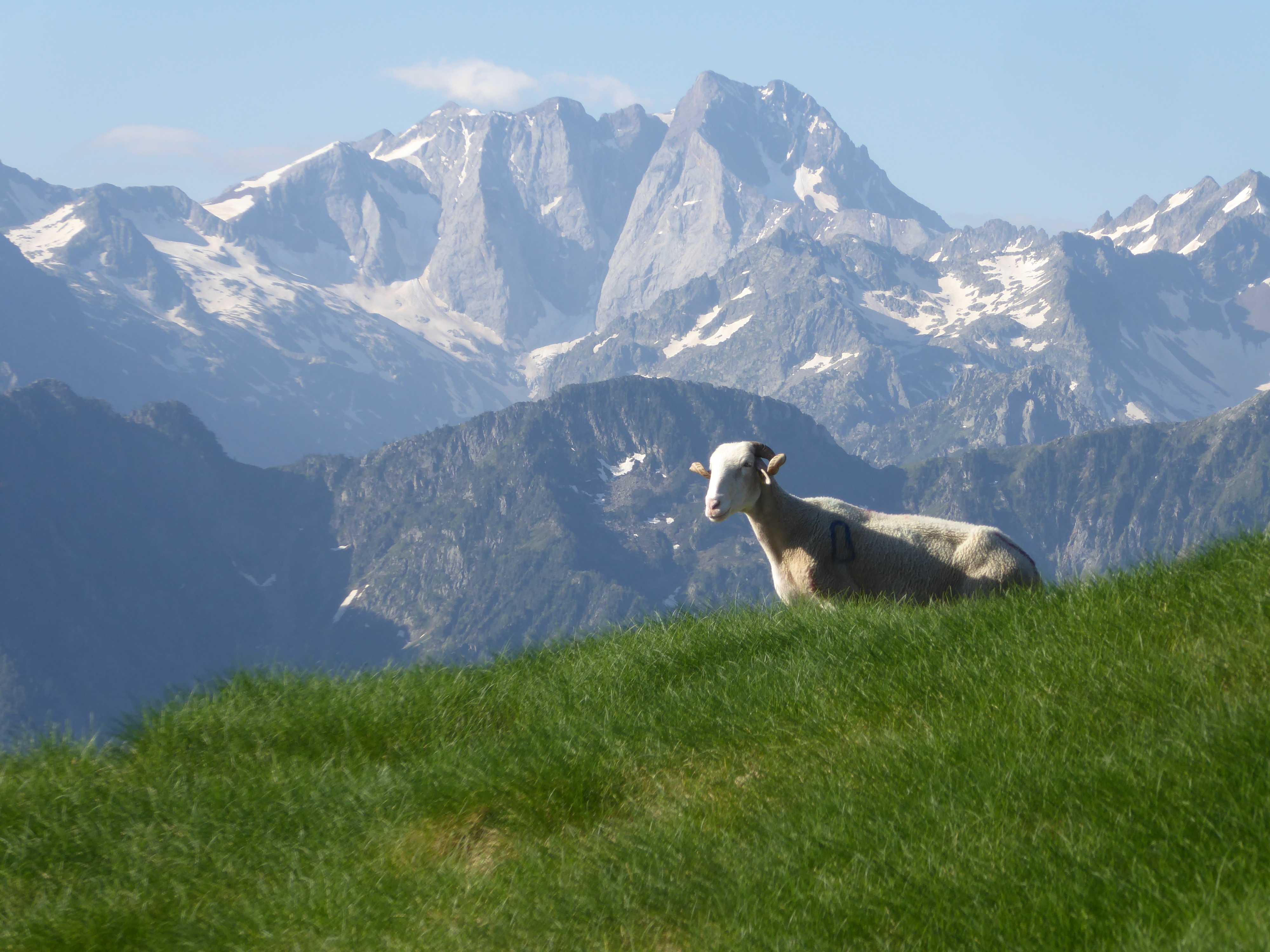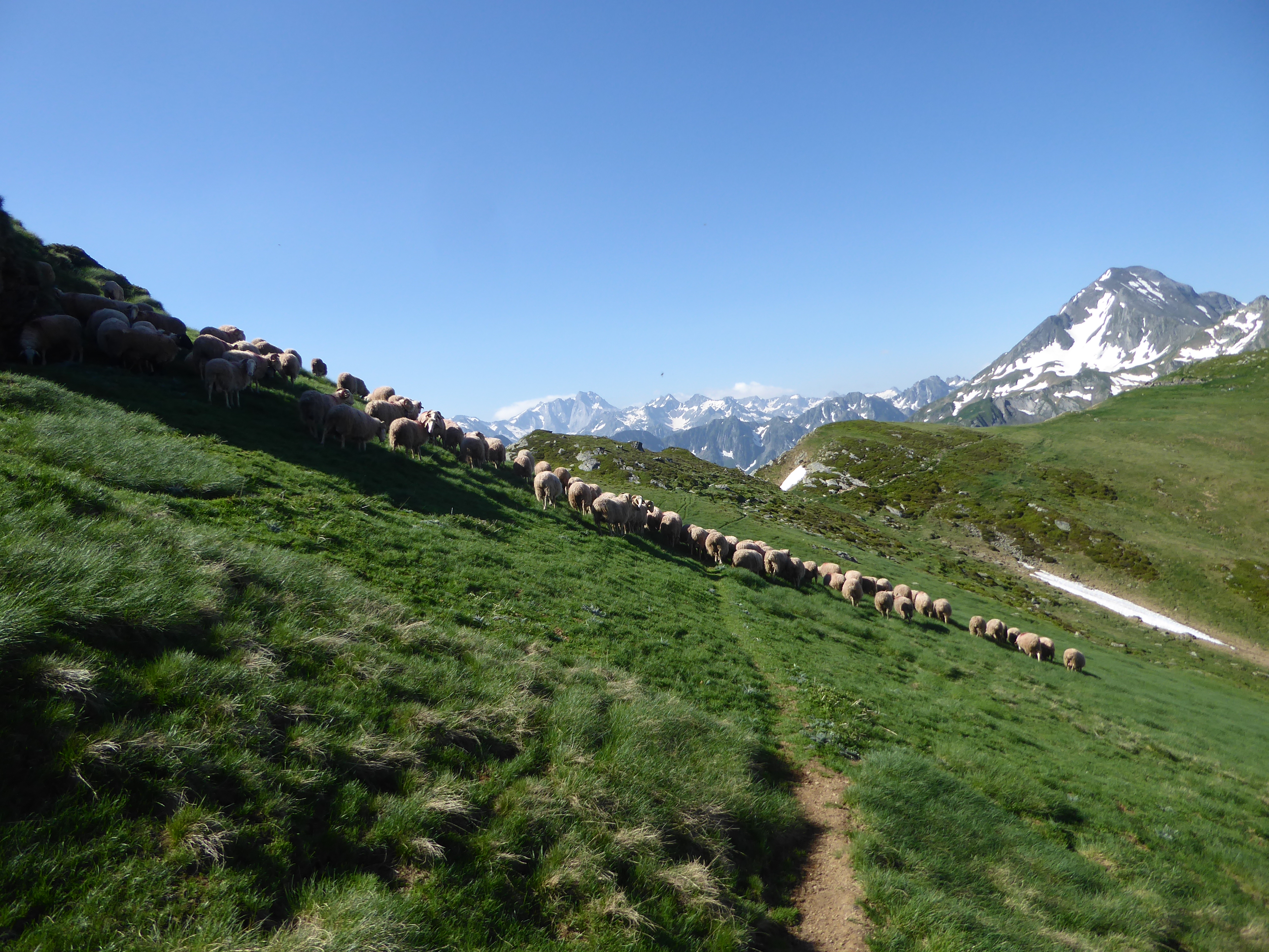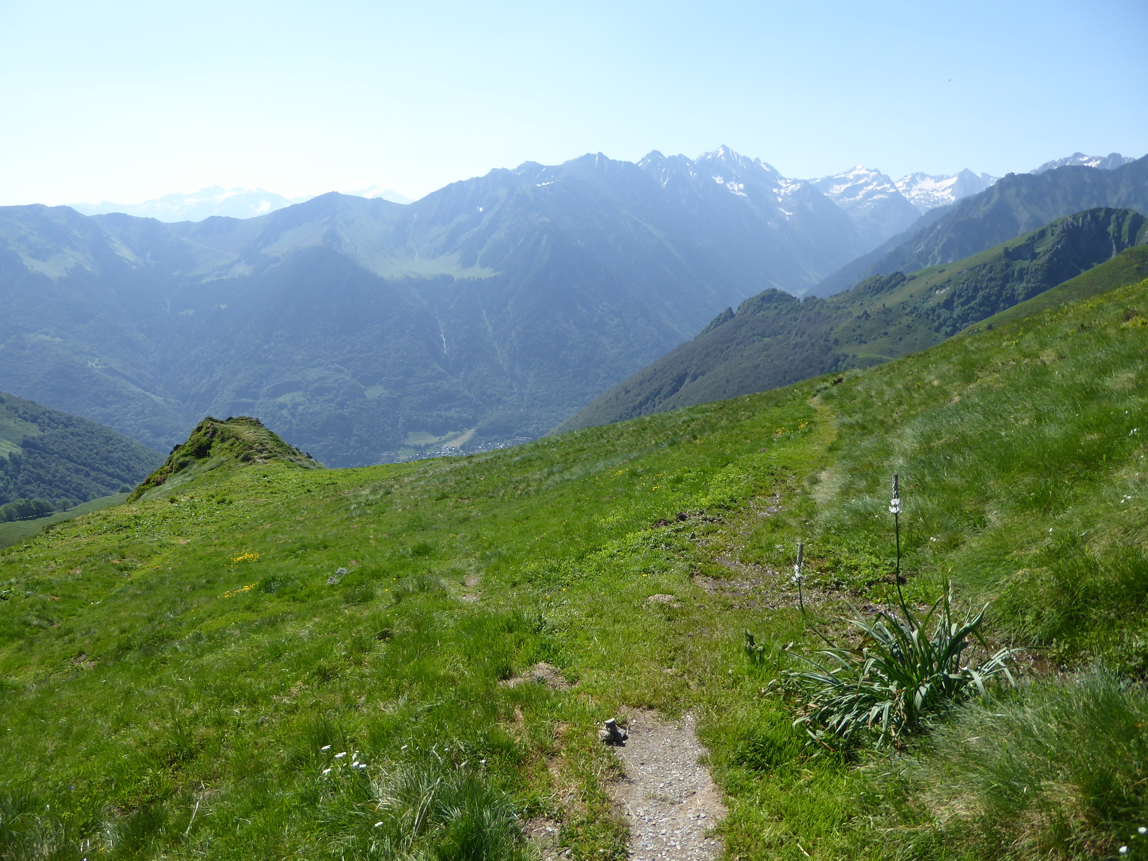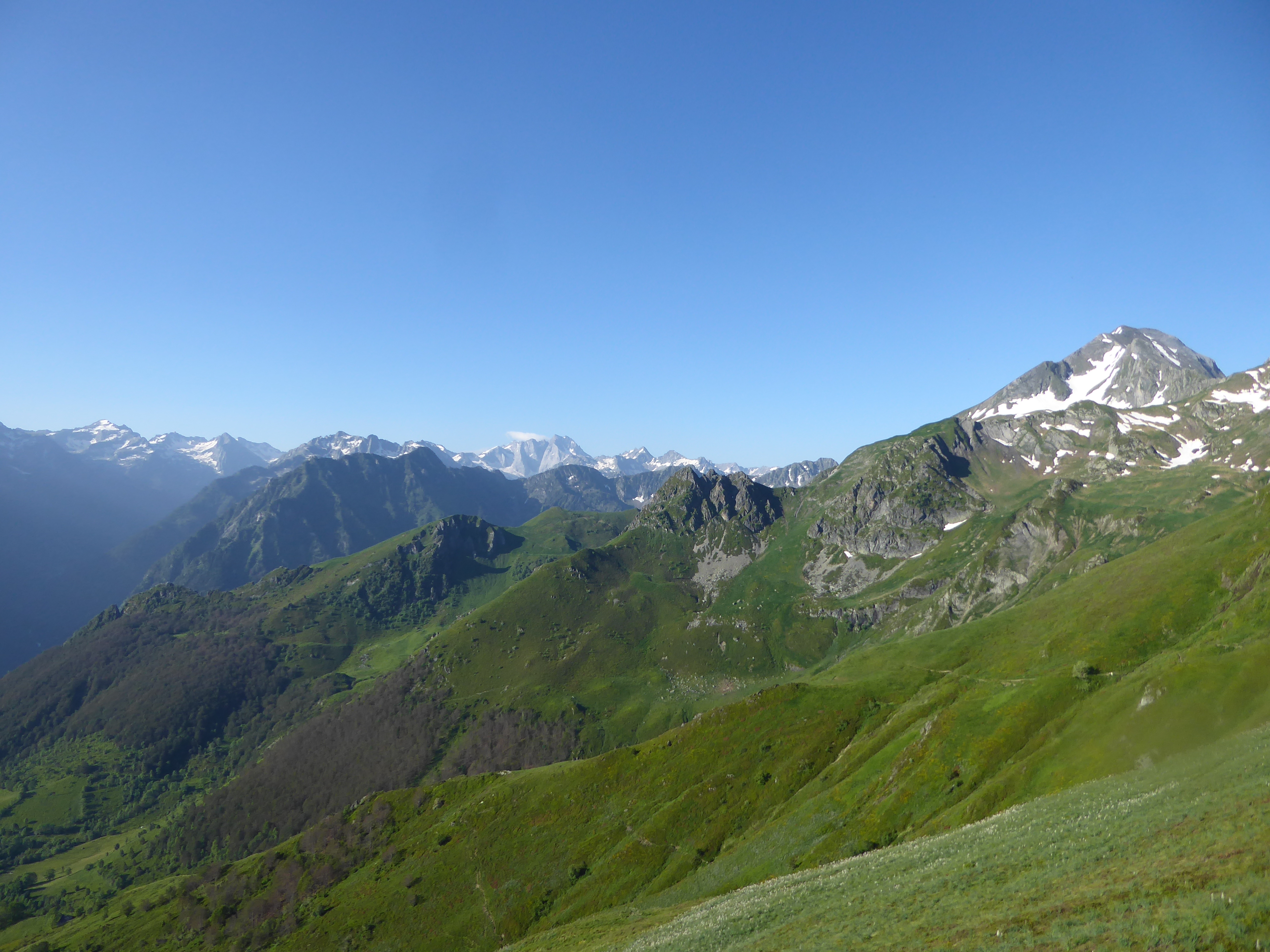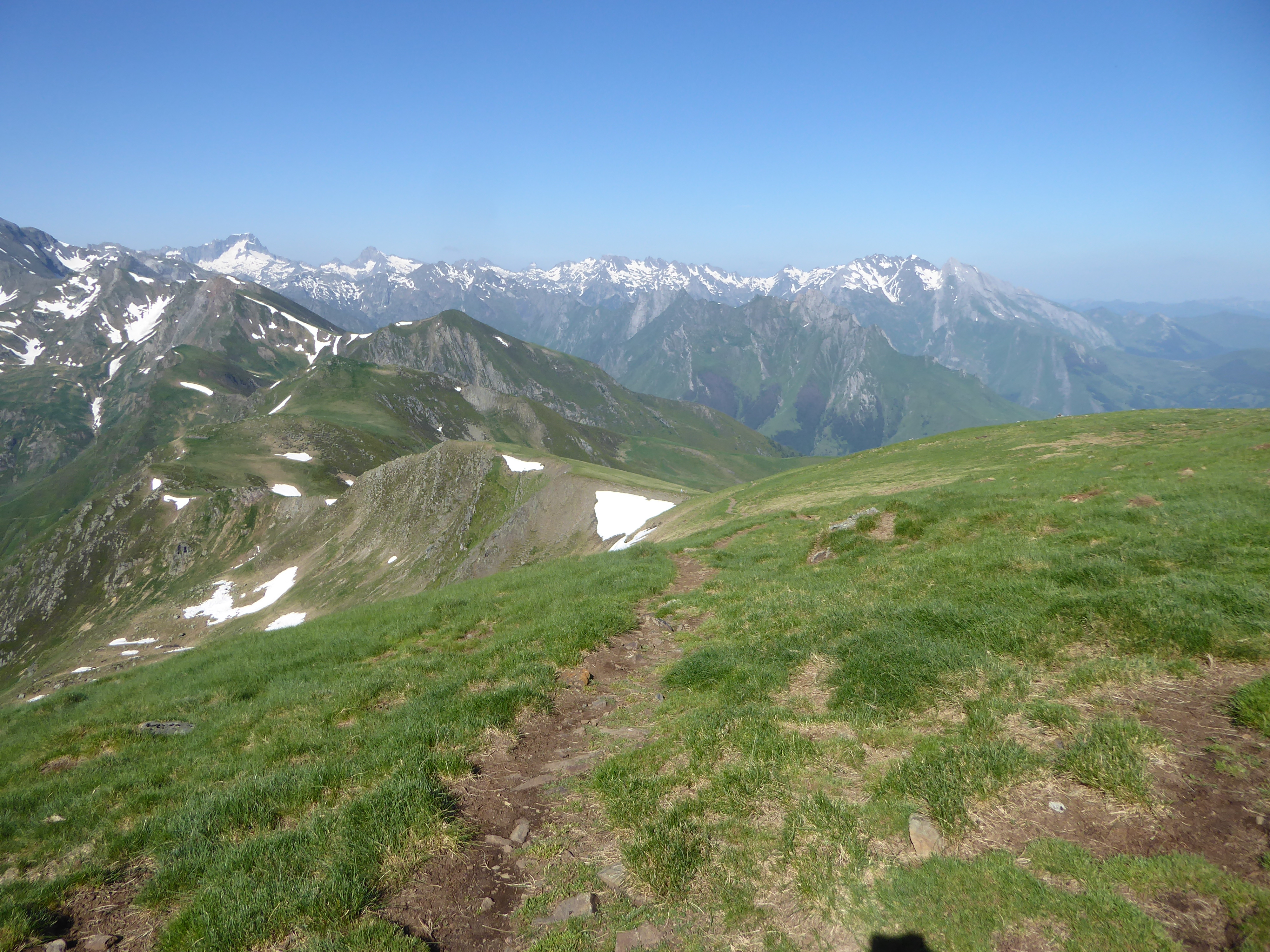 La vue se dégage sur les hauts sommets bigourdans ; ici du Pic de Cestrède jusqu'au Moun Né en passant par le Vignemale