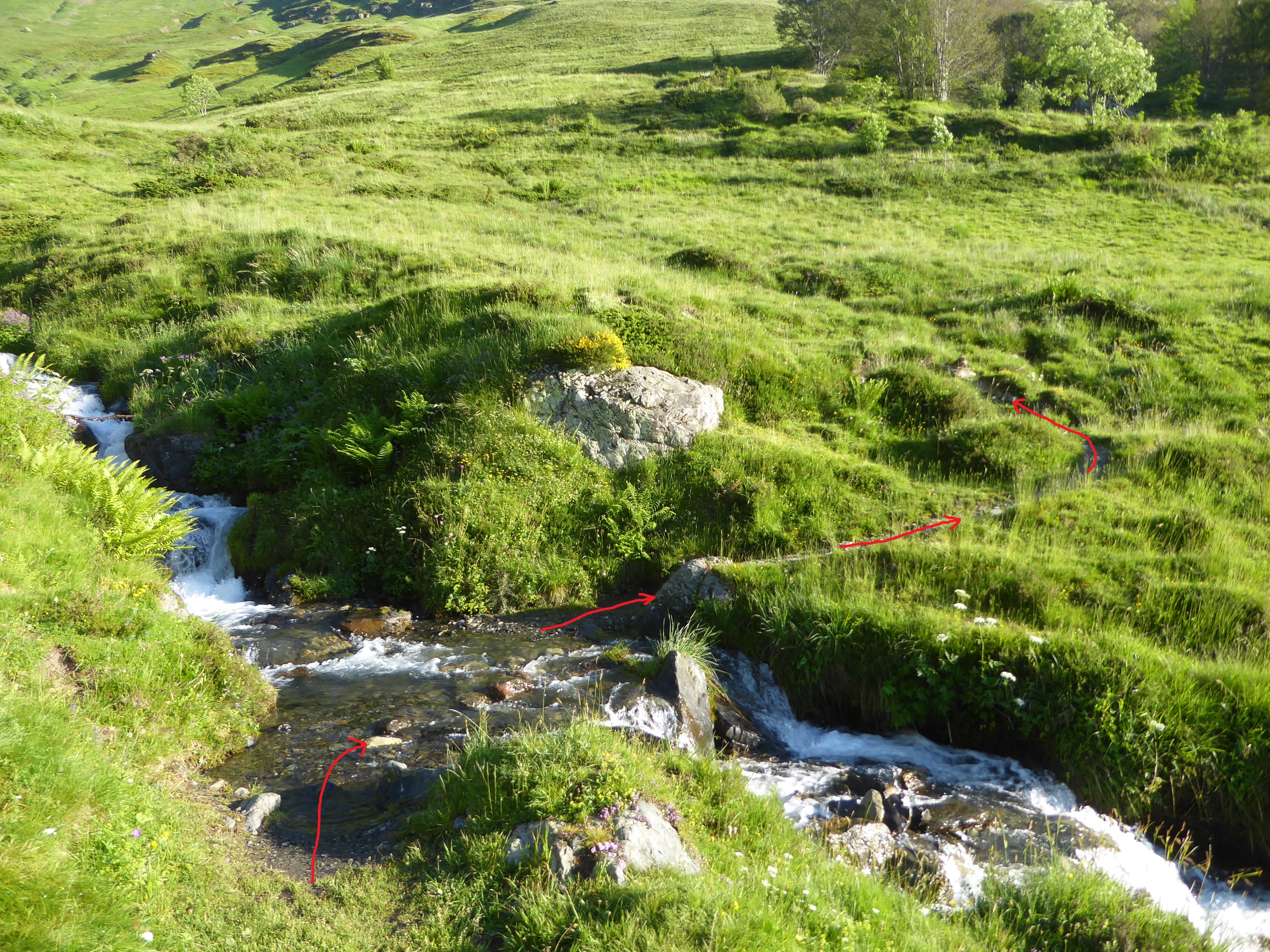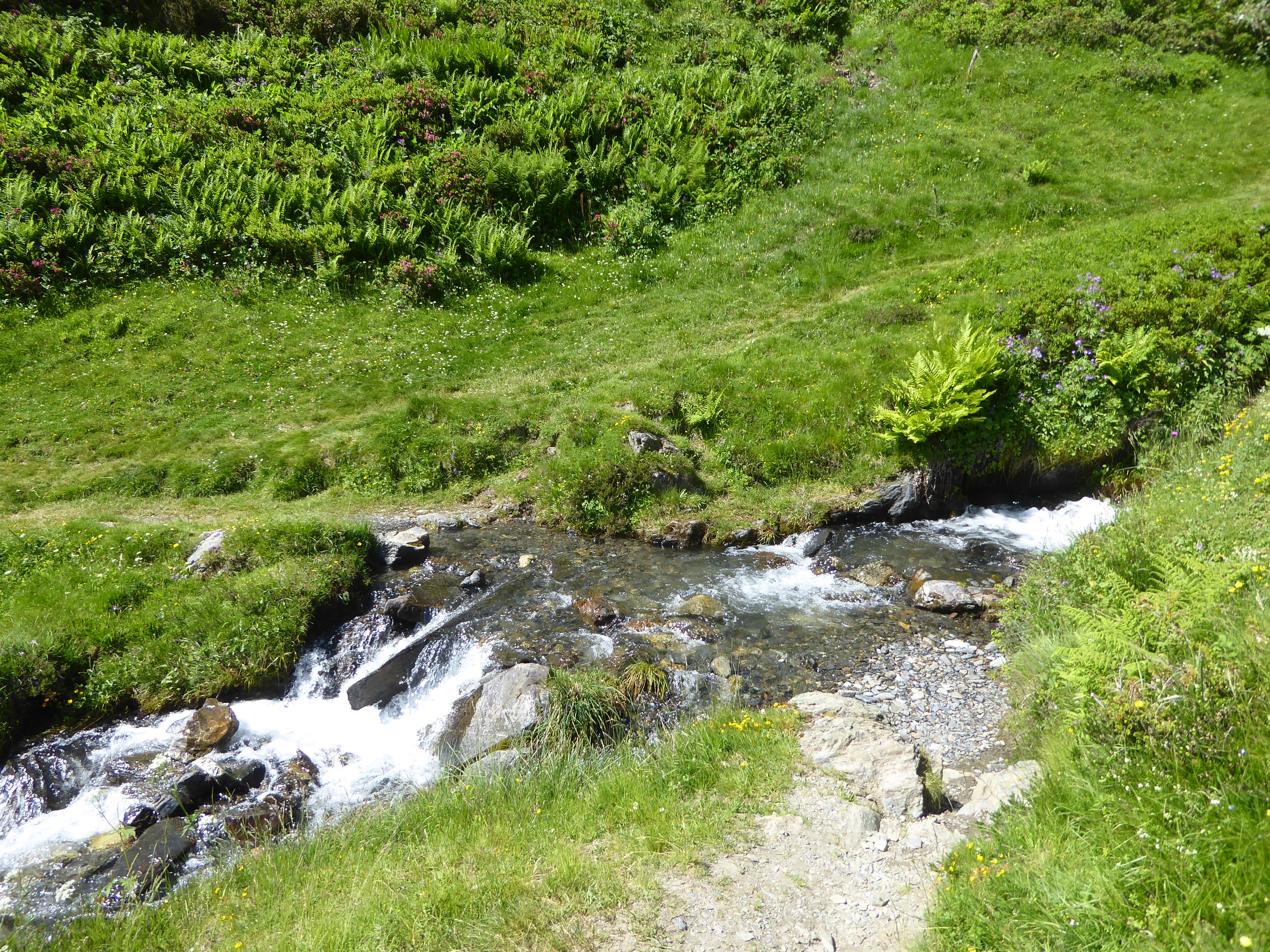 Ruisseau de Catarrabes (1566 m) : suivre le chemin traversant le torrent et partant sur la gauche direction Ferme Igau