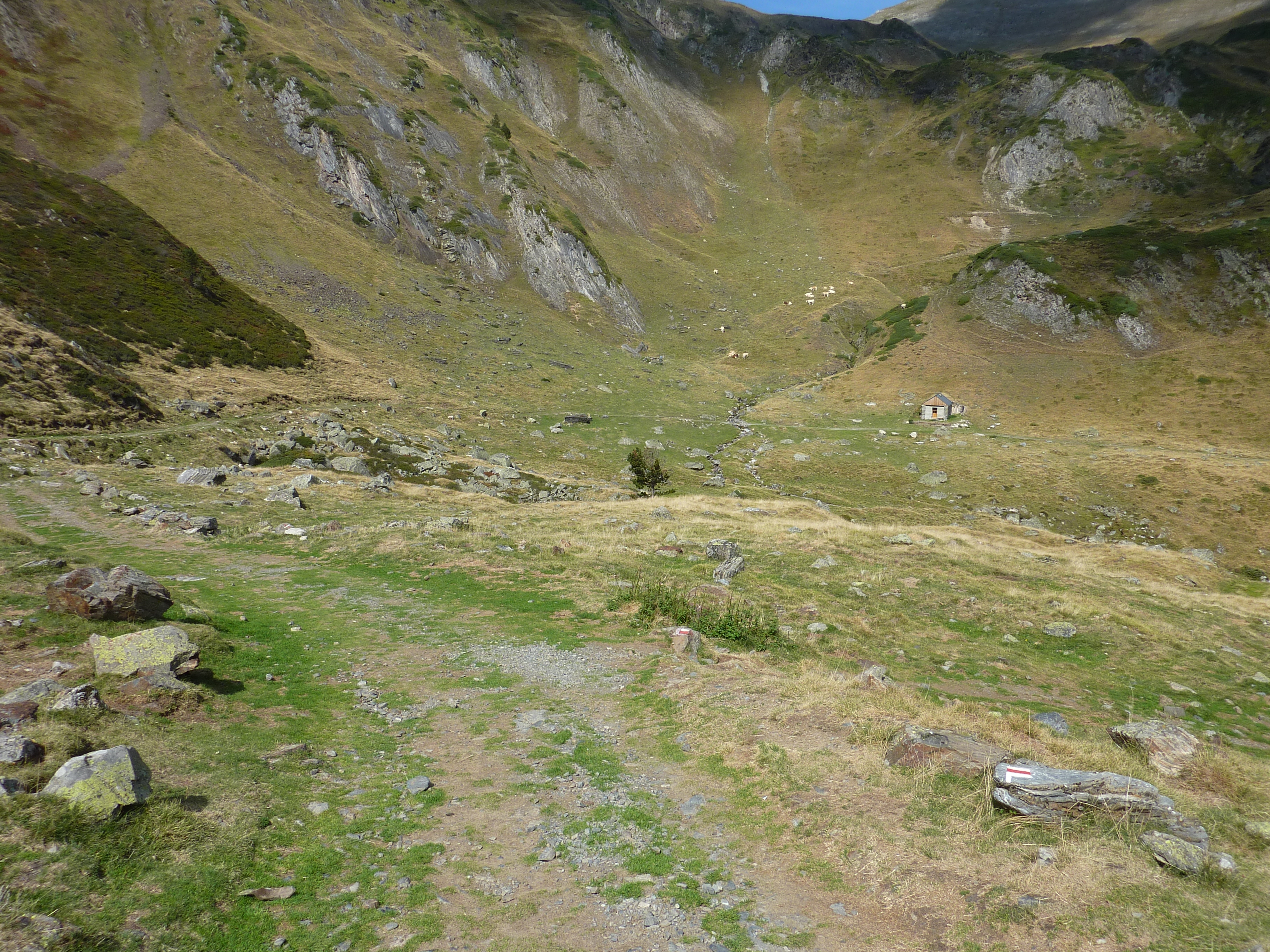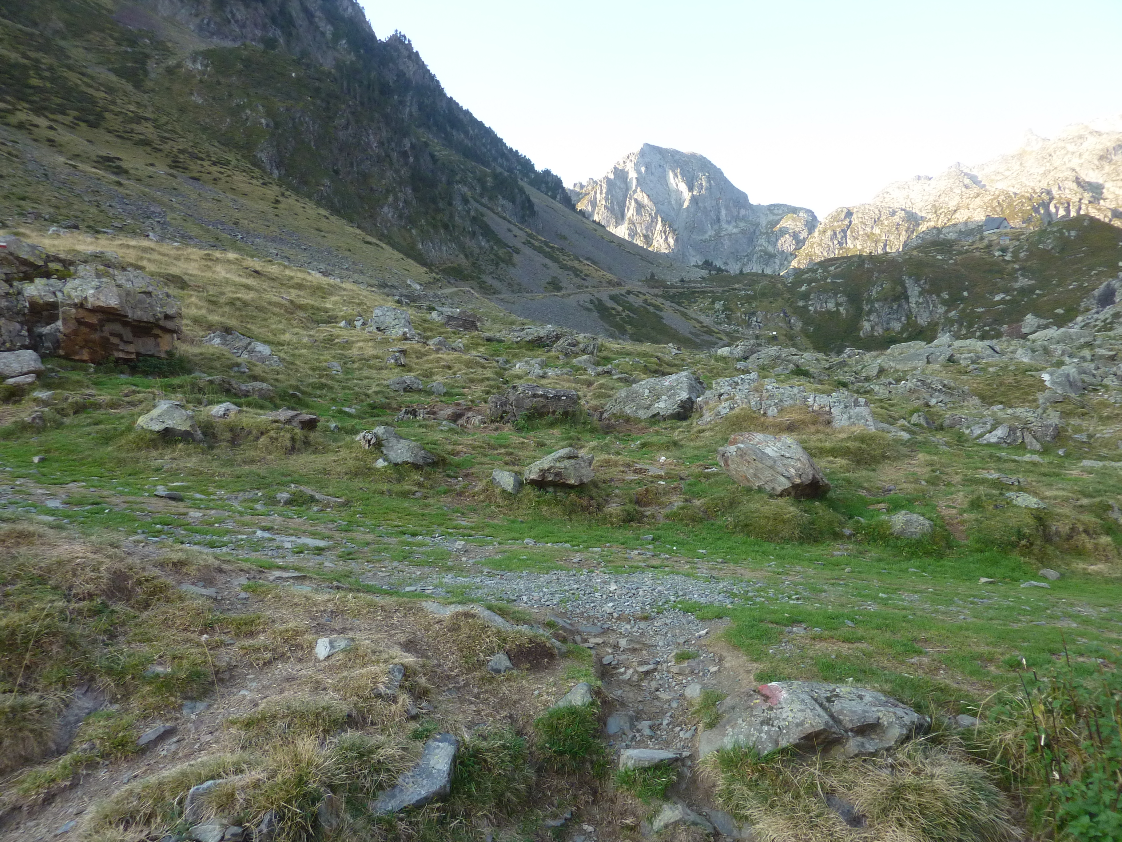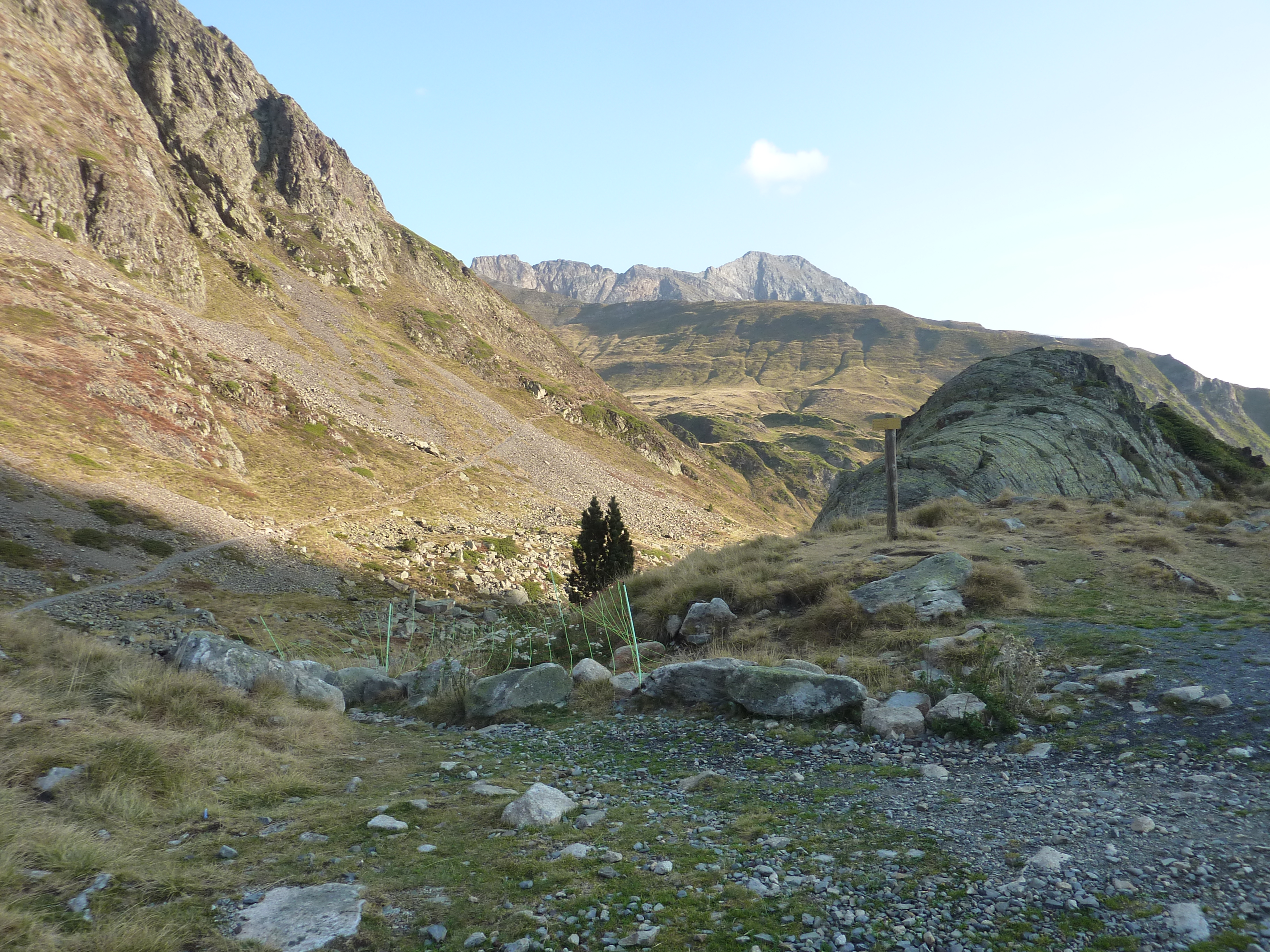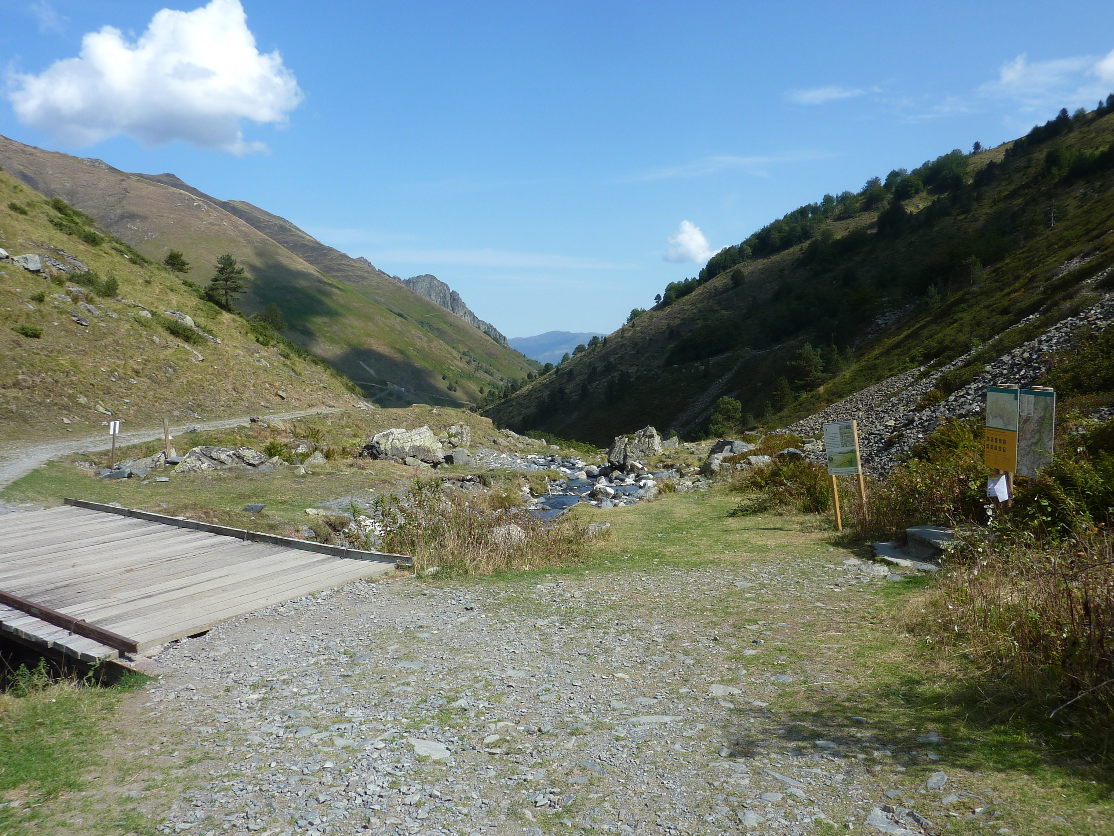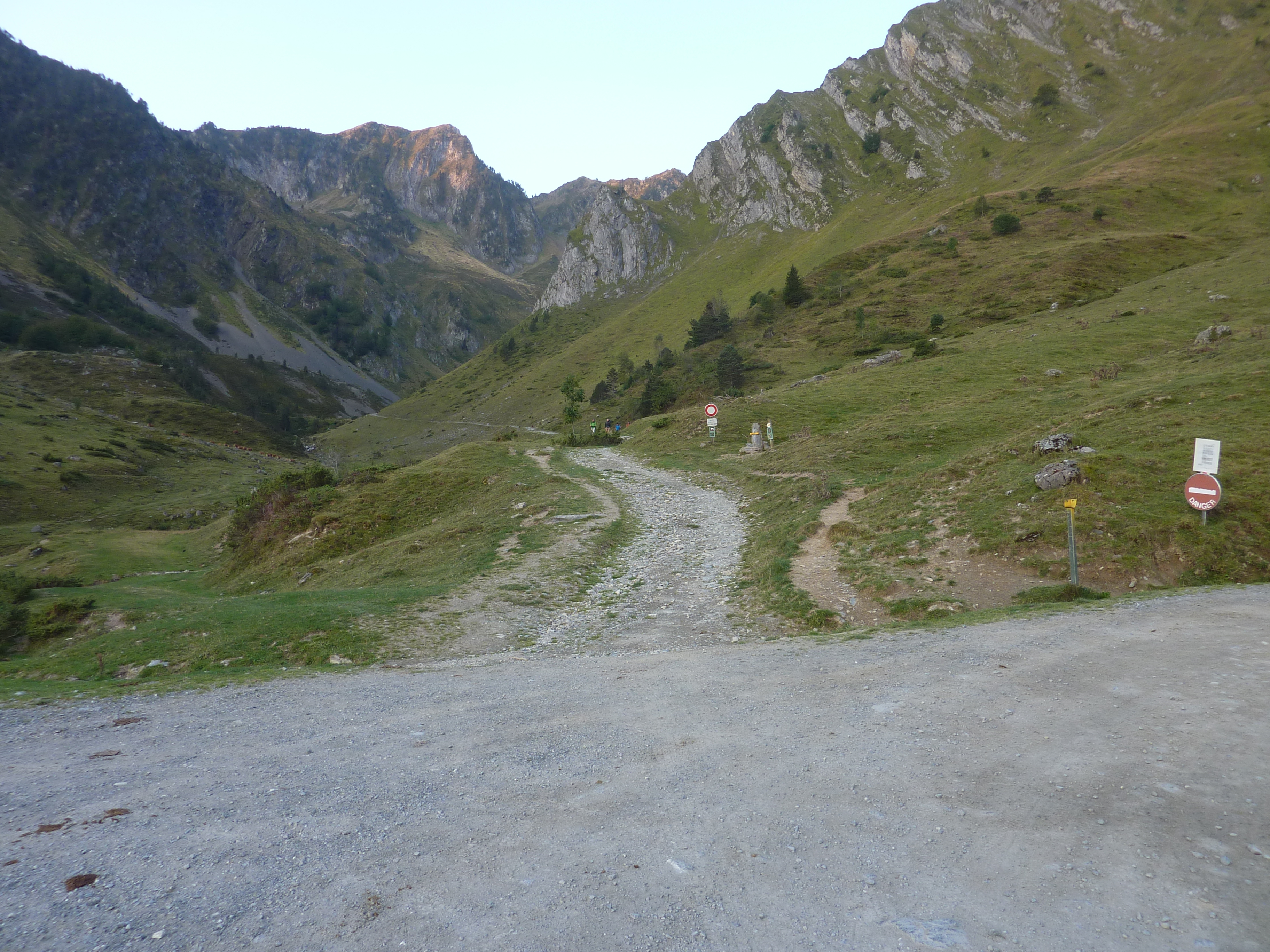 A ce croisement situé au niveau du Refuge d'Ilhéou et marqué par la présence d'un panneau directionnel, suivre le chemin partant sur la droite direction Parking du Cambasque, balisé en rouge et blanc (entrée dans le Parc National des Pyrénées)