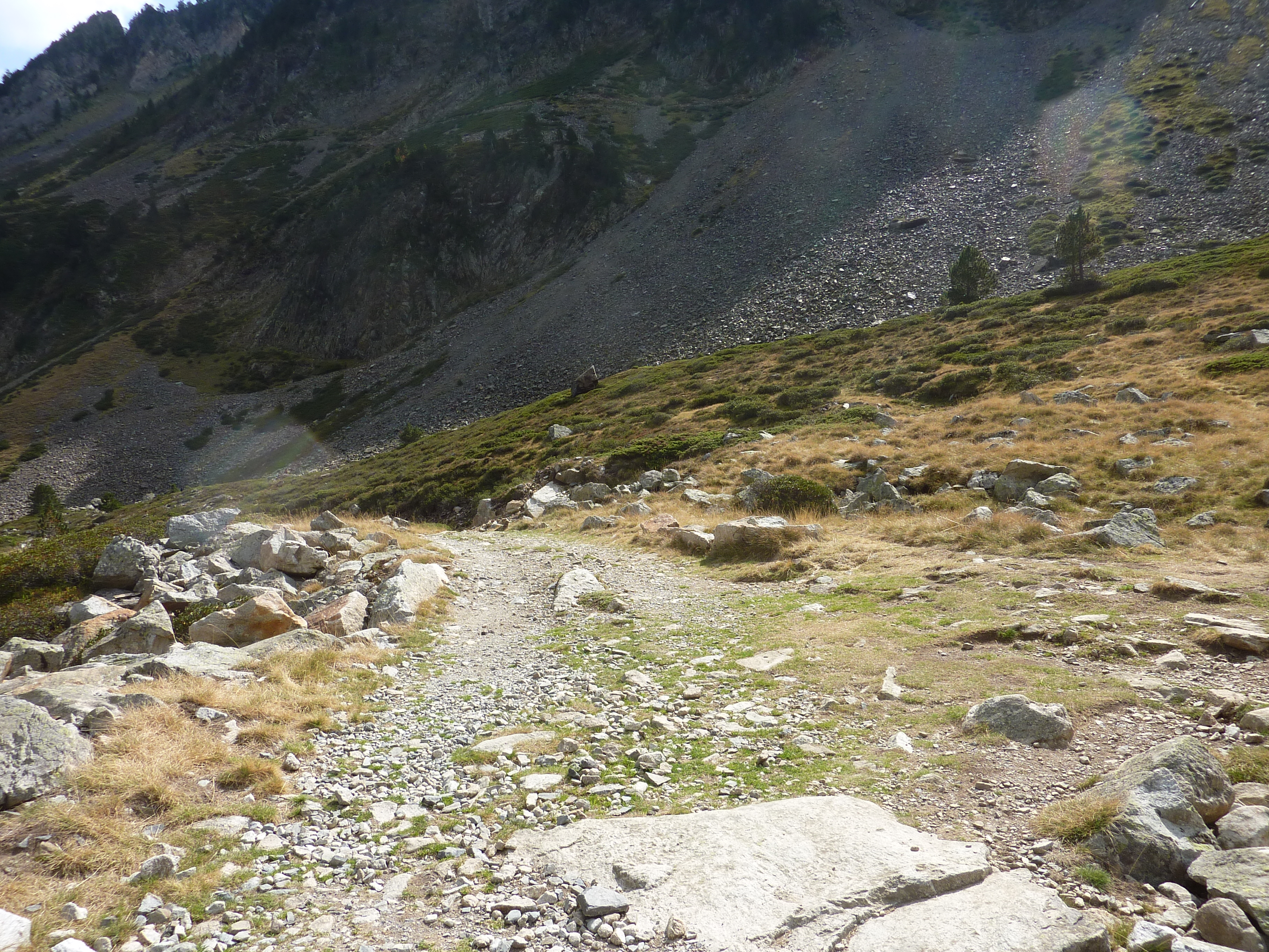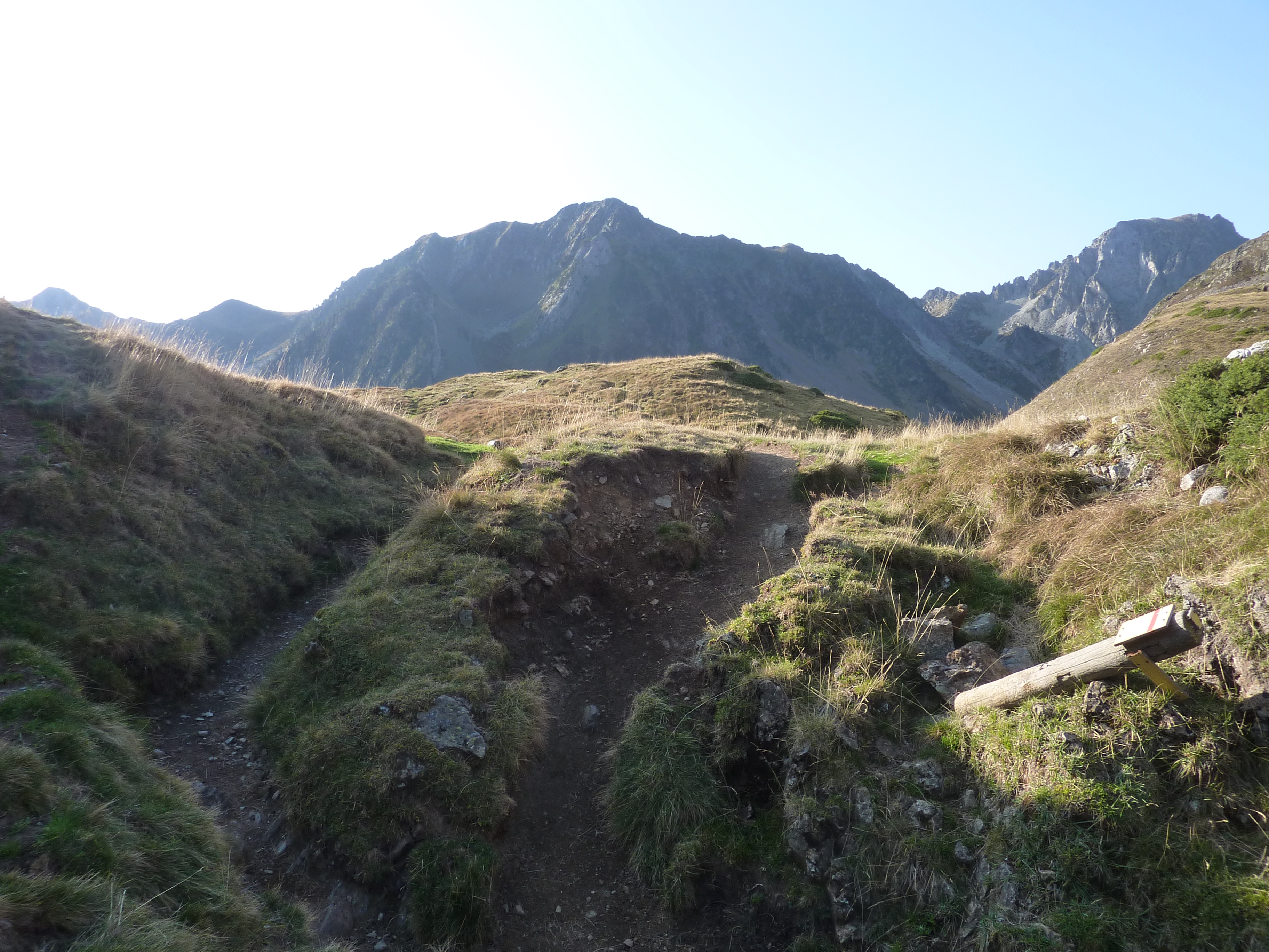 A ce croisement situé à proximité des Cabanes d'Arras (2197 m), suivre le chemin partant sur la droite puis celui partant sur la gauche direction Lac d'Ilhéou, balisé en rouge et blanc