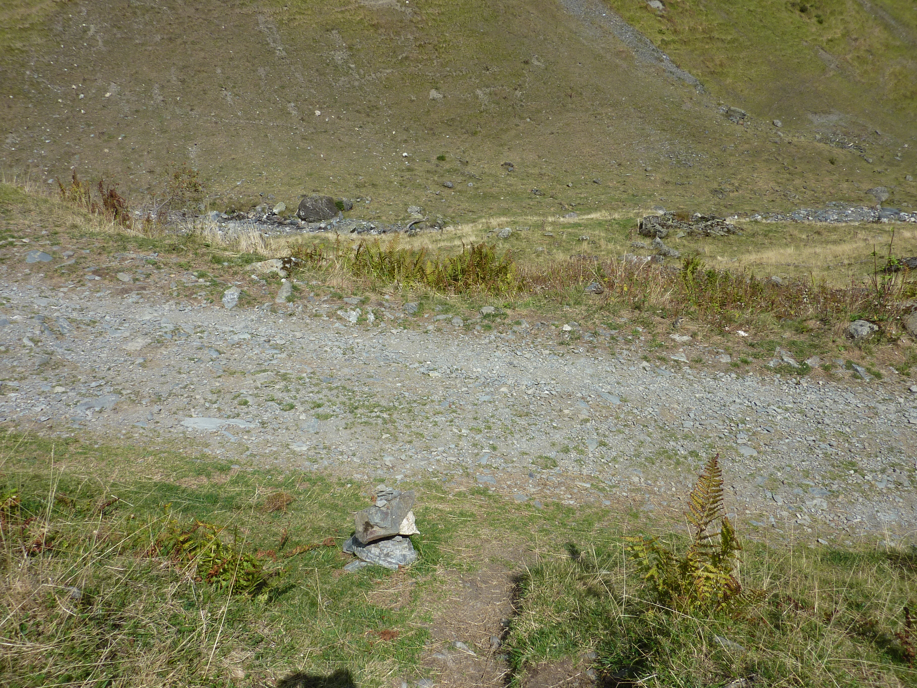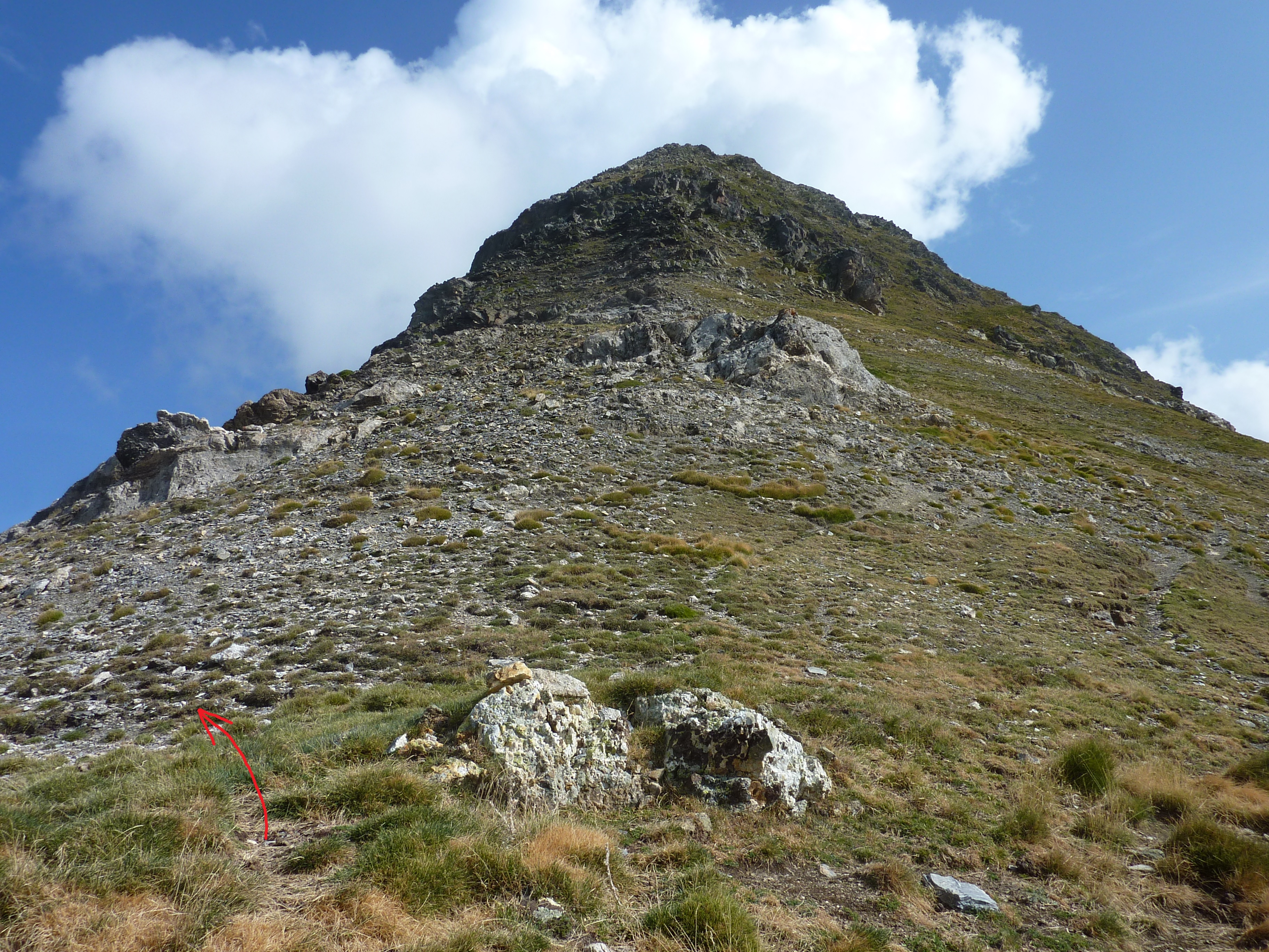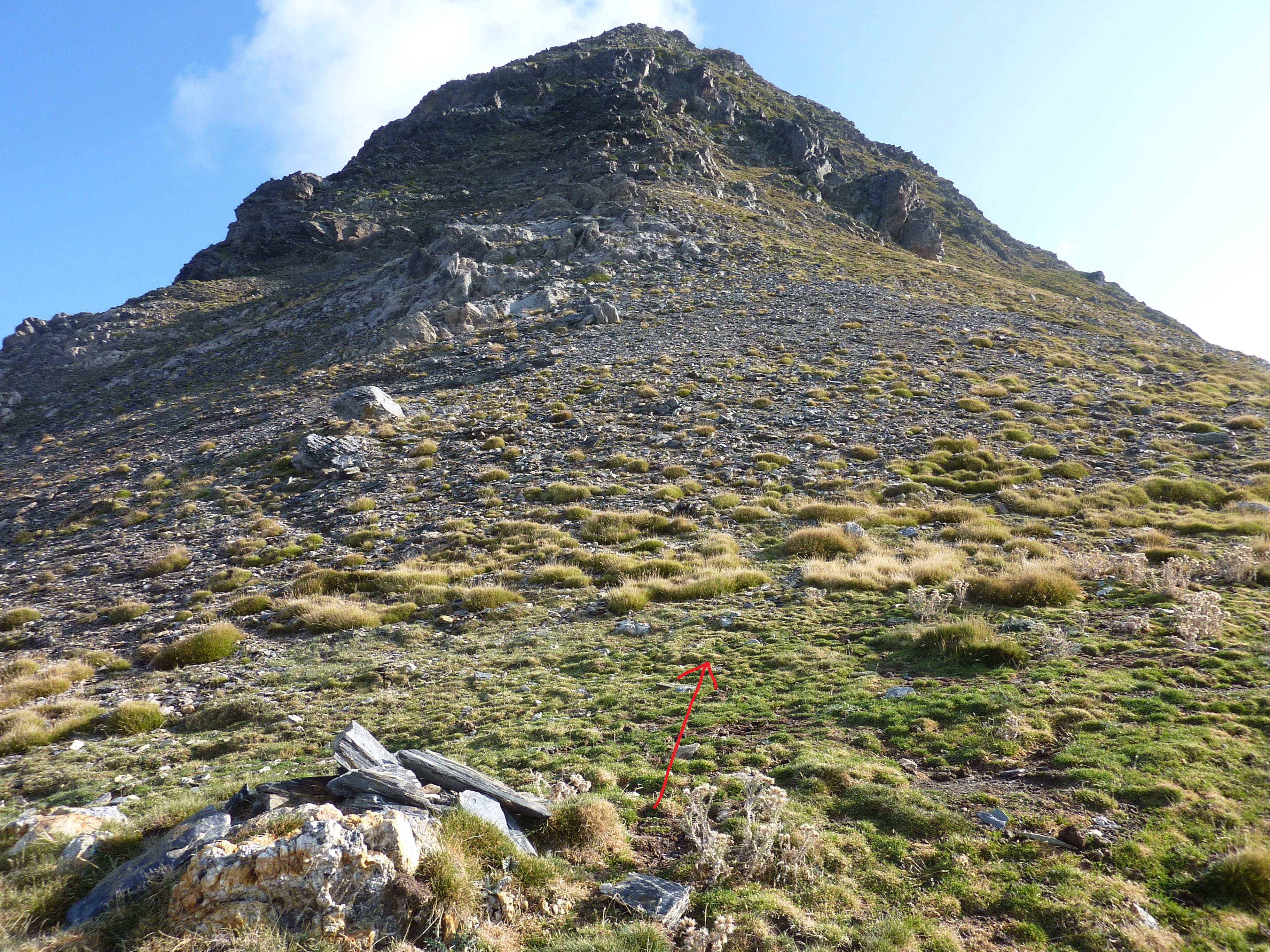Au niveau de ce cairn (2477 m), monter à vue sur la droite pour récupérer le semblant de chemin en fort dévers montant de biais sur la droite direction Soum de Grum (attention, chemin en fort dévers mêlé d'herbe et de terre) (il existerait un chemin partant sur la gauche et contournant la base du Soum de Grum par sa face Ouest pour atteindre le plateau du Clot Déts Léas puis le sommet "plus" facilement mais je ne l'ai pas vu ...)