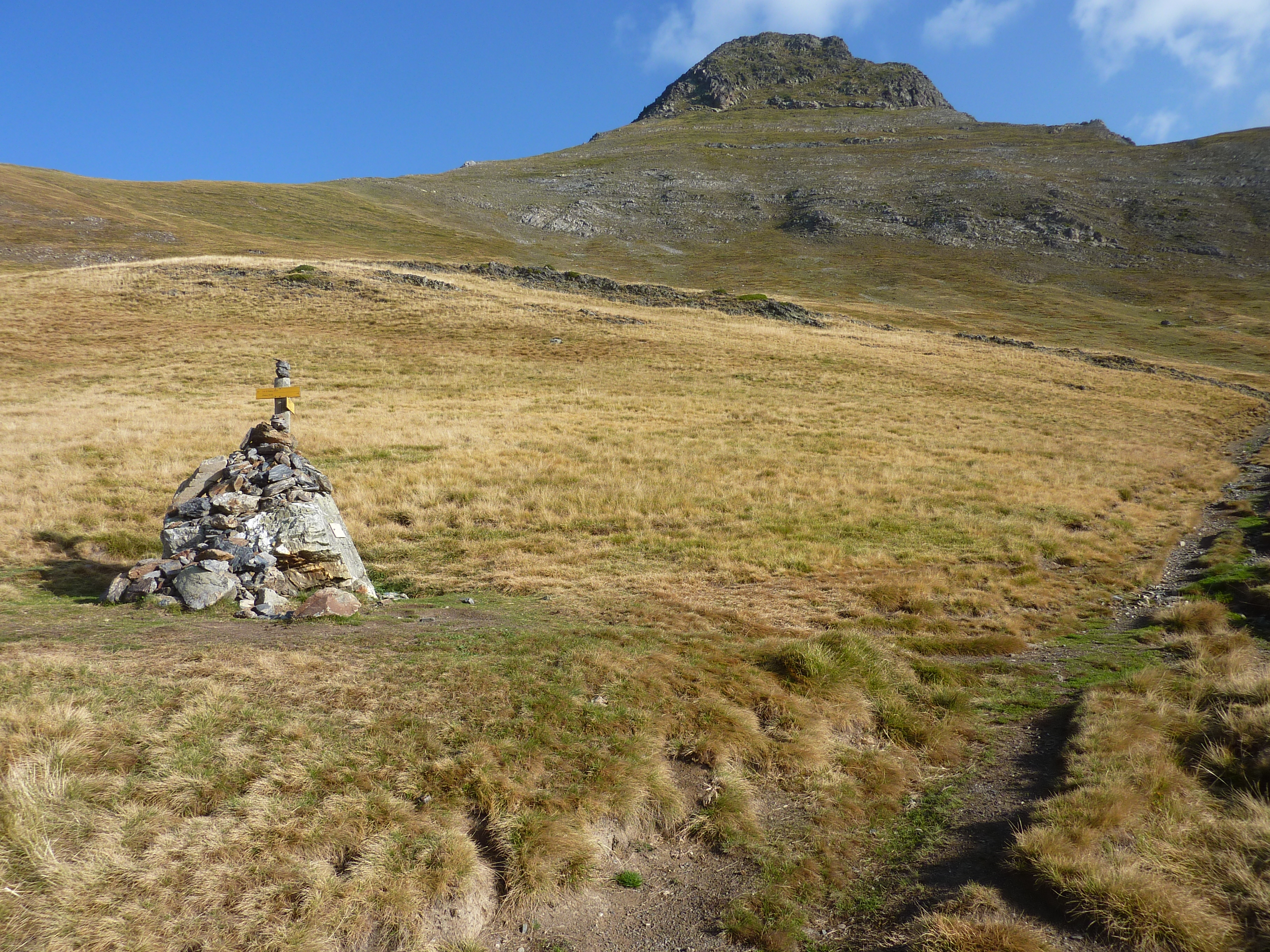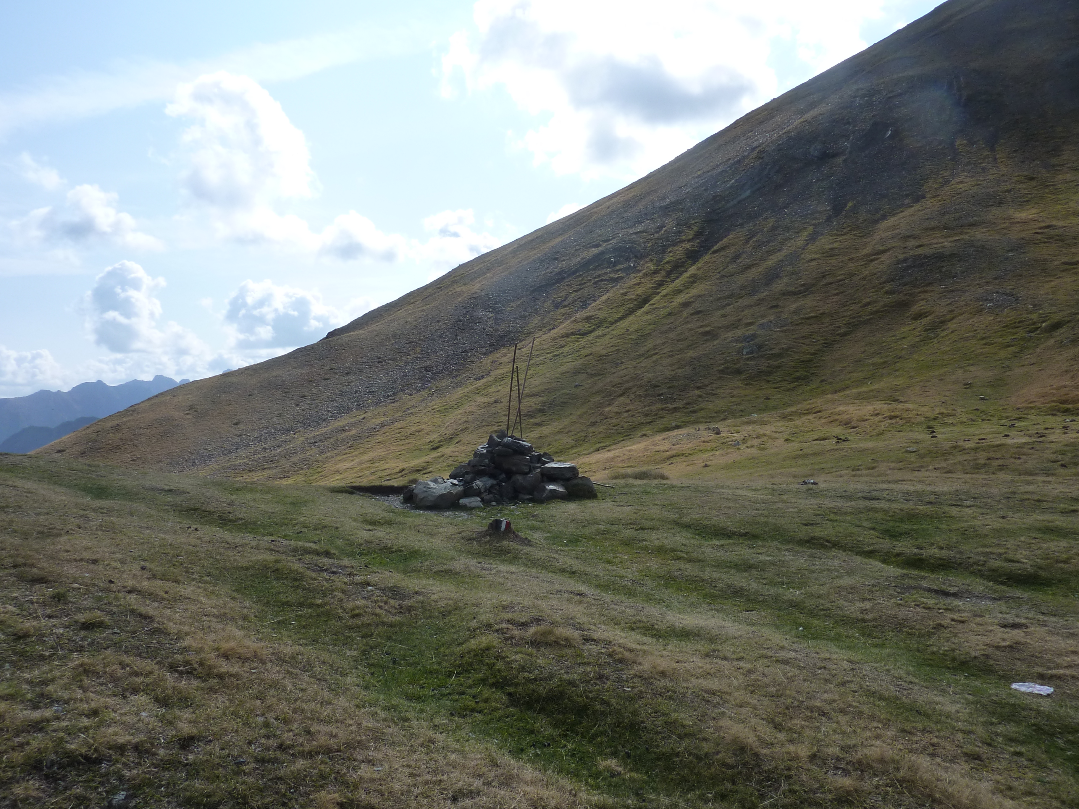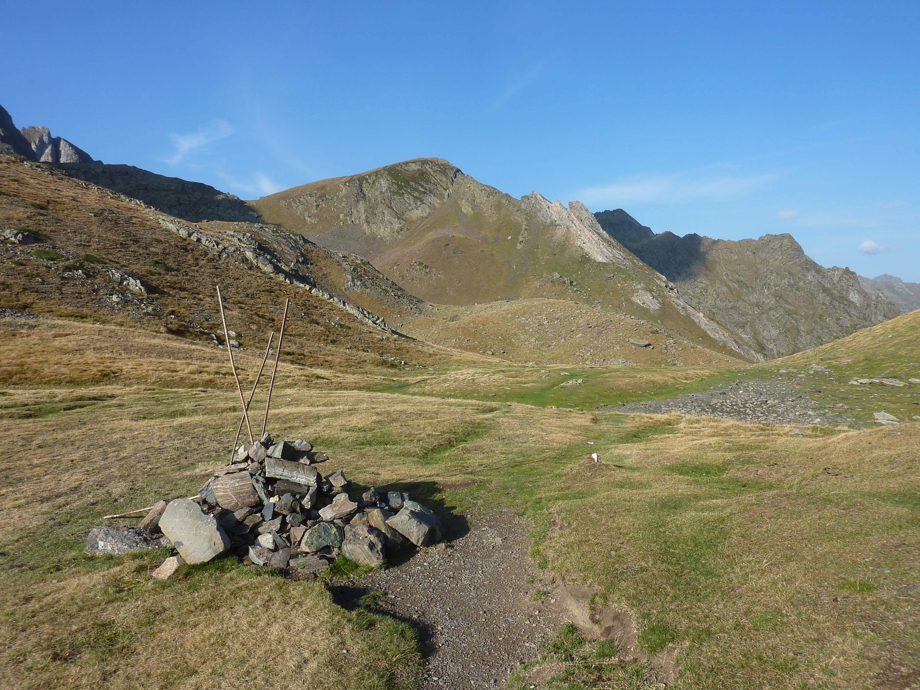 Au niveau de ce cairn (2477 m), monter à vue sur la droite pour récupérer le semblant de chemin en fort dévers montant de biais sur la droite direction Soum de Grum (attention, chemin en fort dévers mêlé d'herbe et de terre) (il existerait un chemin partant sur la gauche et contournant la base du Soum de Grum par sa face Ouest pour atteindre le plateau du Clot Déts Léas puis le sommet "plus" facilement mais je ne l'ai pas vu ...)