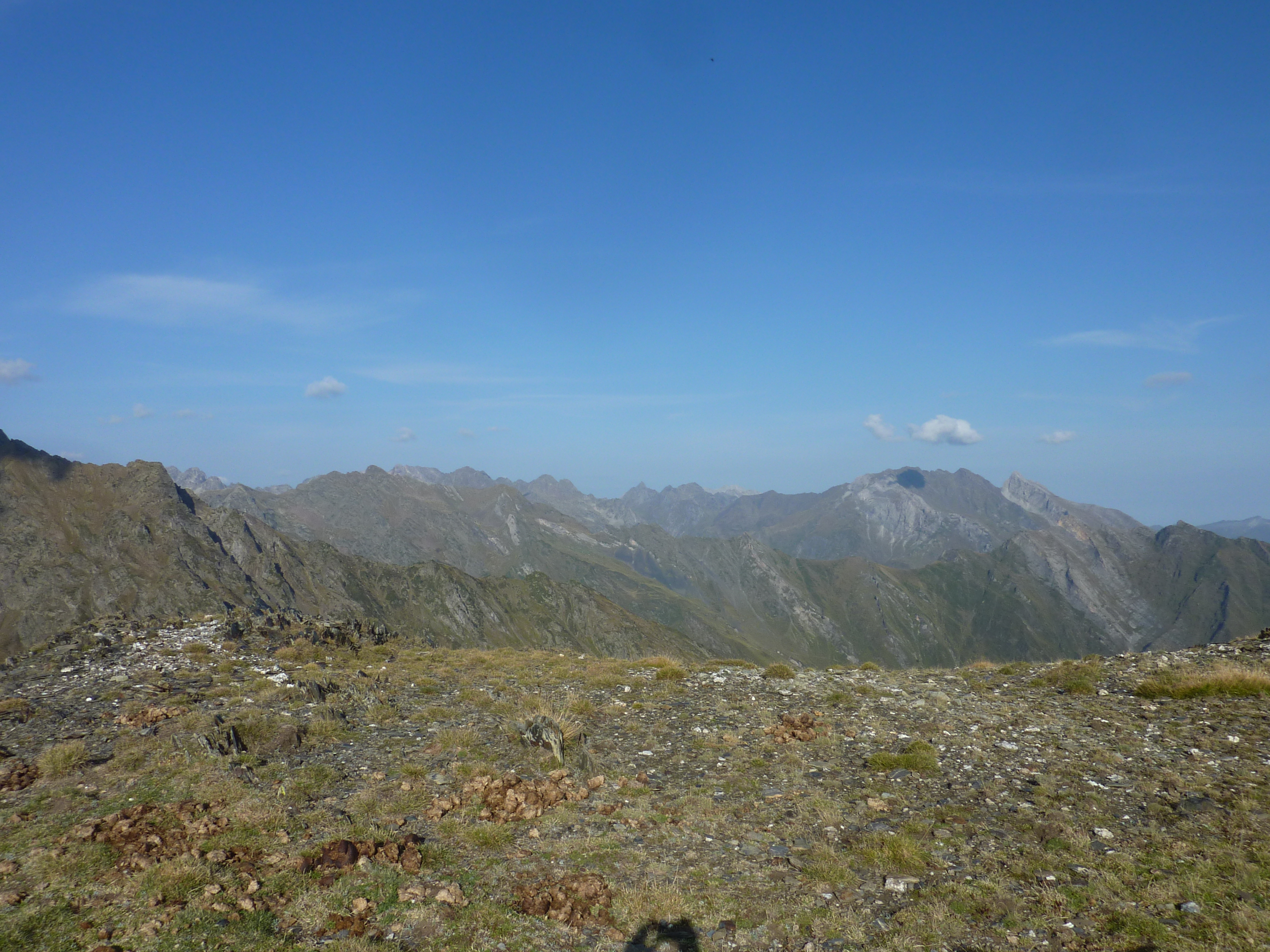 Arrivée au sommet du Soum de Grum (antécime) (2591 m) : belle vue sur les sommets de la Vallée de Cauterets et de Gavarnie (Moun Né, Viscos, Ardiden, ...), de la Réserve du Néouvielle (Néouvielle, Pic Long, ...), du Val d'Azun (Vignemale, Barbat, Balaïtous, Palas, ...) ainsi que sur le Montaigu et le Midi de Bigorre