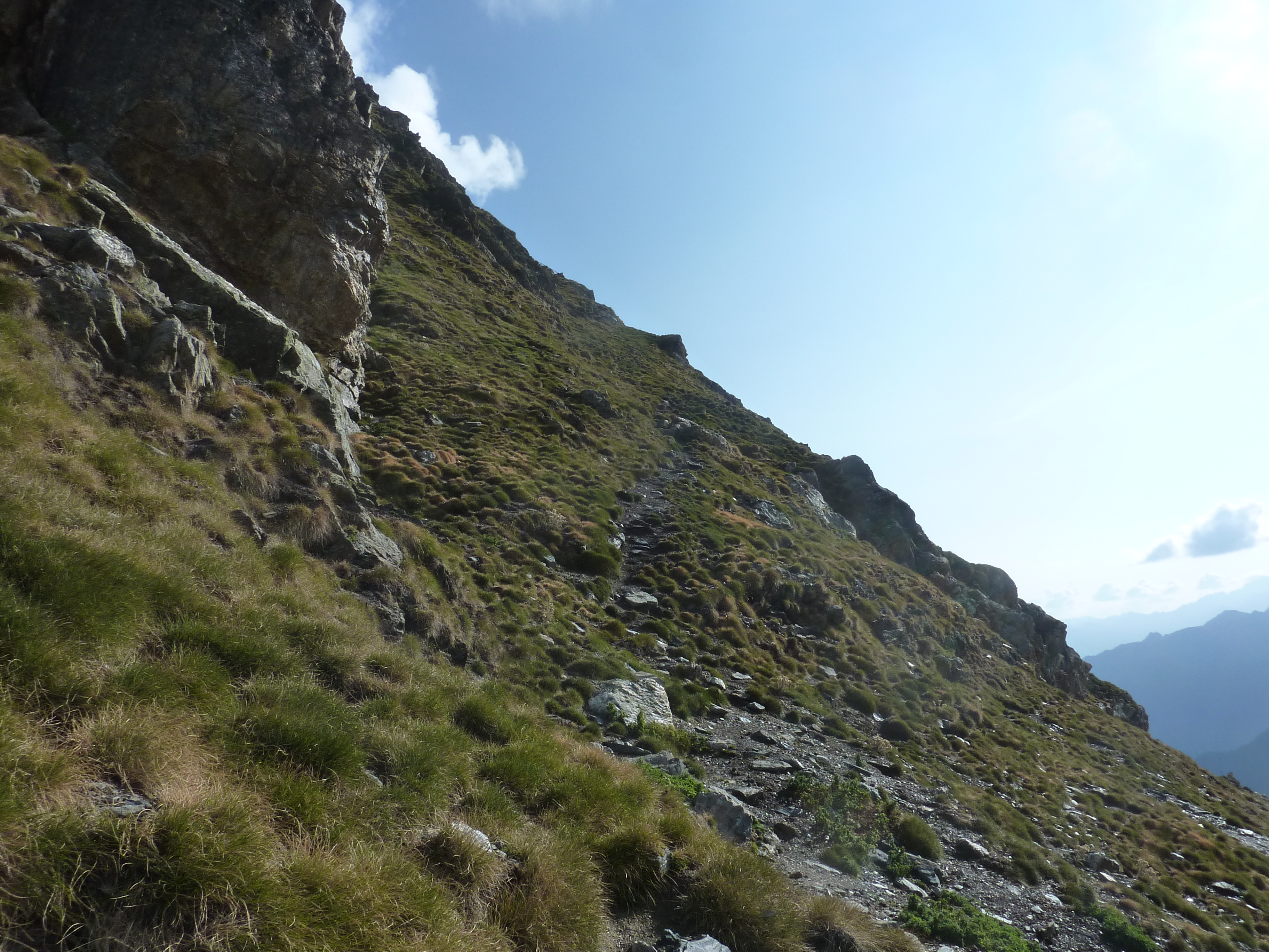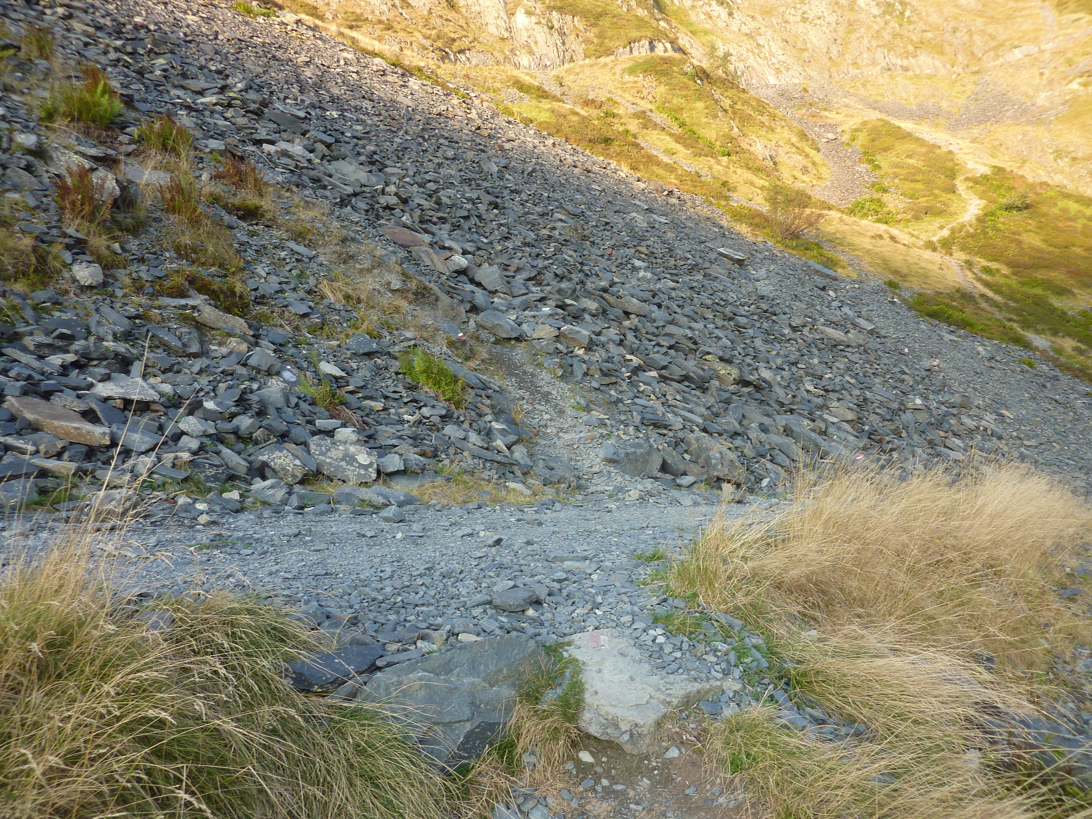 Vue sur le semblant de chemin en fort dévers menant à l'antécime du Soum de Grum qui correspond à l'intersection entre ce chemin et les conduites de fluide menant au sommet (terrain et temps secs impératifs)