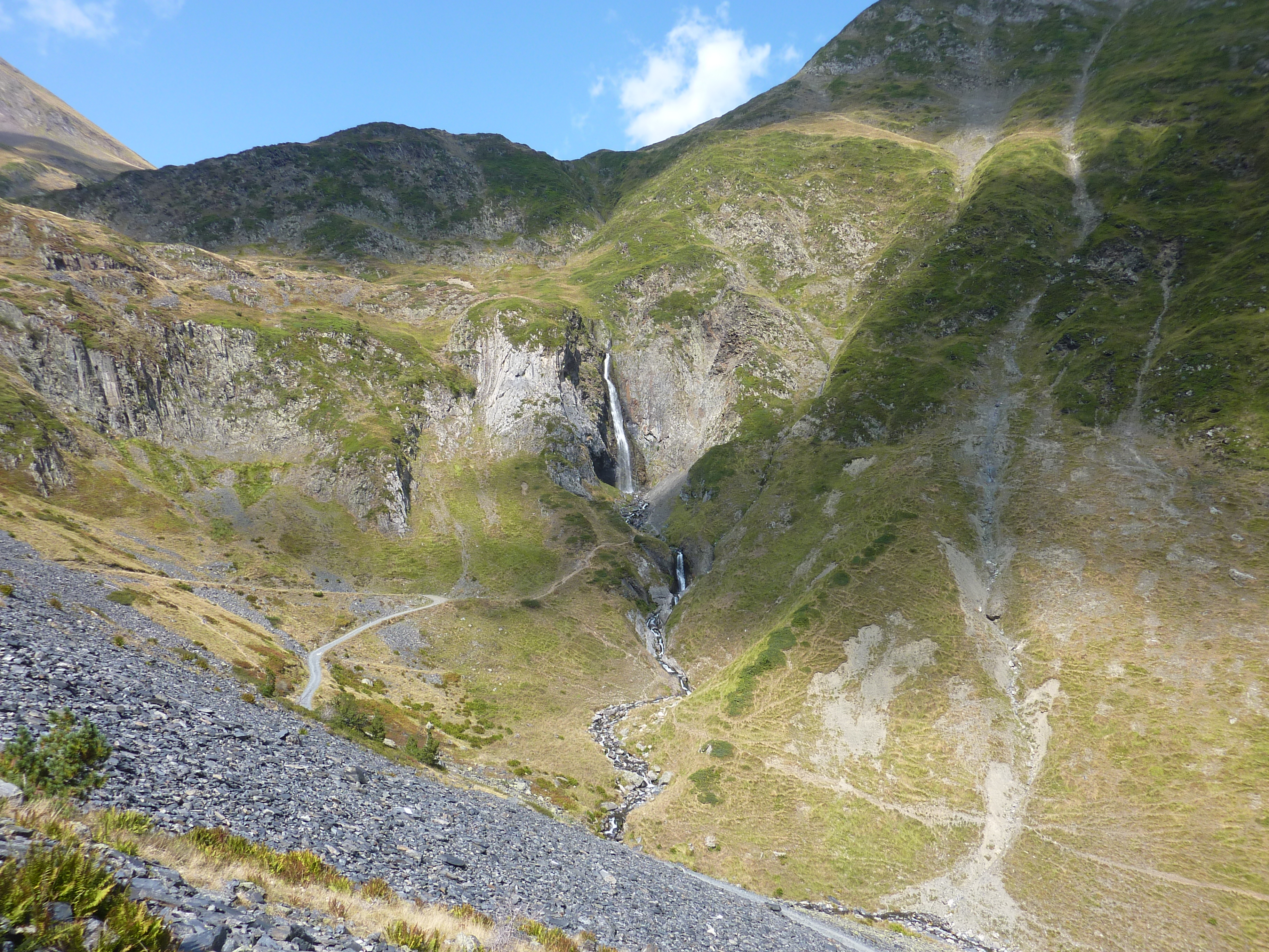 A ce croisement situé au niveau de la Cascade de Sahucs (1493 m), suivre la piste partant sur la droite direction Lac d'Ilhéou, balisé en rouge et blanc dorénavant (entrée dans le Parc National des Pyrénées)