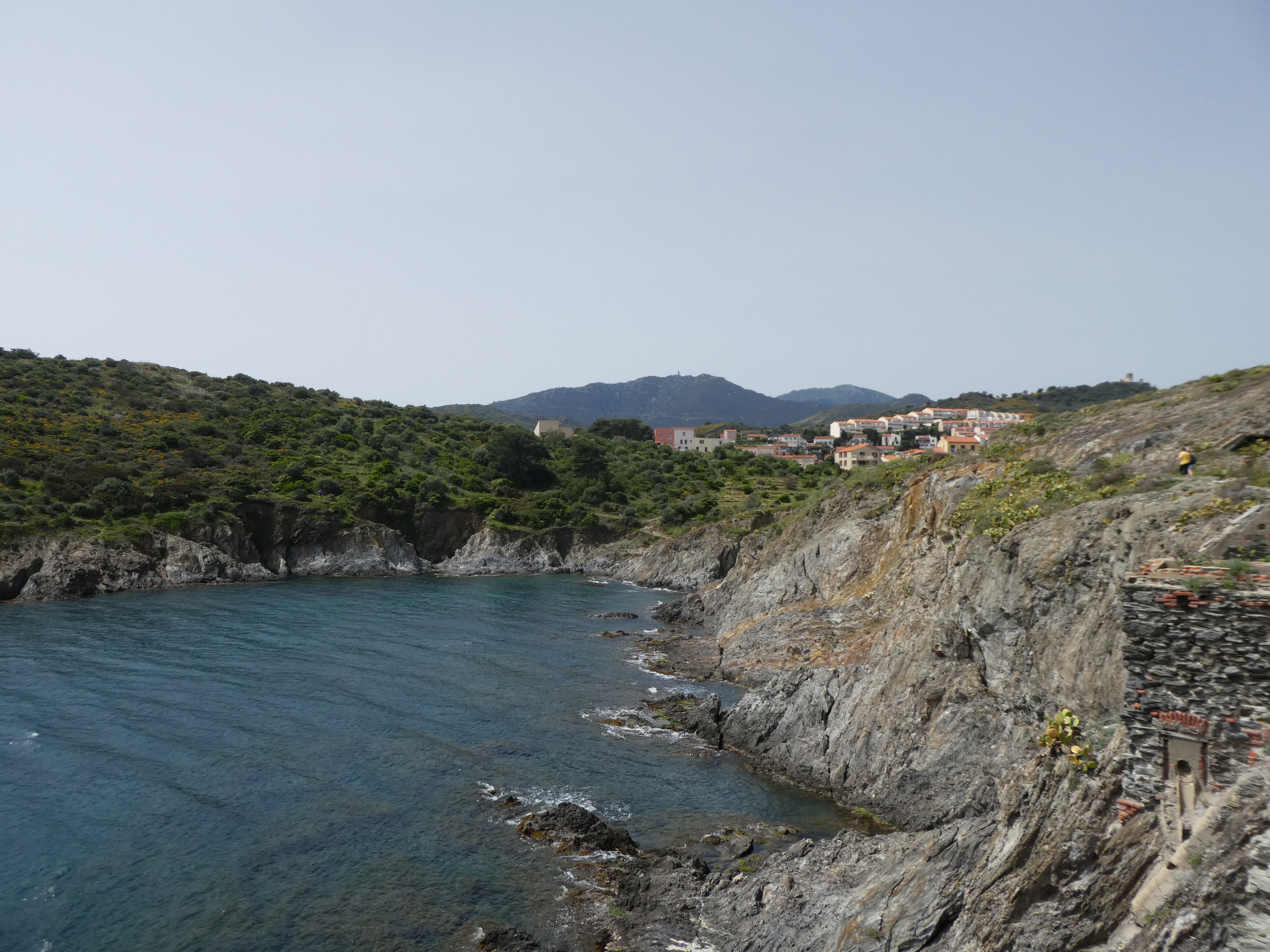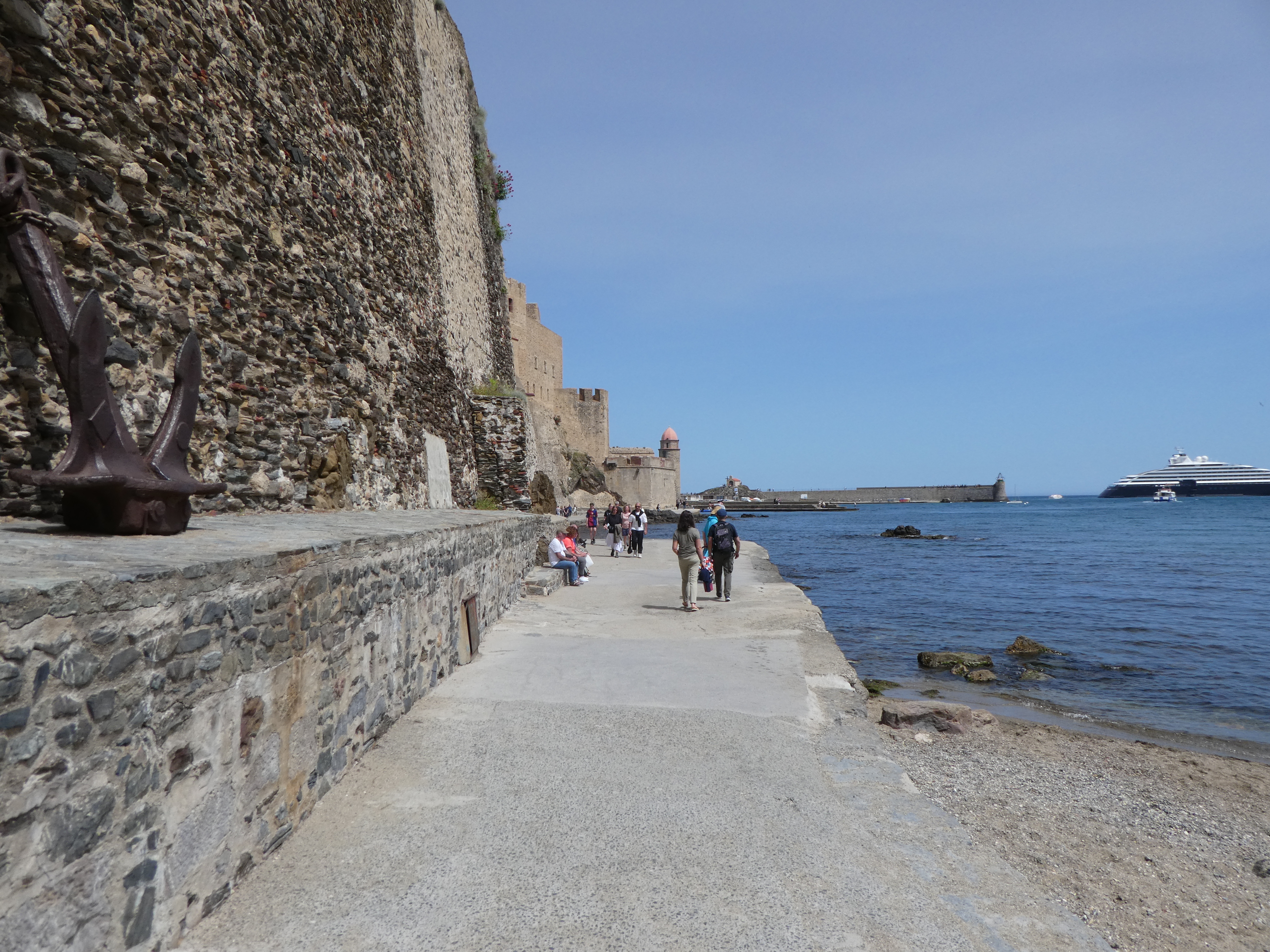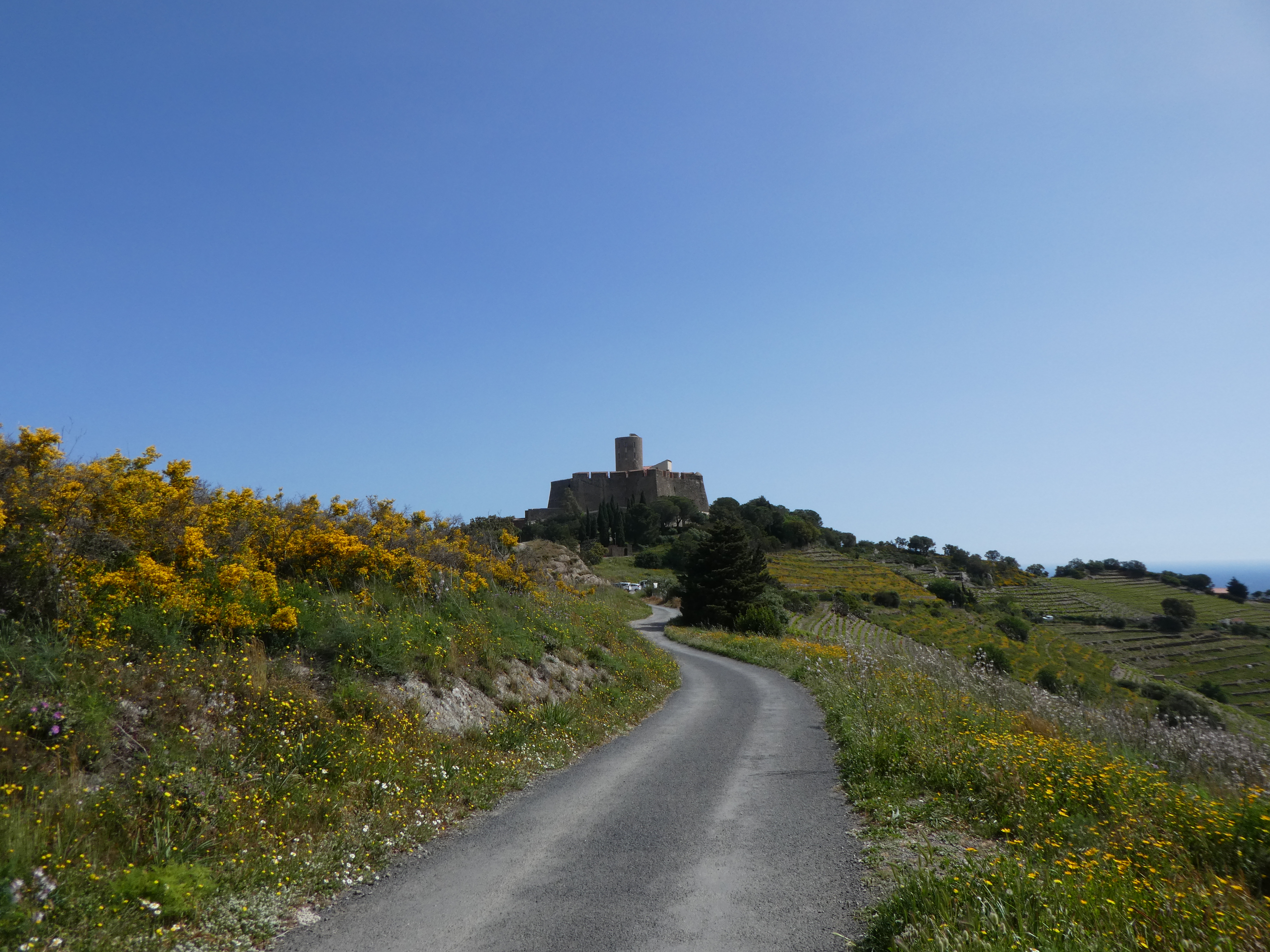 A ce croisement situé au niveau du Château Royal de Collioure (1400 mètres après le lieu-dit "Punta dels Reguers"), suivre le chemin partant sur la droite et longeant le château direction le Racou, aucun balisage dorénavant (l'itinéraire balisé en jaune doit certainement suivre la route principale partant tout droit et ne plus rentrer dans le vieux centre de Collioure) (ceux qui auraient suivi la direction "Collioure" au niveau du Fort Dugommier devraient se retrouver ici)