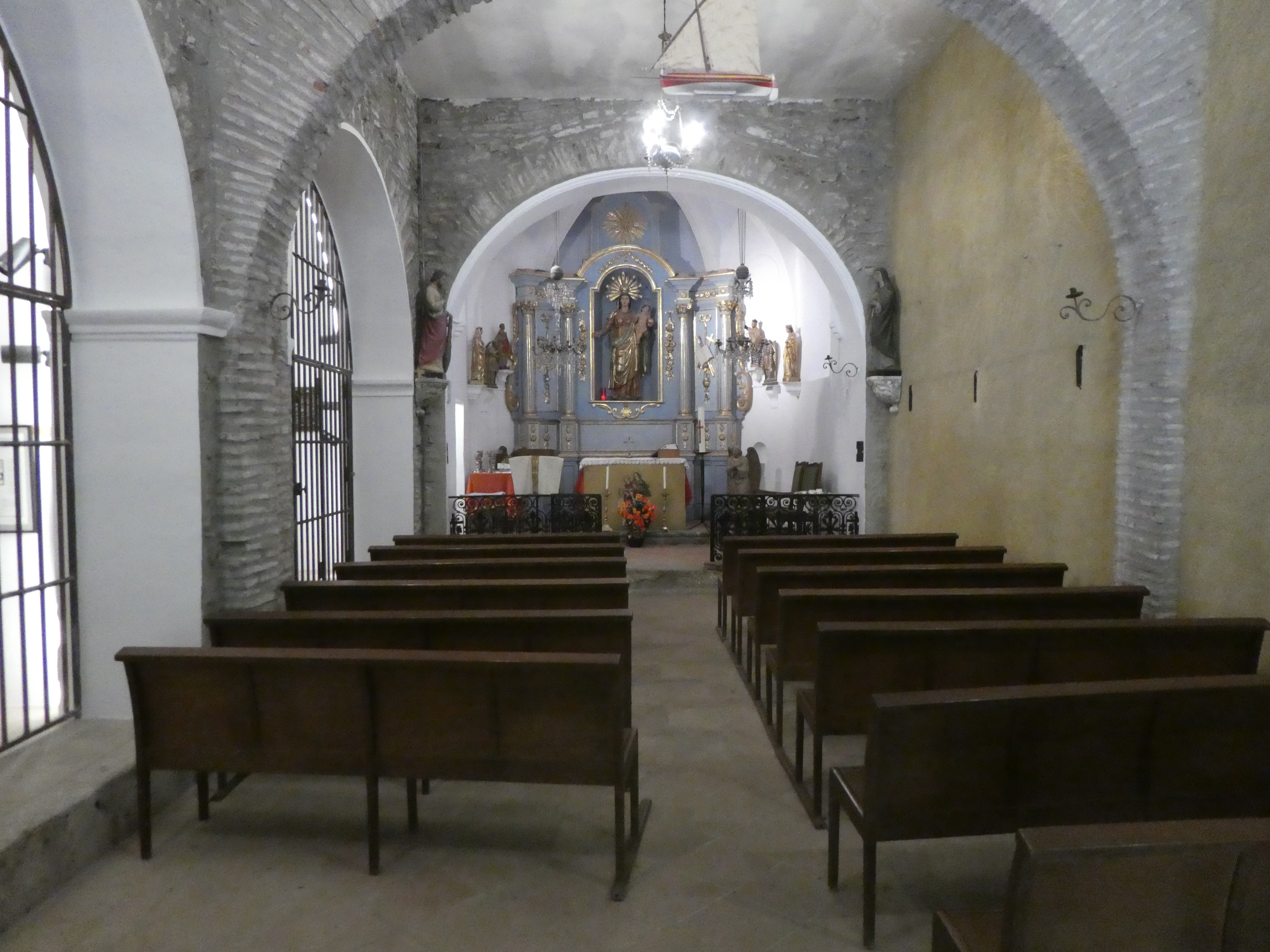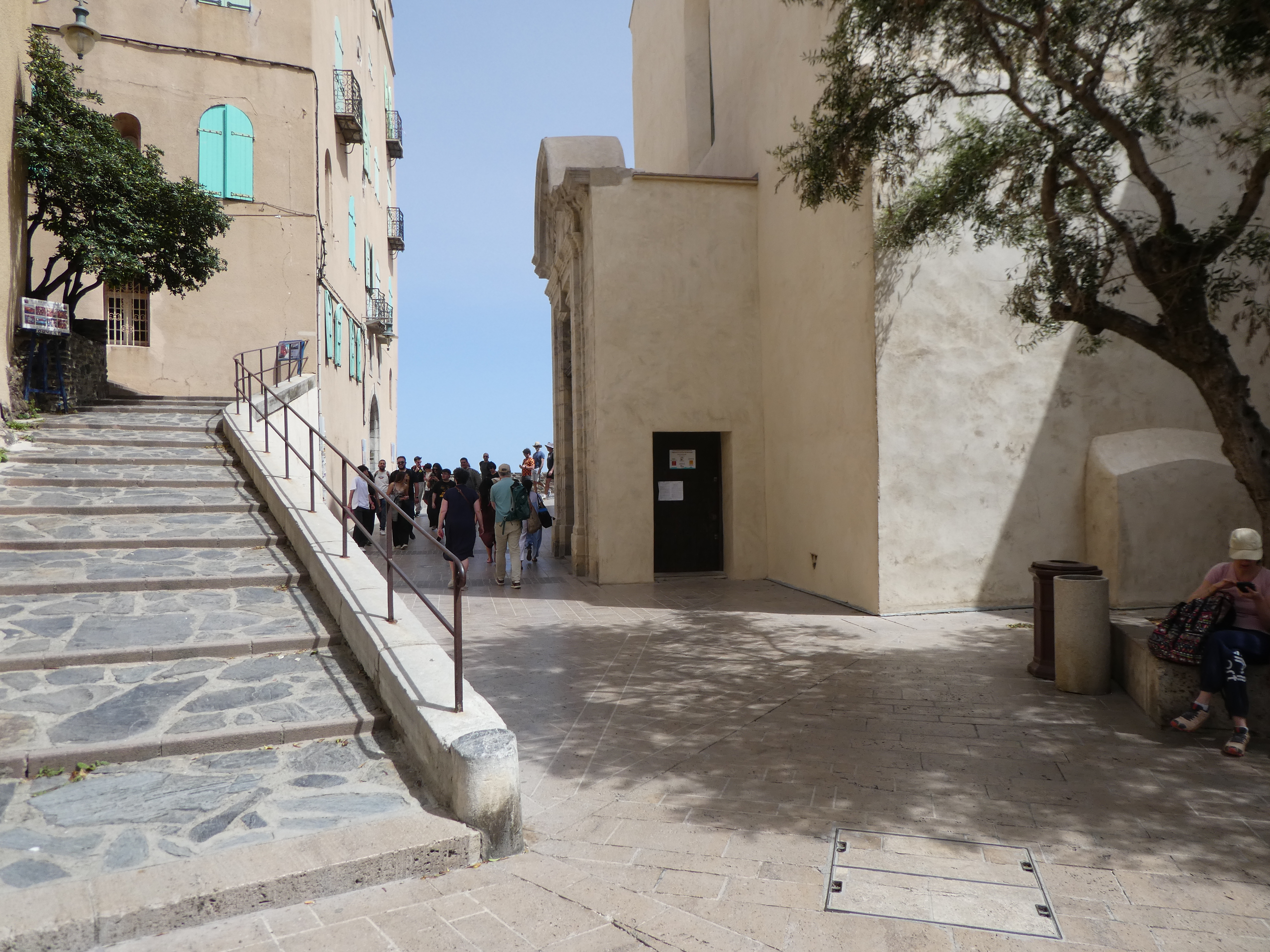 A ce croisement situé au niveau de l'Església Sant Vicenç (550 mètres après le précédent mentionné), monter les escaliers partant légèrement sur la gauche puis suivre la rue partant sur la gauche (Rue du Mirador) direction le Racou