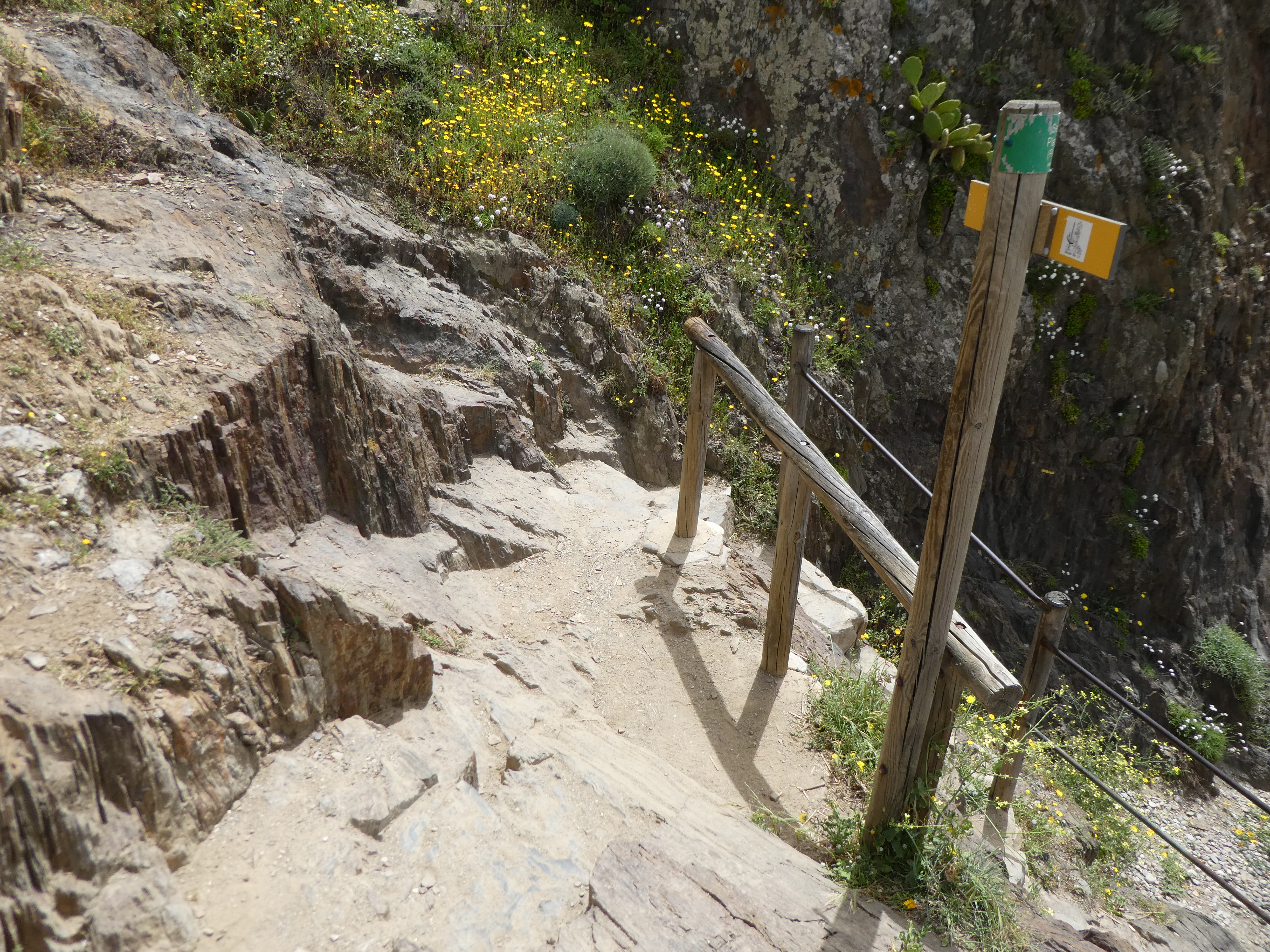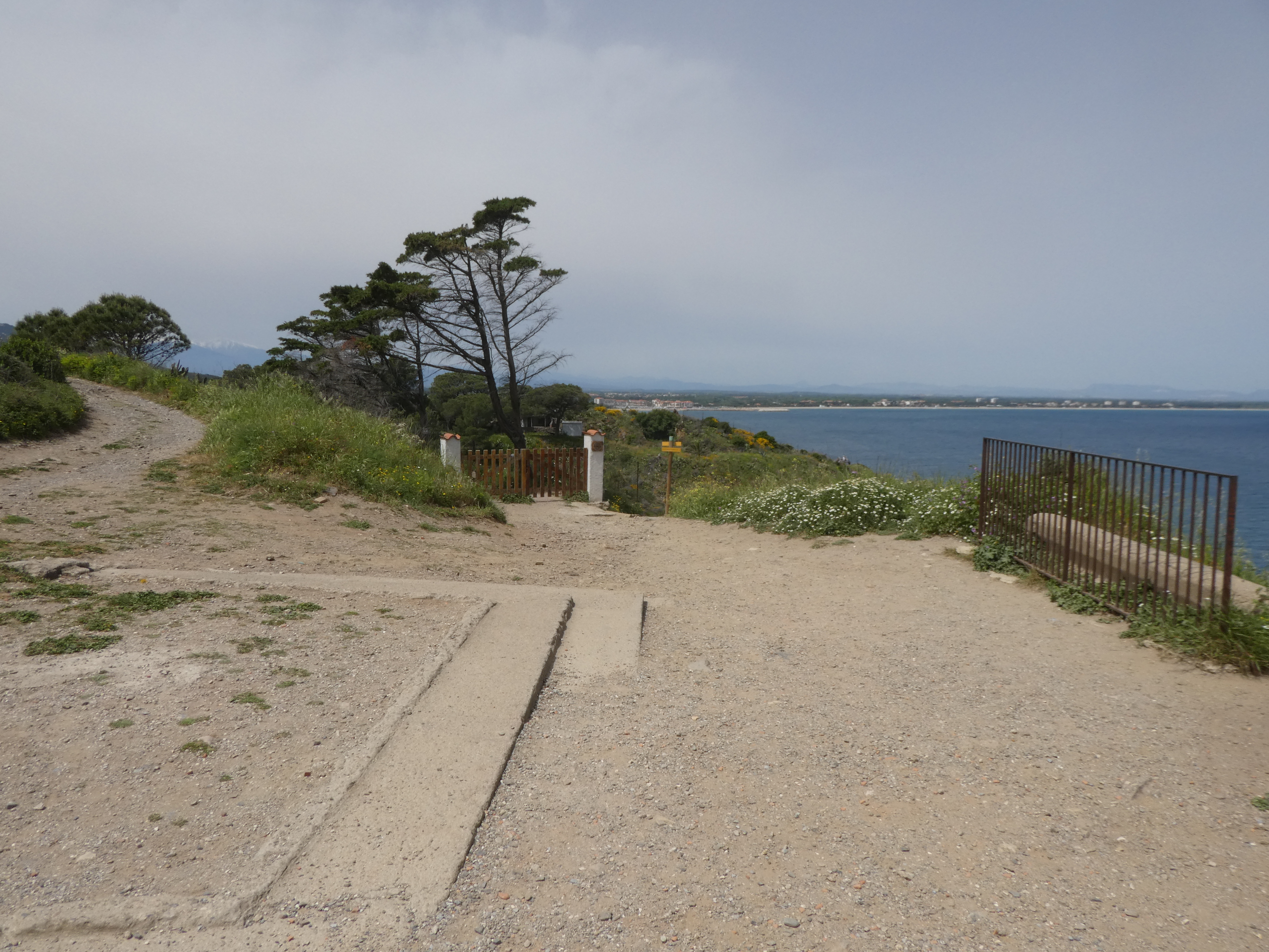 A ce croisement marqué par la présence d'un panneau directionnel (700 mètres après le lieu-dit "Creu Blanca"), descendre les escaliers de gauche menant au port de Port-Vendres direction Port-Vendres, balisé en jaune dorénavant
