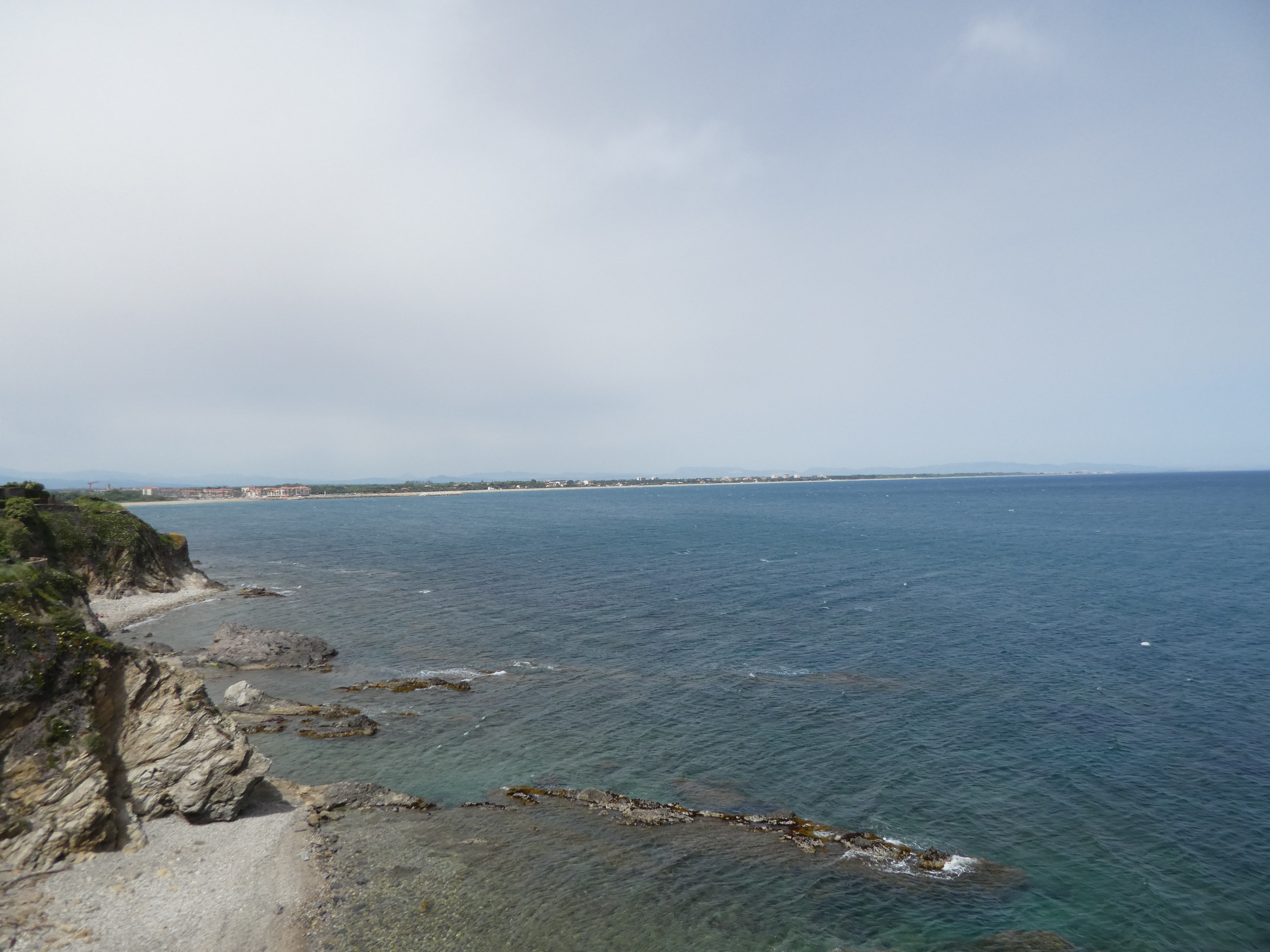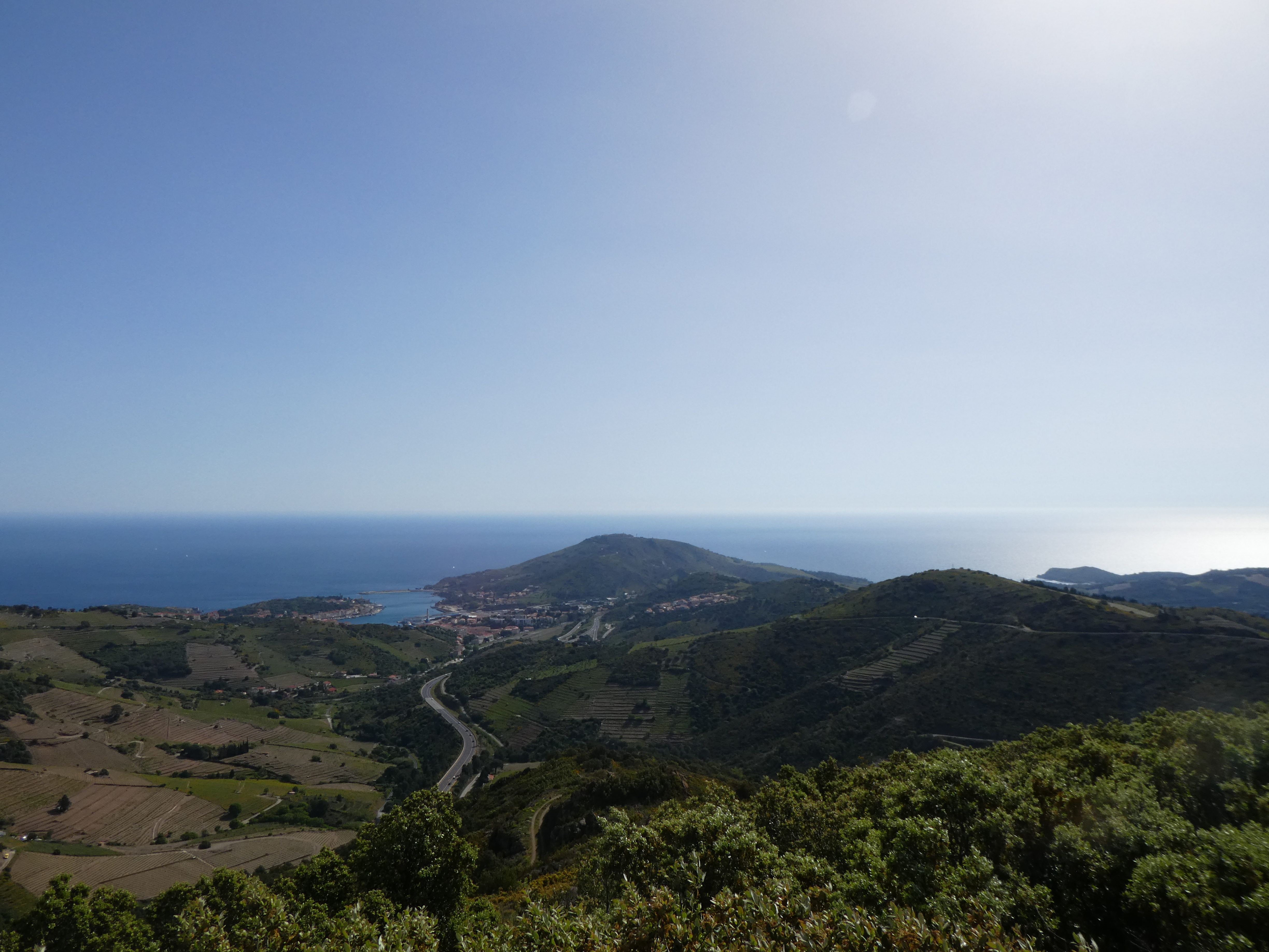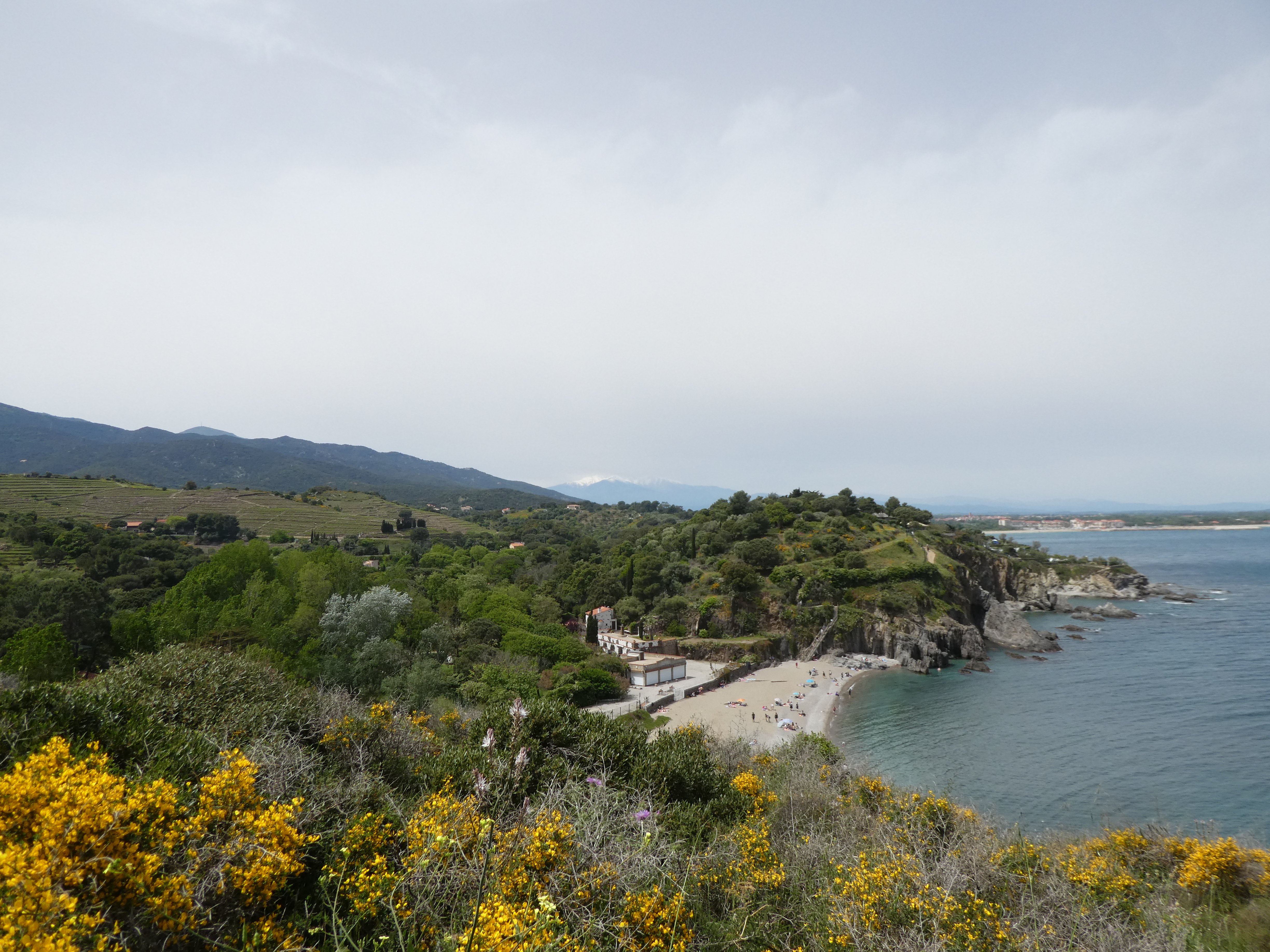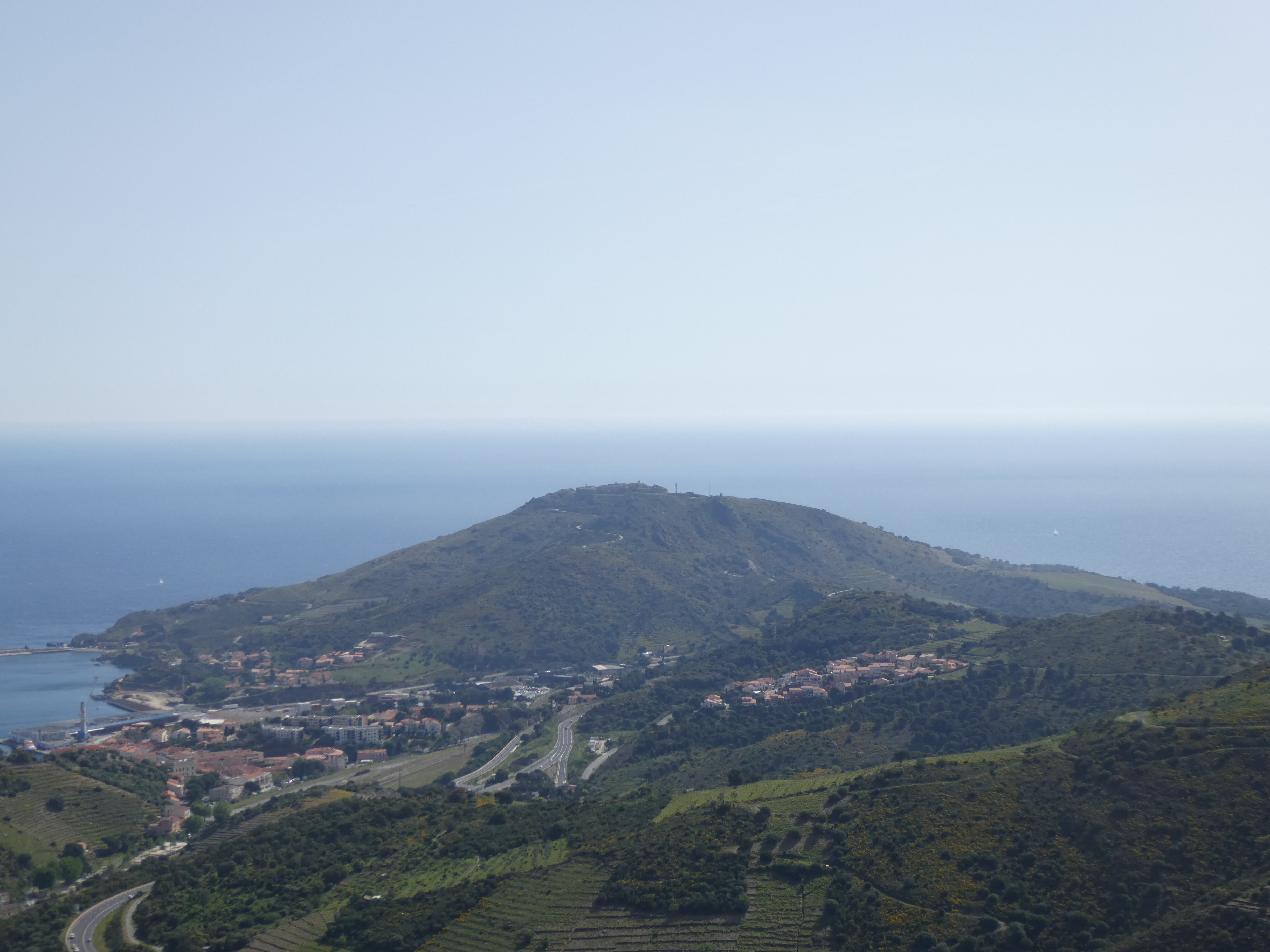 Vue au loin sur le massif du Canigou et la Platja de l'Olla en bas