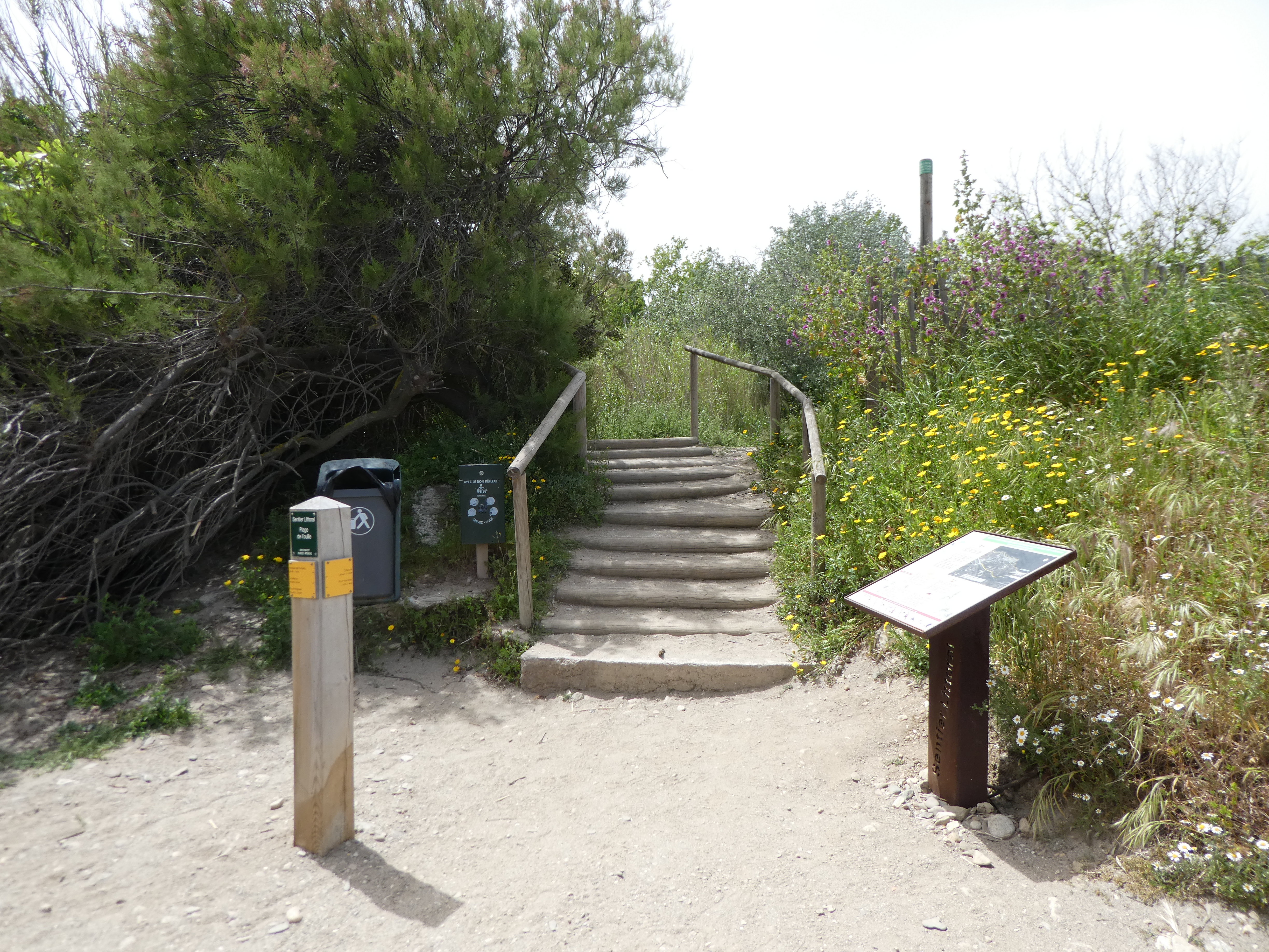 Platja de l'Olla (5 m) : suivre le chemin partant tout droit et traversant la plage direction le Racou, balisé en jaune (direction non mentionnée sur le panneau directionnel)