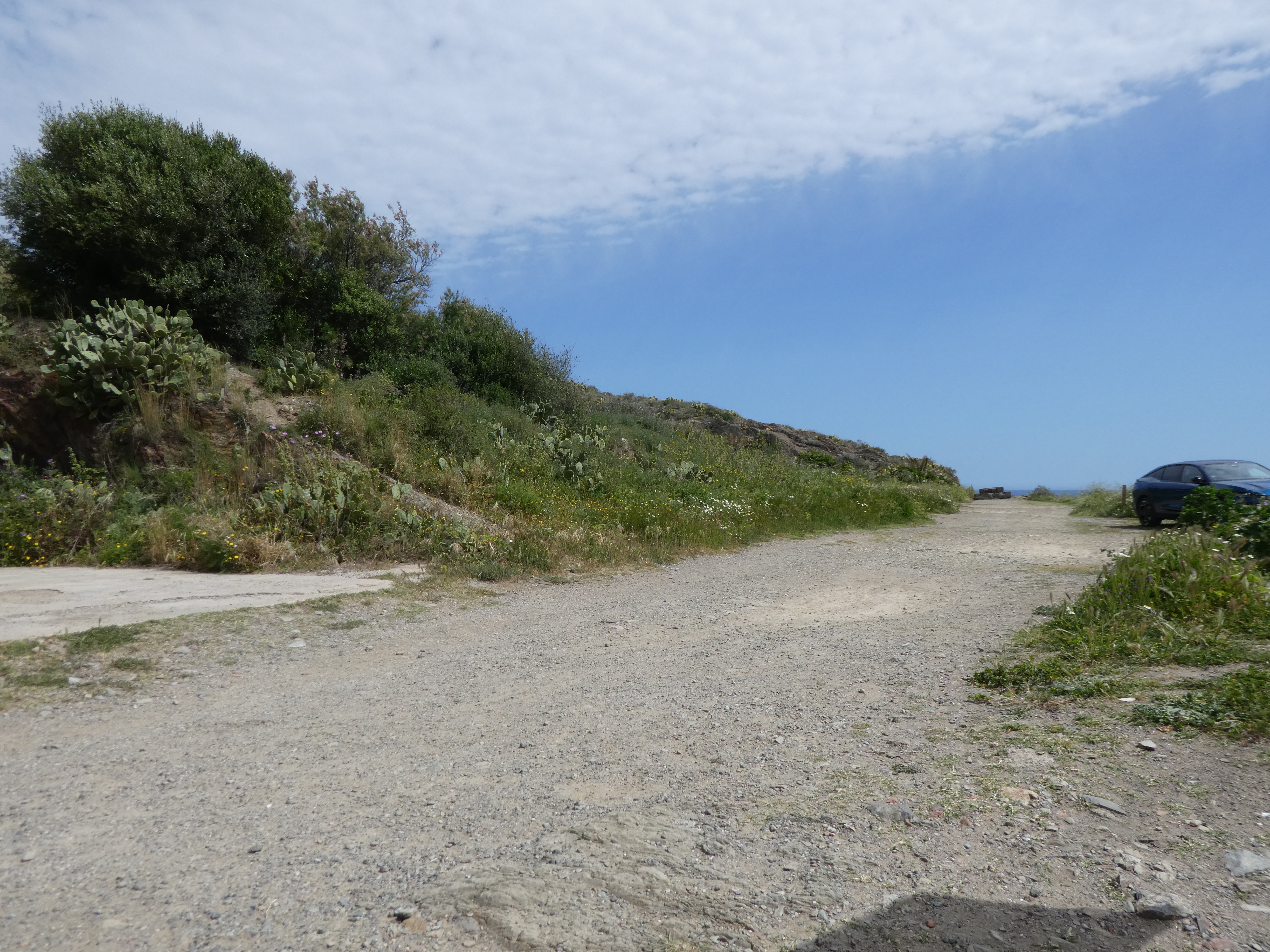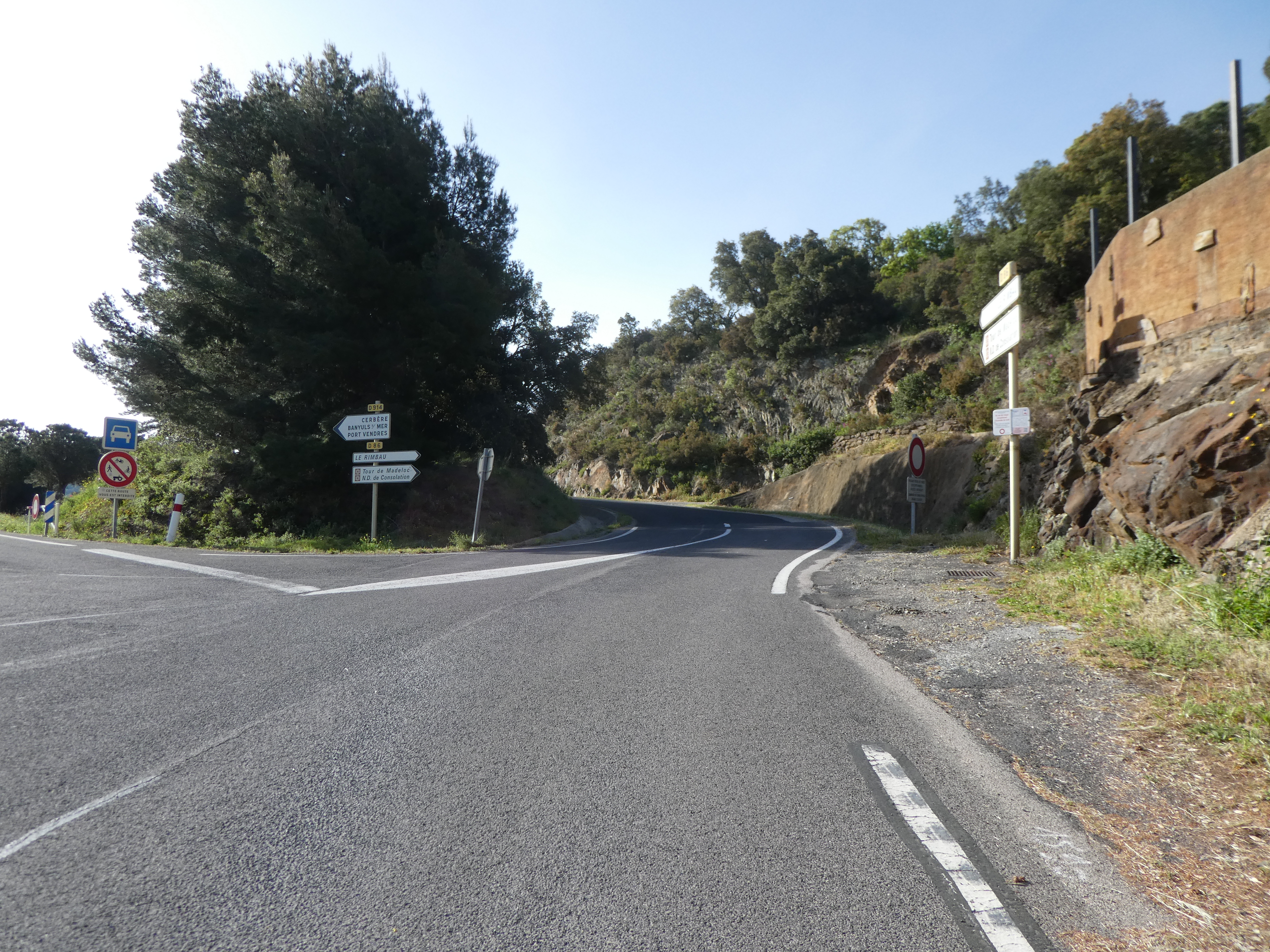 A ce croisement marqué par la présence d'un panneau directionnel (500 mètres après le précédent) (160 m), suivre la route partant tout droit direction Port-Vendres (par le Fort Saint-Elme), balisé en jaune (direction non mentionnée sur le panneau directionnel) (ceux qui voudraient rejoindre directement Collioure sans passer par Port-Vendres, suivre le chemin balisé en jaune descendant sur la gauche)