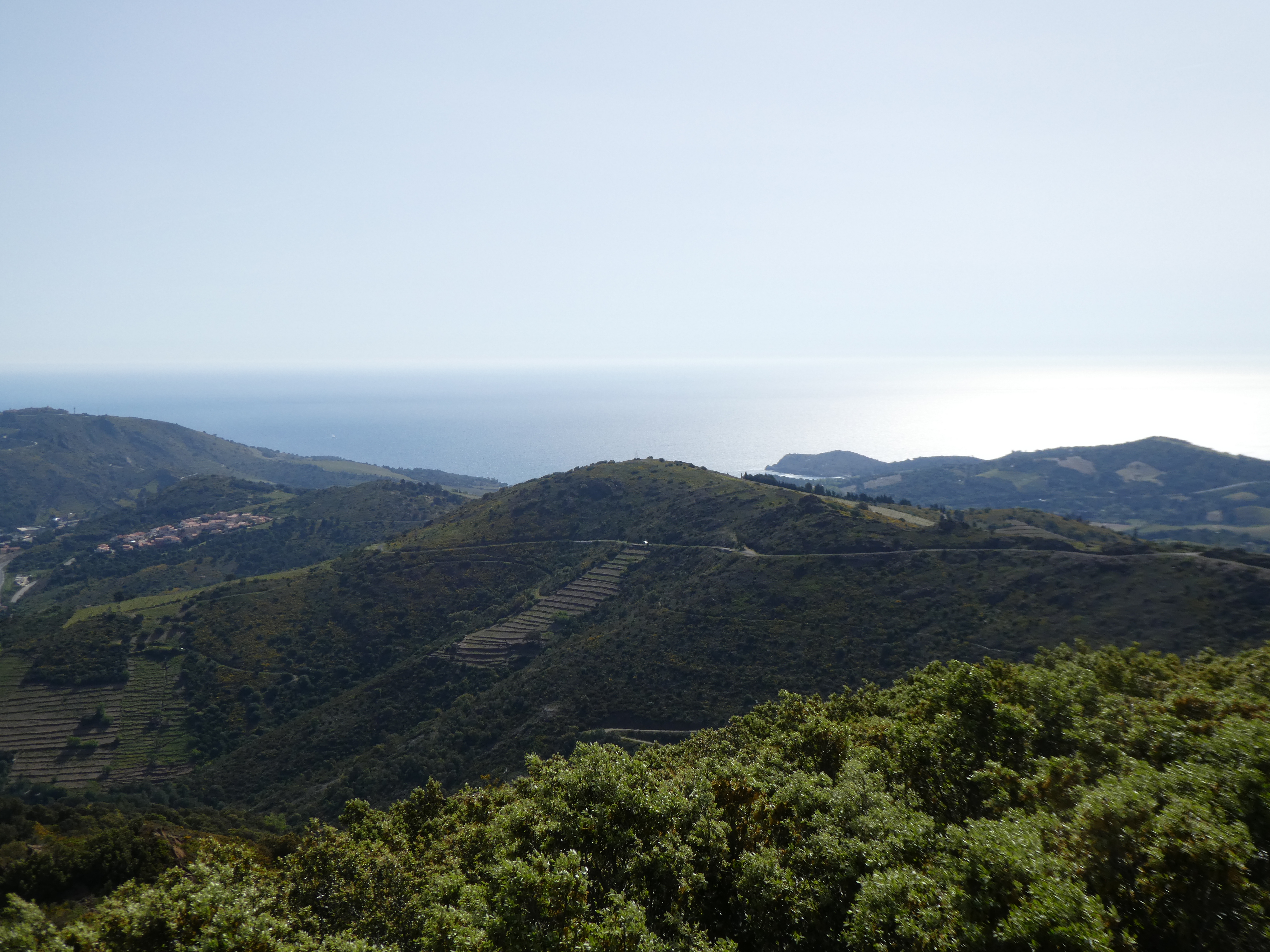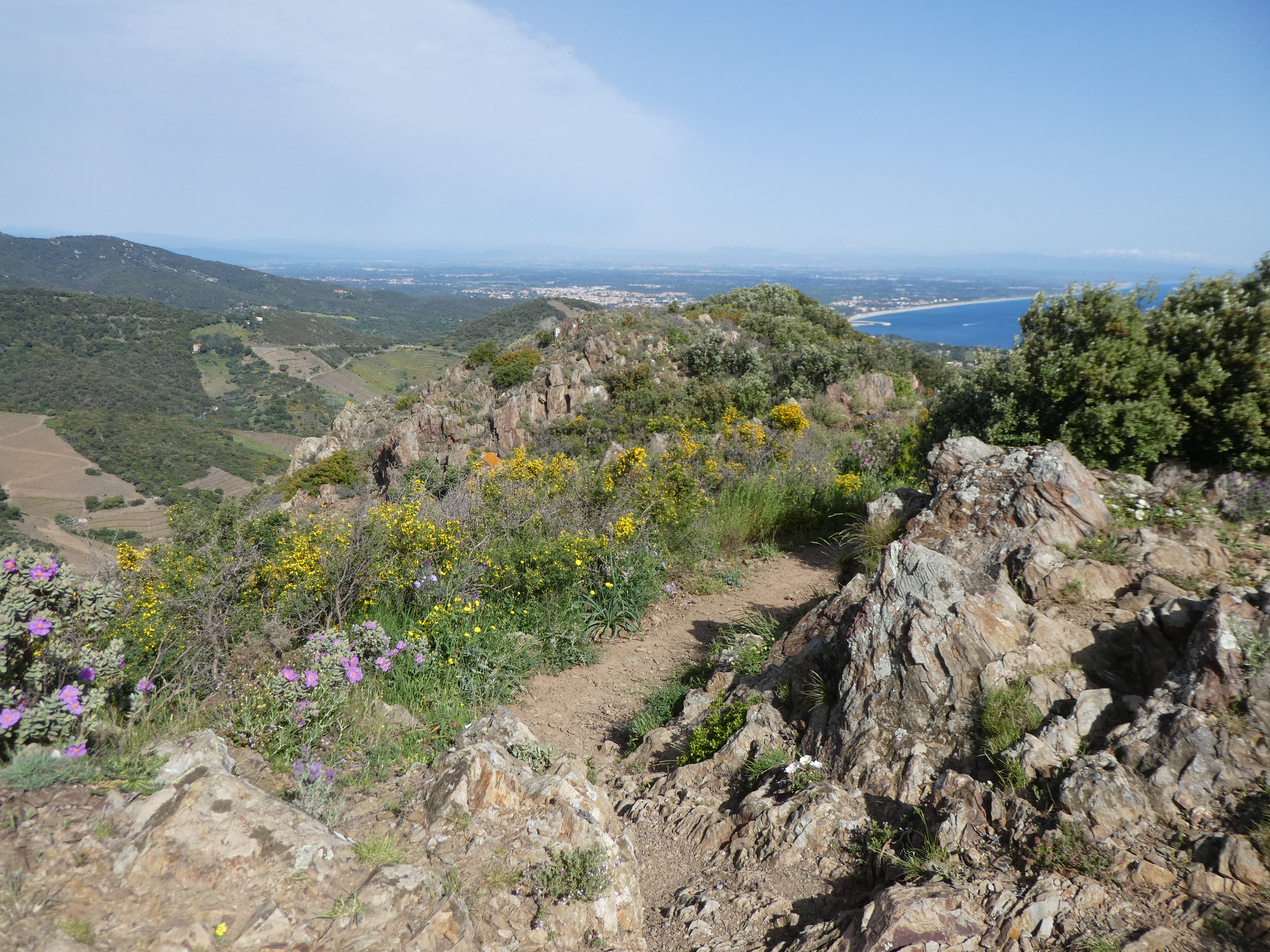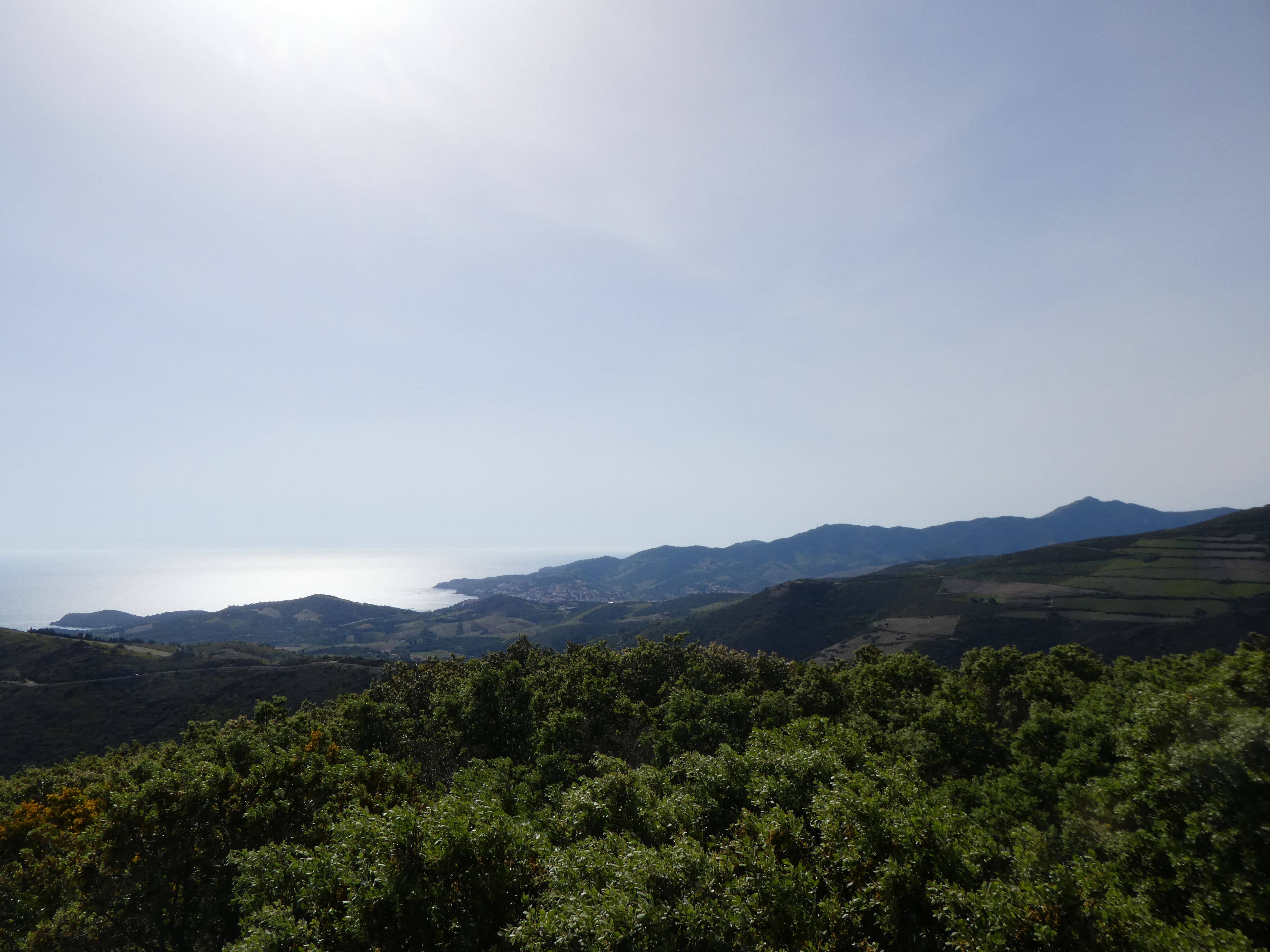 Arrivée au sommet du Puig de les Daines (333 m) : beau panorama sur les sommets des Albères Maritimes, des Pyrénées Audoises, des Corbières ainsi que sur le littoral nord-catalan et la Côte Vermeille