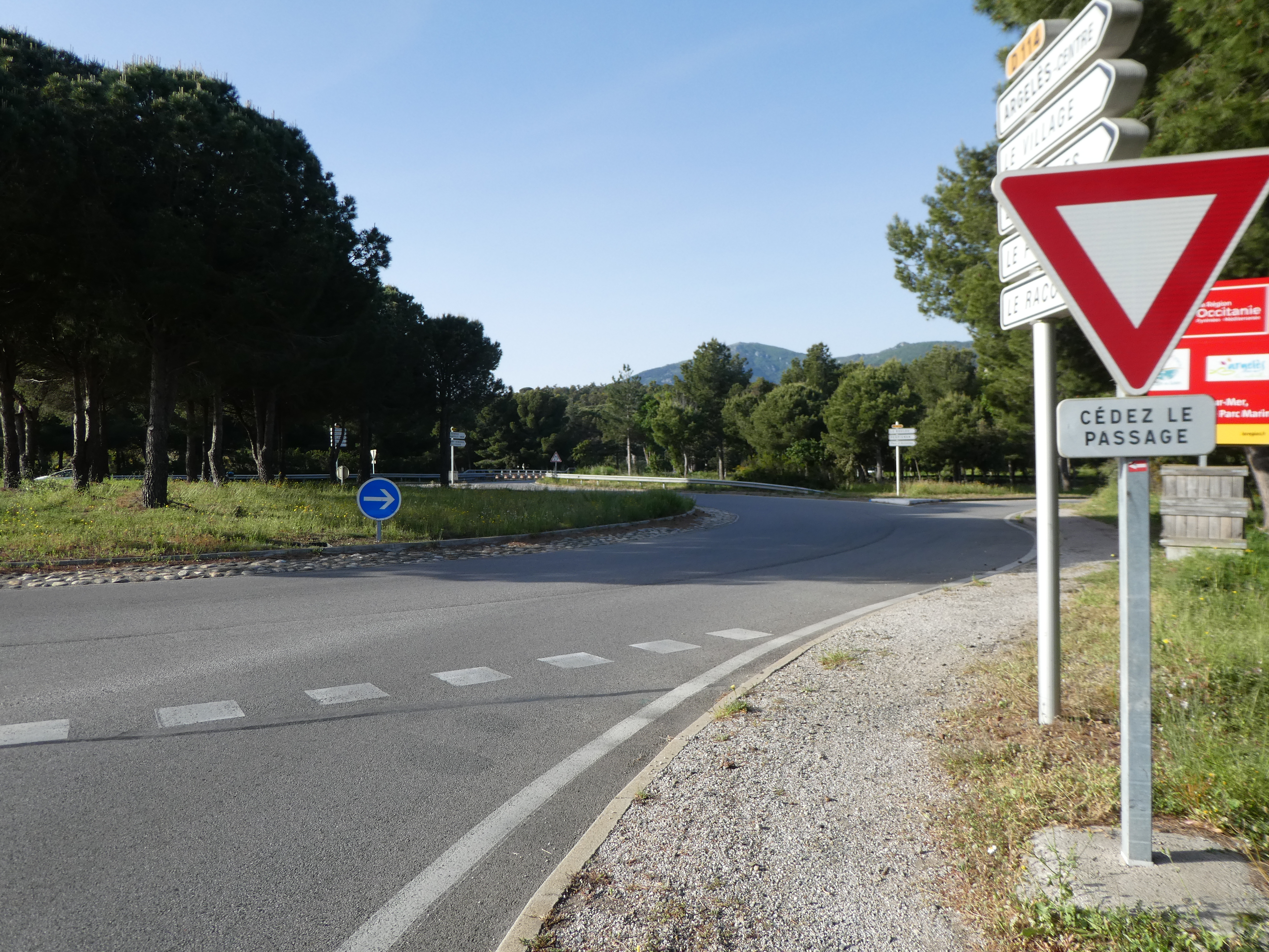 Au niveau de ce rond-point marqué par la présence d'un panneau directionnel (200 mètres après le précédent croisement) (16 m), suivre la rue montant sur la droite (Route du Pla de les Forques) direction le Racou, balisé en jaune dorénavant