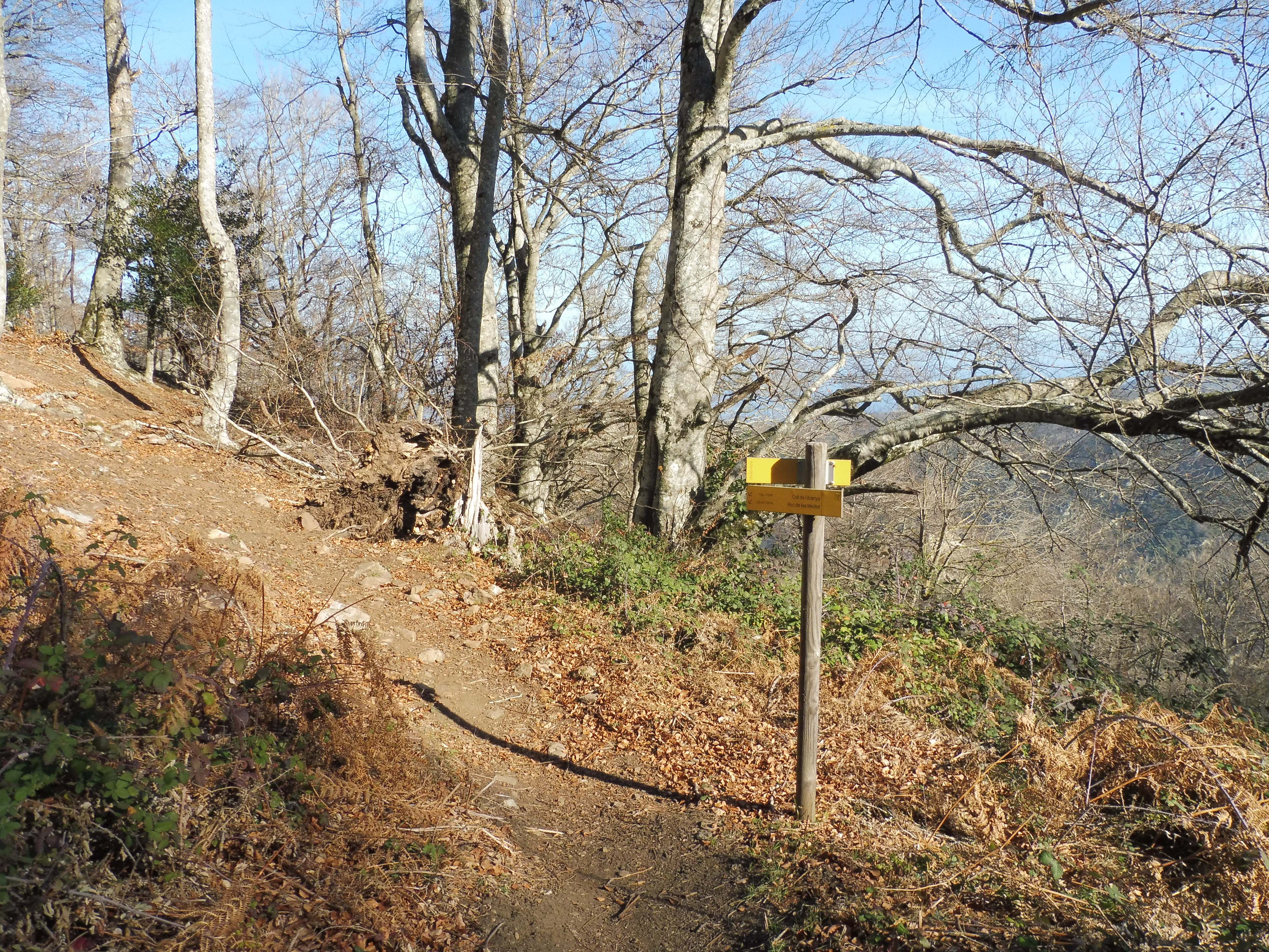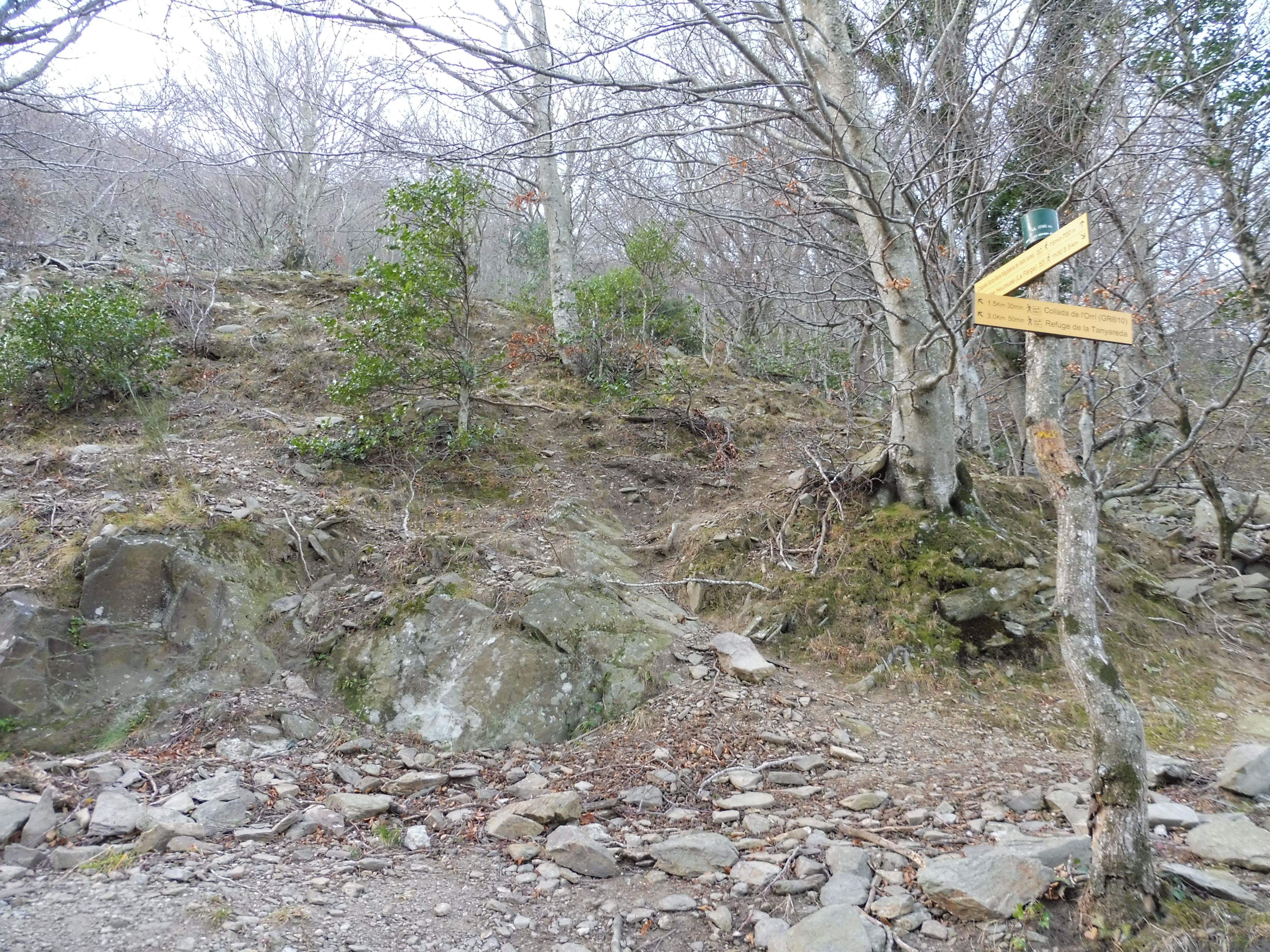 A ce croisement avec le GR10 (100 mètres après avoir quitté le Puig dels Quatre Termes), suivre ce dernier partant sur la gauche sur quelques mètres direction Coll dels Tres Faigs, balisé en rouge et blanc dorénavant