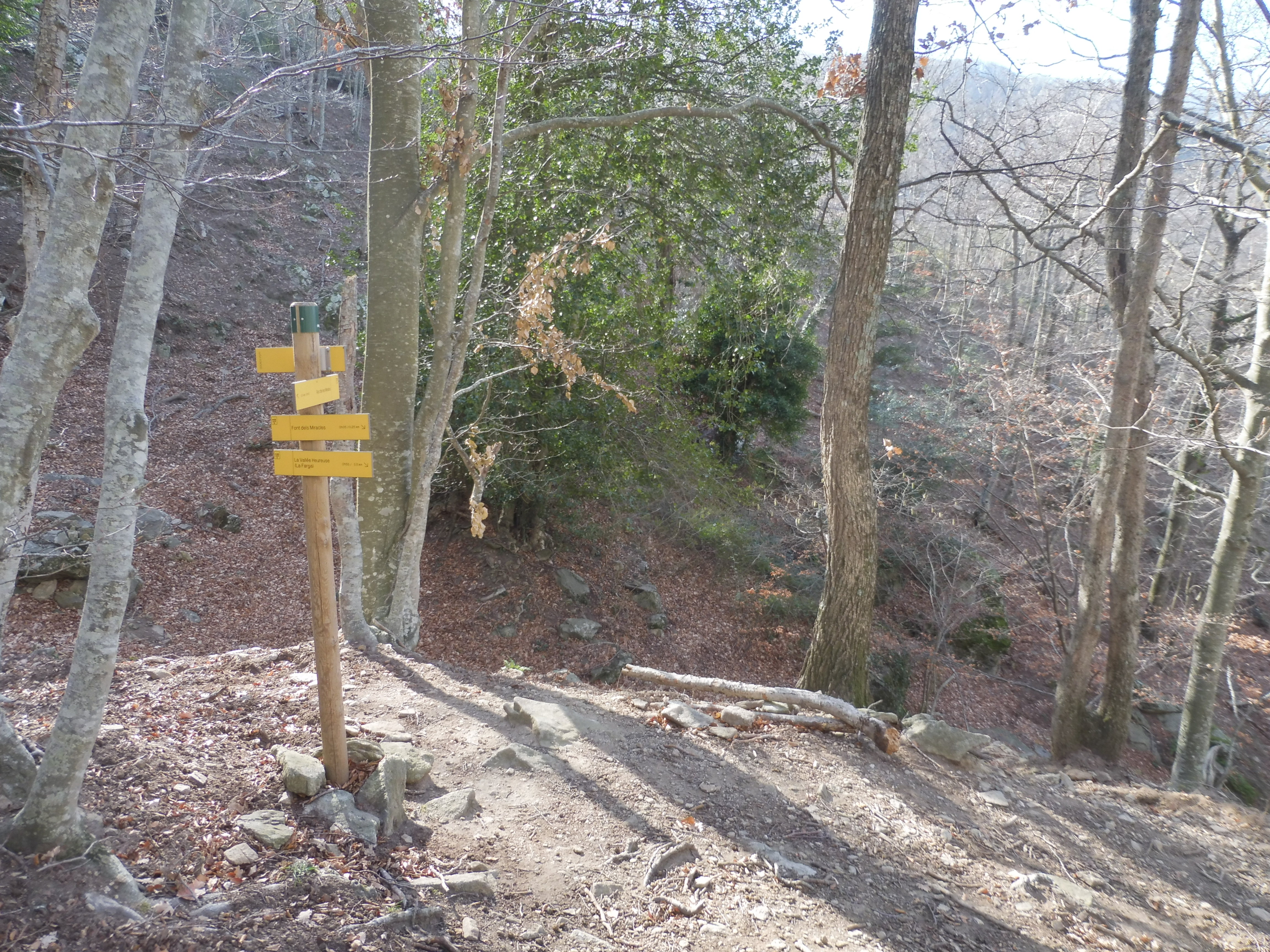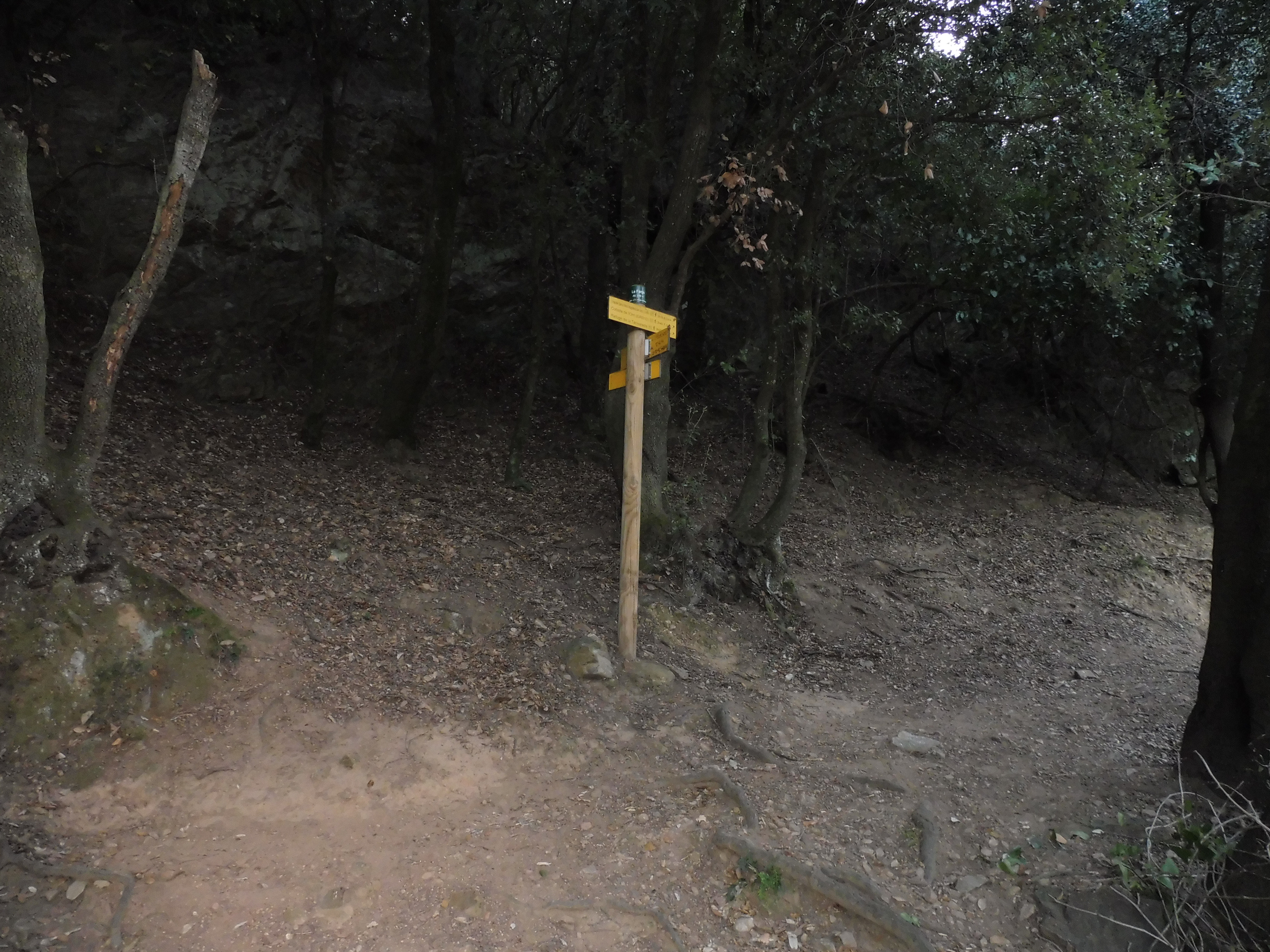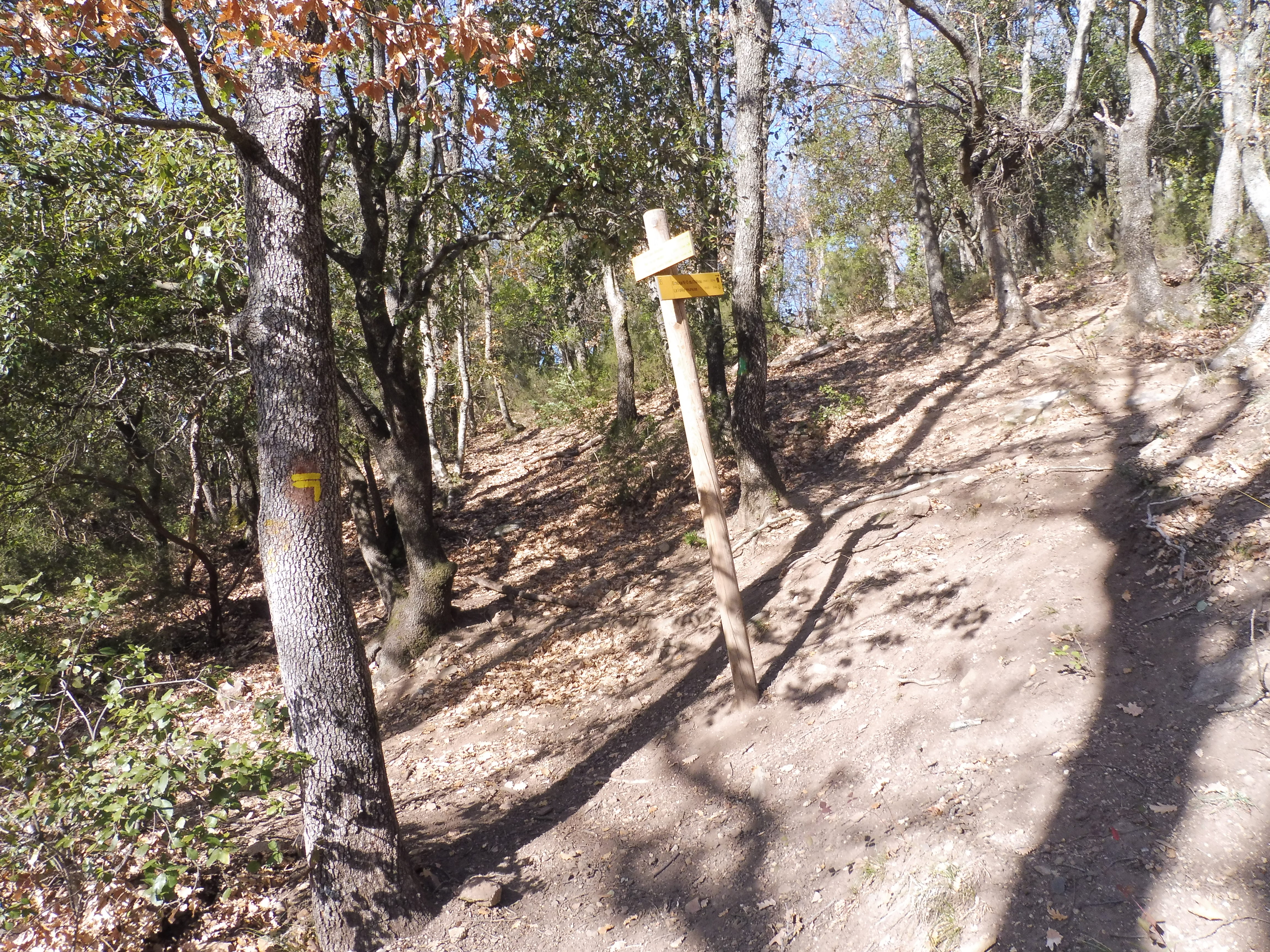 A ce croisement marqué par la présence d'un panneau directionnel (500 mètres après le Coll dels Tres Faigs), suivre le chemin partant sur la gauche direction Coll de l'Aranyó, balisé en jaune