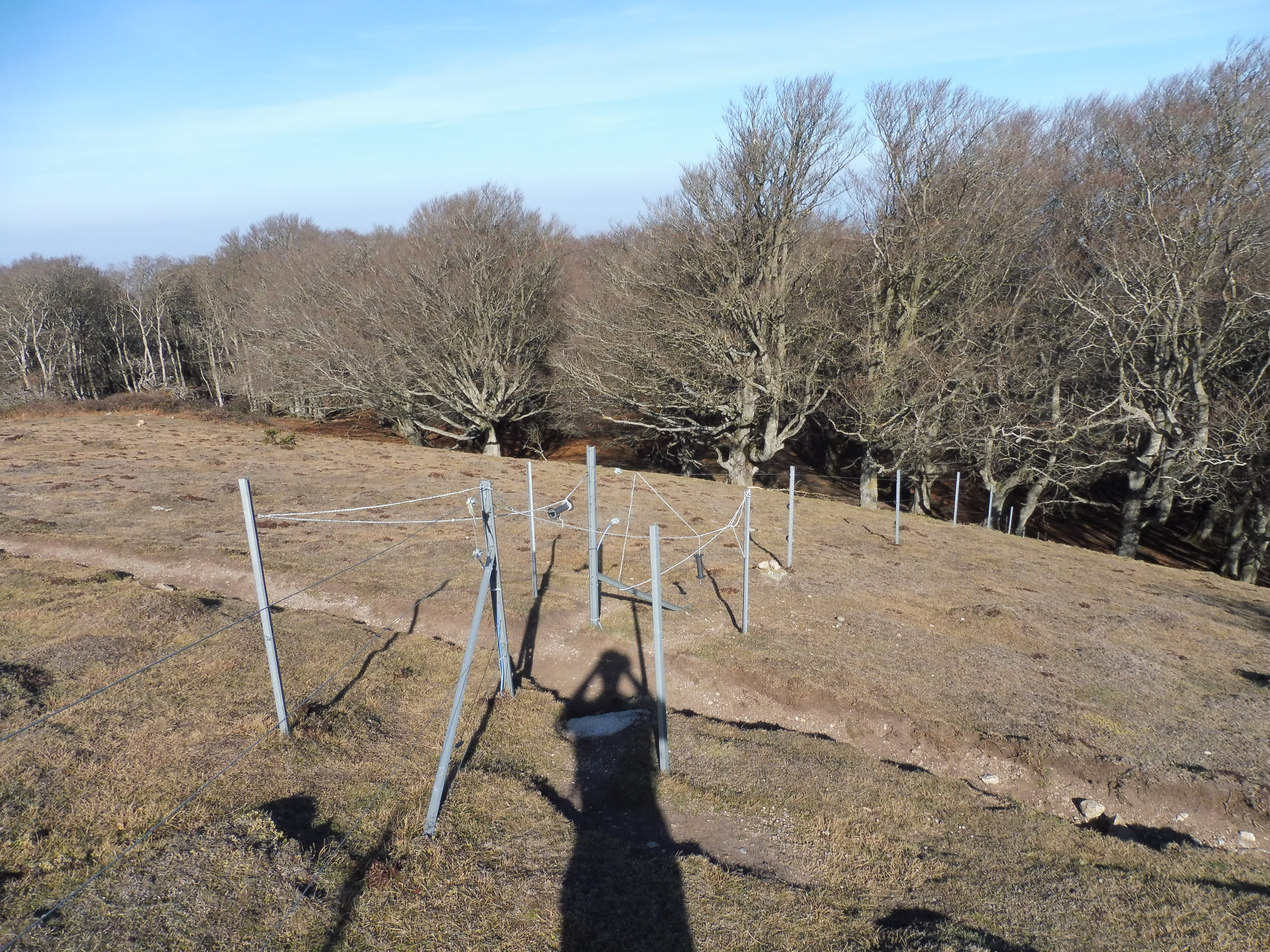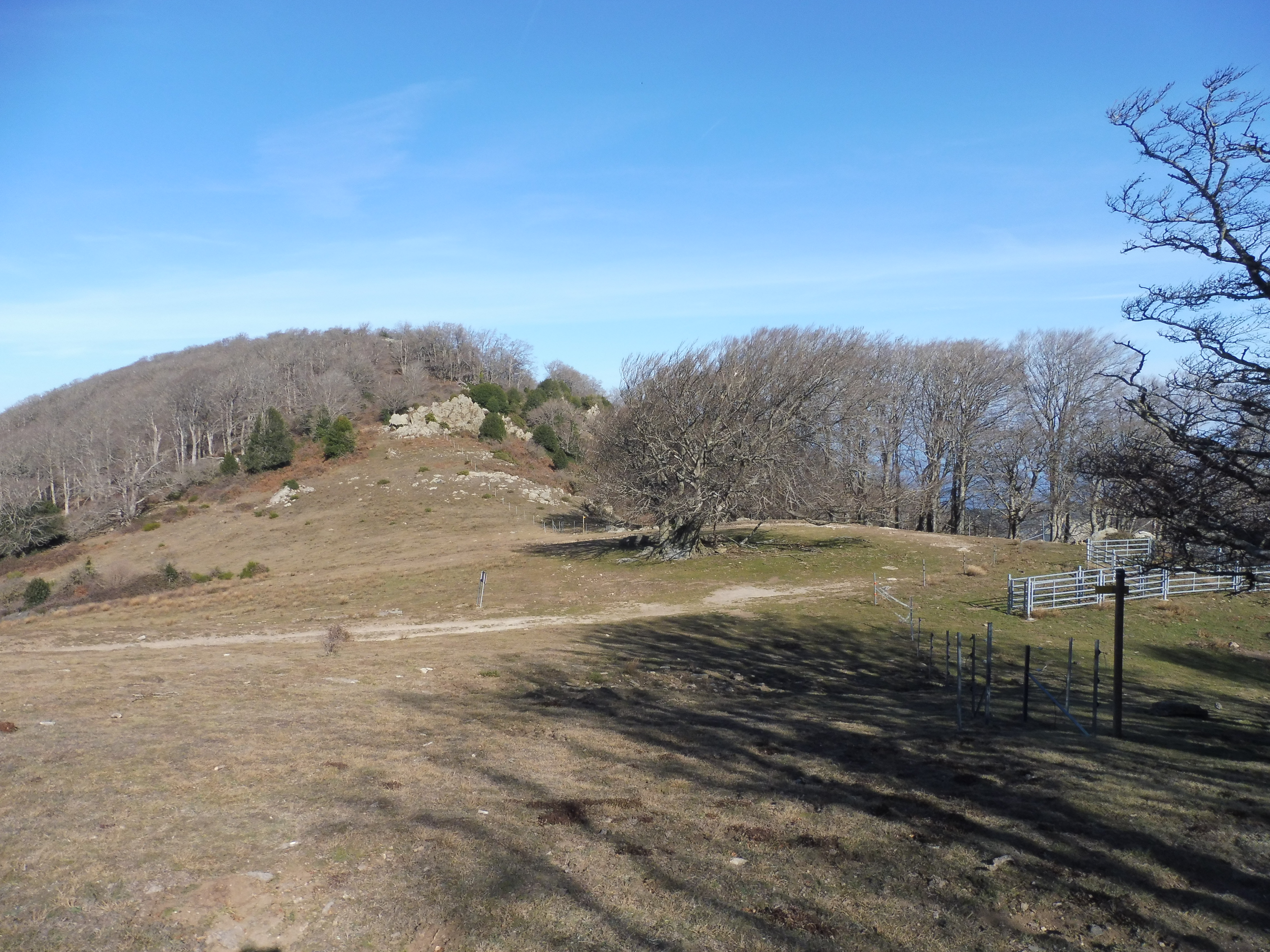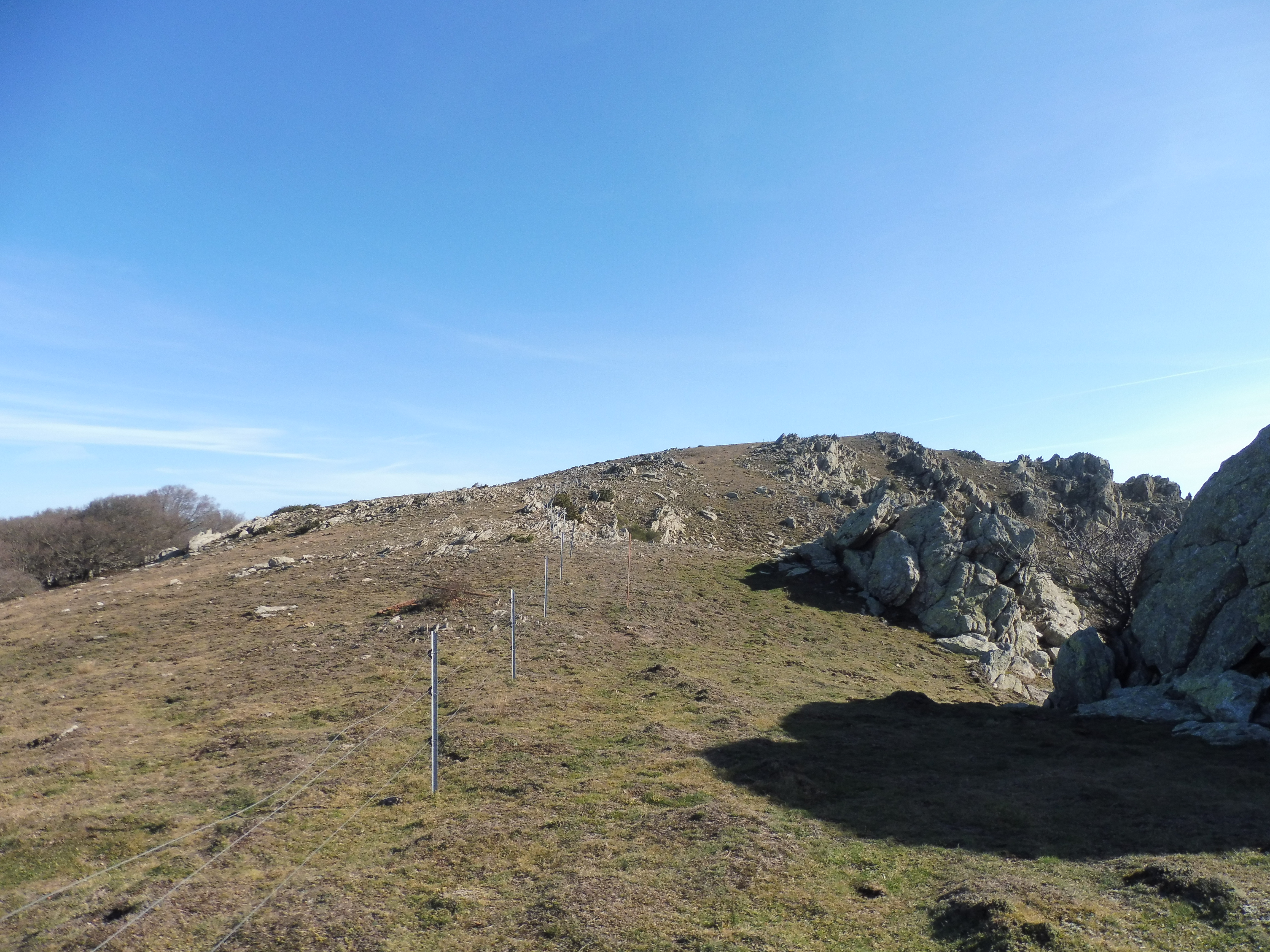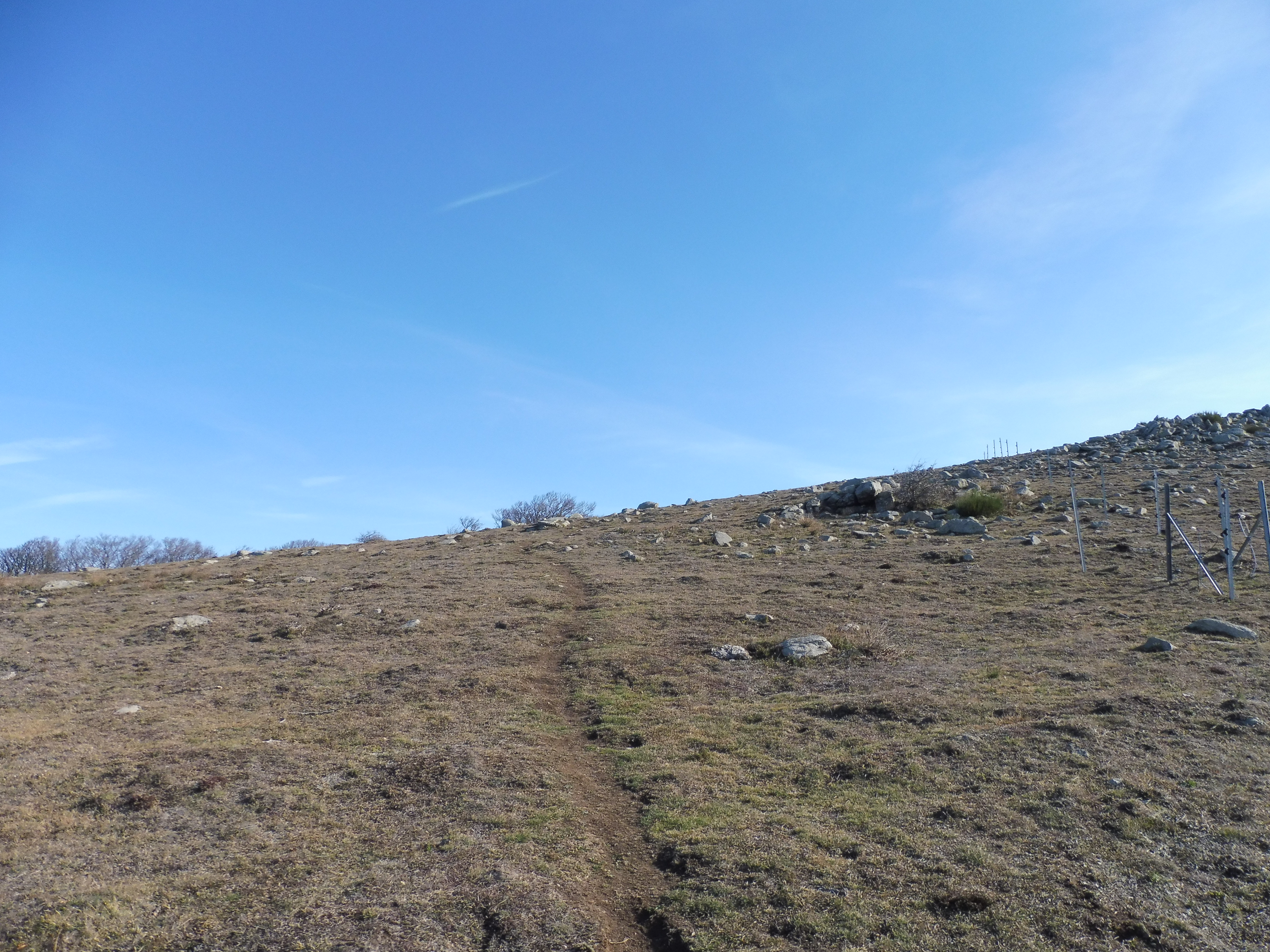 Coll de l'Estaca (1025 m) : suivre le chemin mal tracé partant tout droit et longeant au plus près la clôture direction Puig dels Pradets (montée raide jusqu'au sommet)